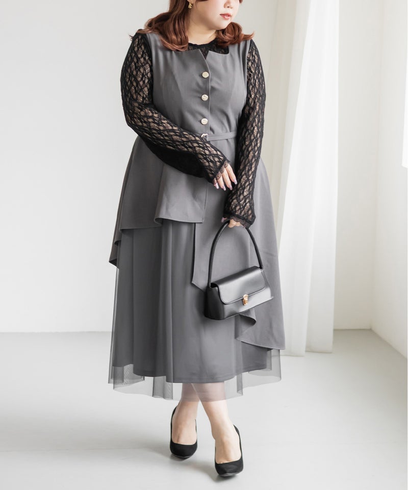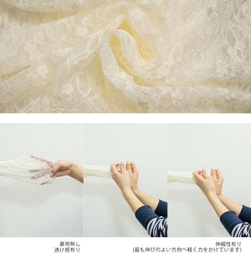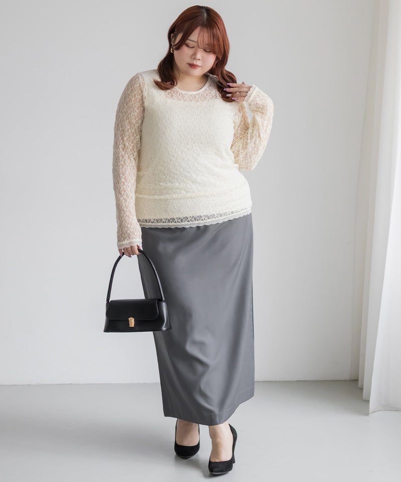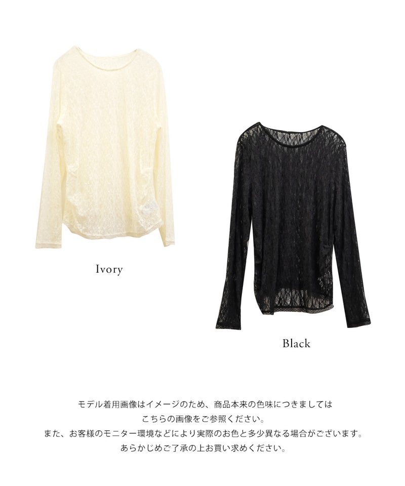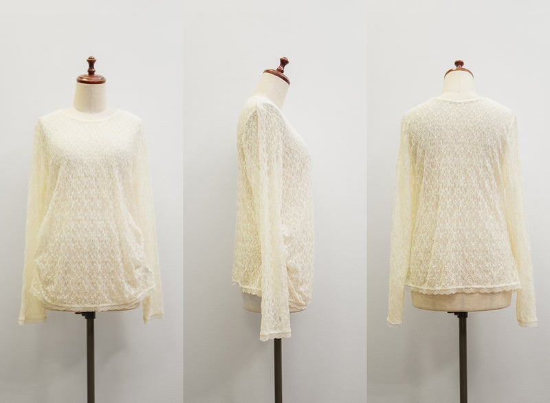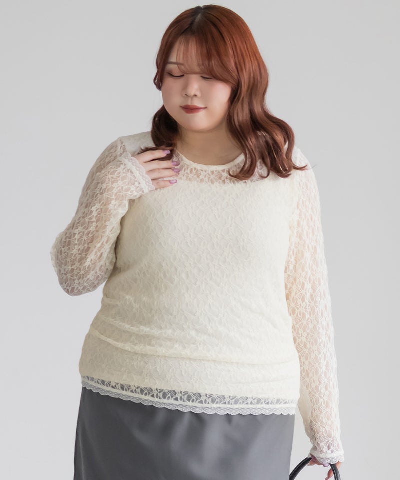 3Lサイズを着用しました。身頃や腕まわりに程よくフィットし、全体的にちょうどいい着心地でした。ストレッチの効いたシアーレース素材で動きやすく、軽やかな着心地なのが嬉しいポイントです♪ 繊細なレースの透け感が女性らしく、1枚でもレイヤードでも華やかな印象に仕上がりました。