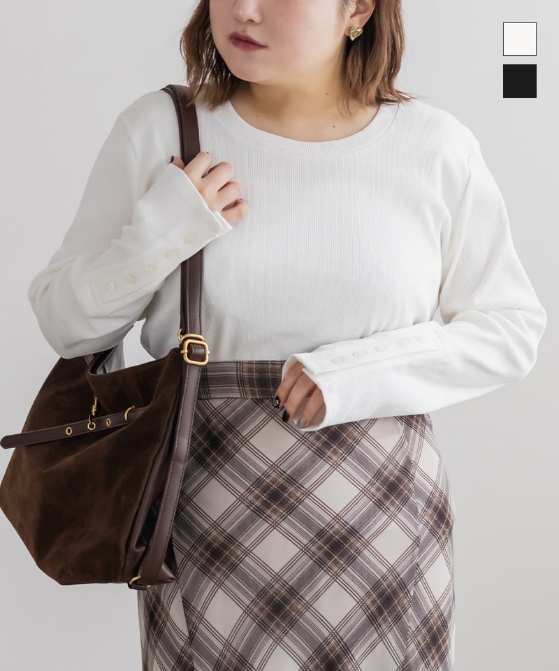 3Lサイズを着用して少しゆとりのあるサイズ感でした。伸縮性の良いカットソー着心地ラクチンでした◎リブなのですっきりとした印象ながらボディラインを拾いにくいのもポイントです。袖にボタンがついていてとっても可愛いです♪トップスとして1枚で着てもいいし、キャミワンピなどど重ねてもいいと思います!
