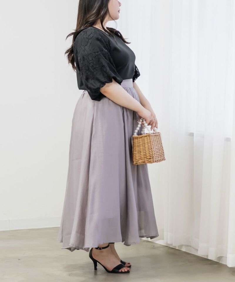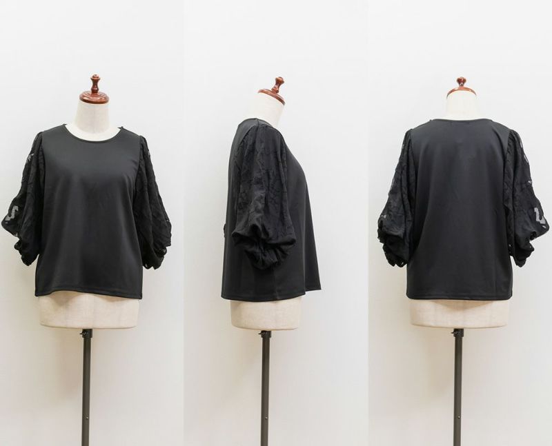3Lサイズを着用しました。締め付け感のないちょうどいい着心地でした◎ 袖の花柄ジャガードが上品で華やかさをプラスしてくれるので、これ1枚でシンプルながらコーデが華やぐ印象に♪ 身頃は軽い無地カットソー素材で伸縮性があり、動きやすさも抜群です。着丈も長すぎず短すぎずで、スカートにもパンツにも合わせやすく、オンオフ問わず使える万能トップスです!