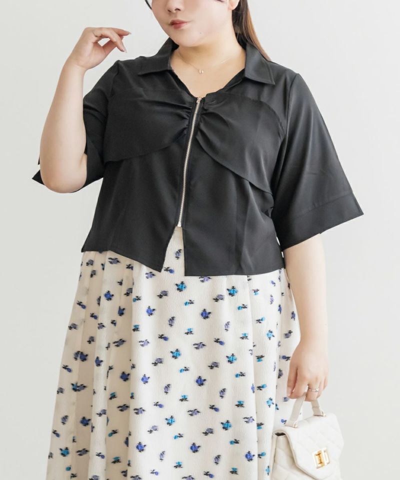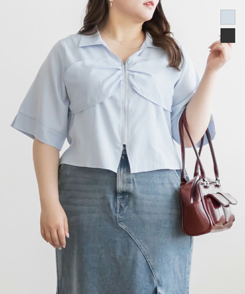 フロントジップ シャツ クレット プラスサイズ 大きいサイズ 3L 4L 半袖 春夏 フロントジップシャツ