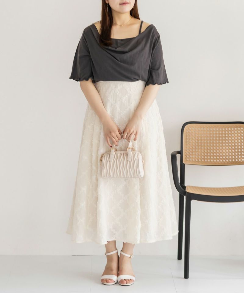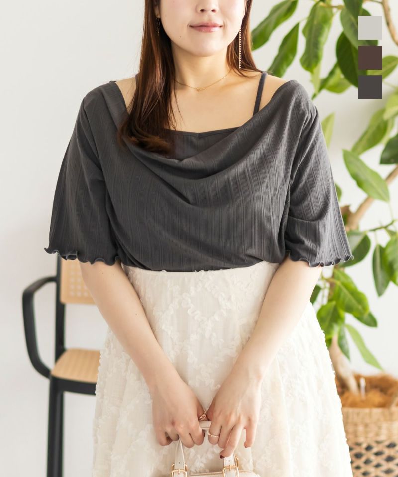 3Lサイズを着用して、身幅も袖まわりも程よくゆとりがあり、ちょうどいいサイズ感でした! 柔らかく軽いリブ素材がリラックス感たっぷりで、程よくゆとりのあるシルエットなので体のラインを拾いにくく、さっと着るだけでサマになります♪ キャミをレイヤードしたようなデザインで、インナーを気にせずに着用出来て、1枚でお洒落な雰囲気を楽しめるのも嬉しいポイント!タックインしなくても可愛いメローっぽい裾になっているので、パンツとの相性も抜群!1枚で大人っぽくこなれ感があるのに、夏にピッタリな着やすい素材でたくさん着ていきたいアイテムです◎