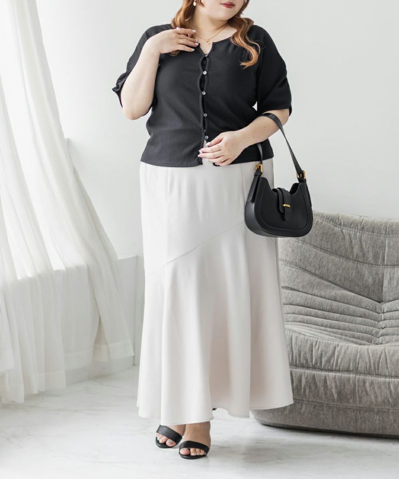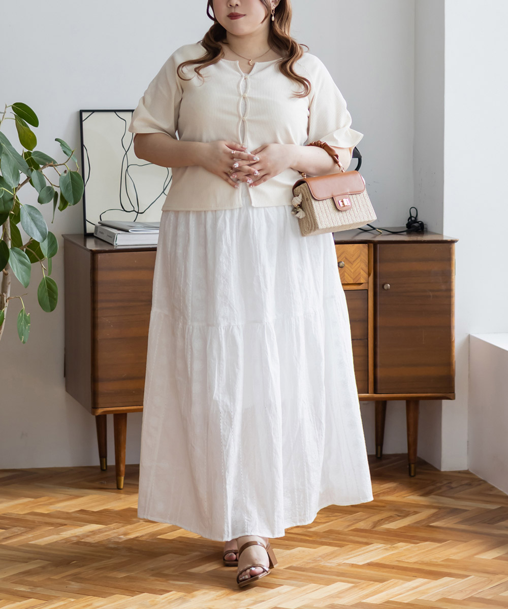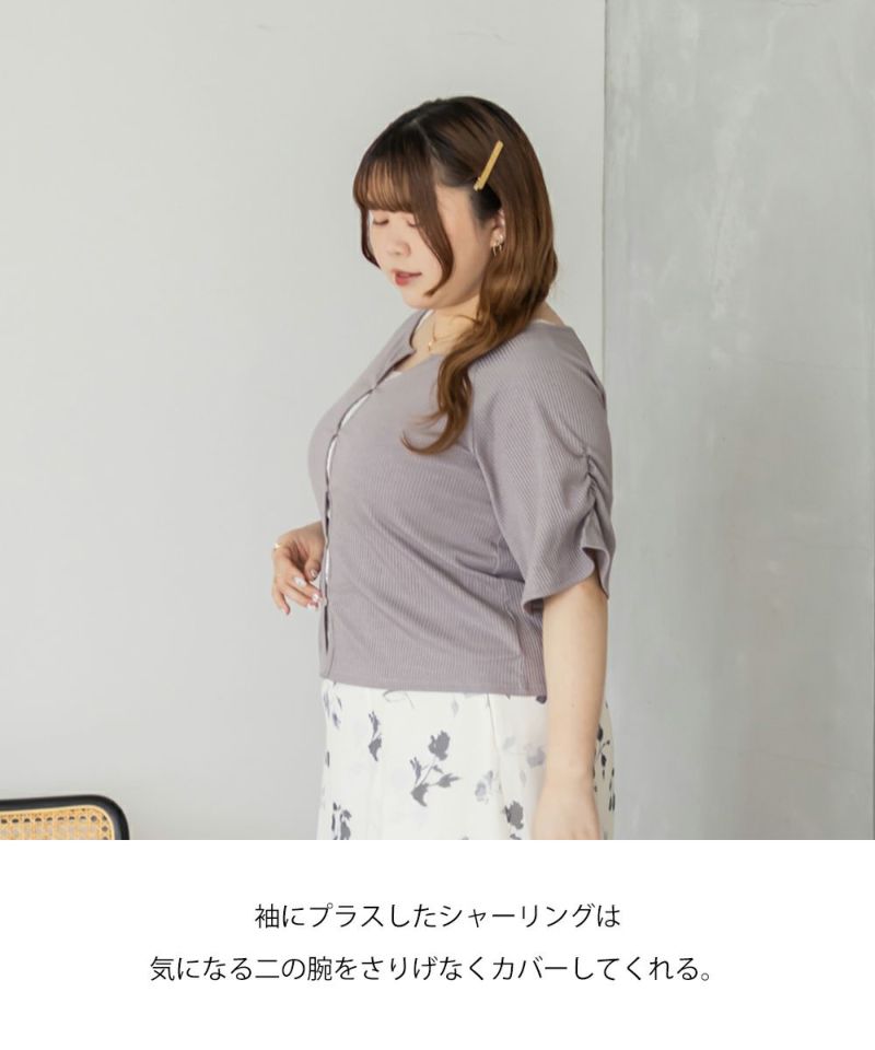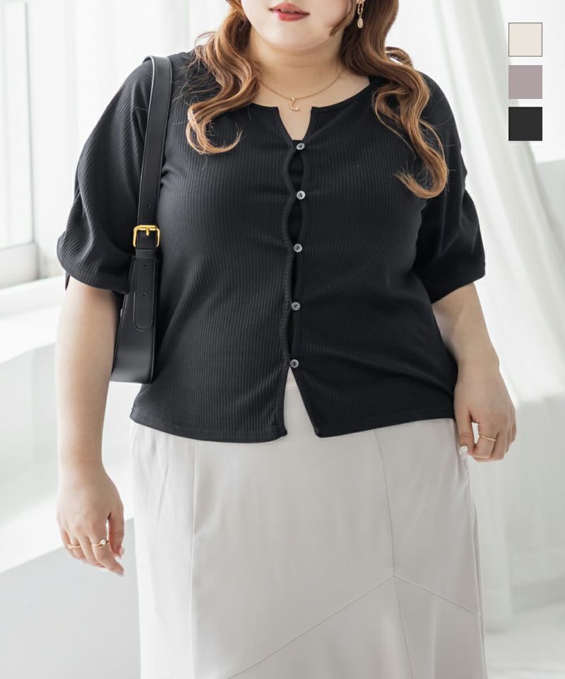 3Lを着て丁度良いサイズ感でした。程よくゆとりを持って着られるサイズ感で、締めつけ感もなく快適な着心地です。デコルテがすっきり開いたネックラインで、シンプルながらも着映えする1枚です!カットソー素材で伸縮性もあり、動きやすくてストレスフリーなのもうれしい◎さらっとしたリブ素材なので真夏でも過ごしやすいと思います♪スカートにもパンツにも合わせやすい丈感で、デイリーに活躍してくれそうです!前は開く仕様になっていて着脱も楽だし、羽織としても使えそうです!シンプルなボトムでも、デニムでも合わせやすくTシャツ感覚で着られる1枚です。