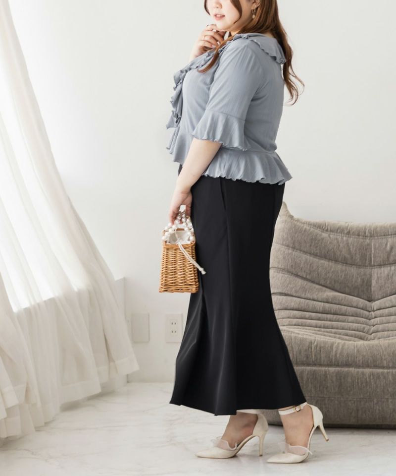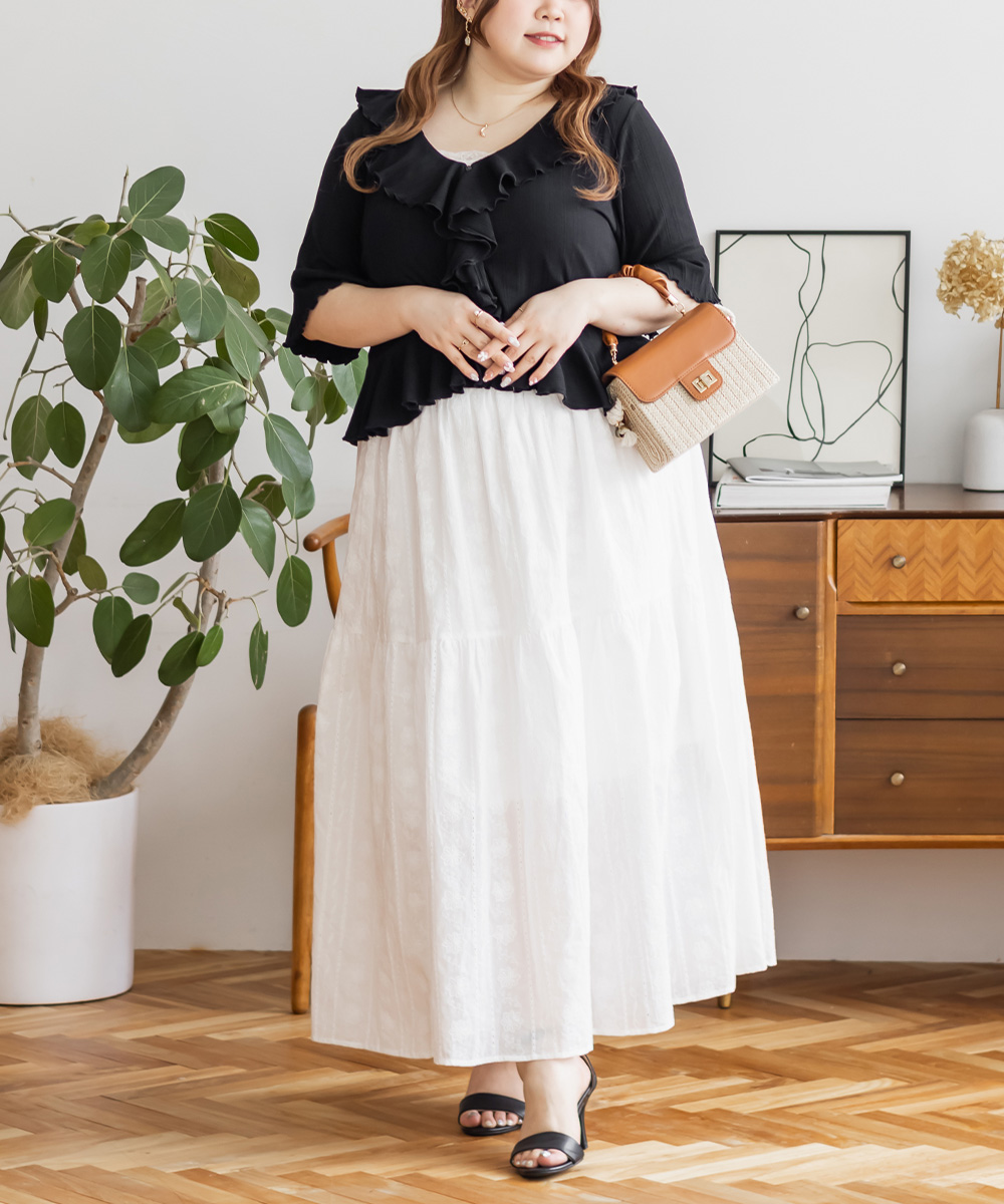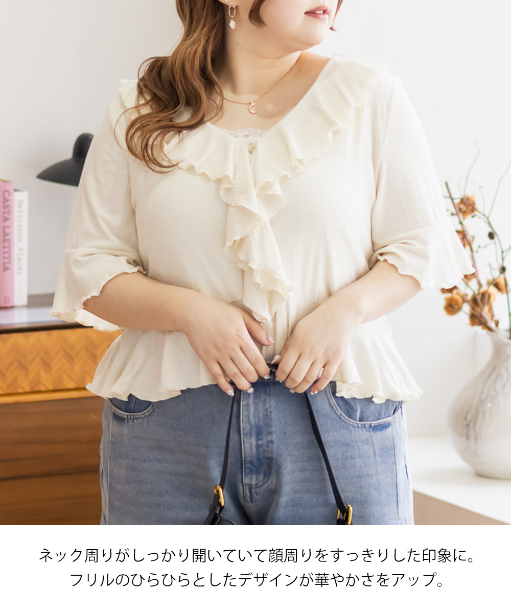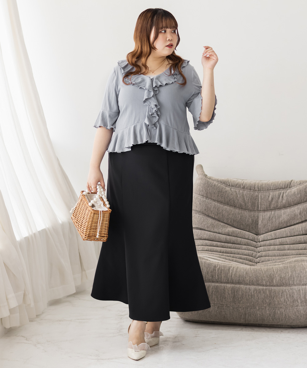 3Lを着て、窮屈感無く、いつも通りのサイズ感で着用出来ました。ランダムリブ素材で伸縮性があって、身体に程よくフィットしてくれる着心地でした◎フリルのデザインが甘すぎず、さりげなくフェミニン感をプラスしてくれるので、大人可愛いコーデにもぴったりです♪締め付け感がなく、動きやすさもあって、可愛いのに着心地抜群です!インして着ないデザインで、丈感がちょうどよく着回ししやすくてボトムを選ばずに着られる万能トップスです!