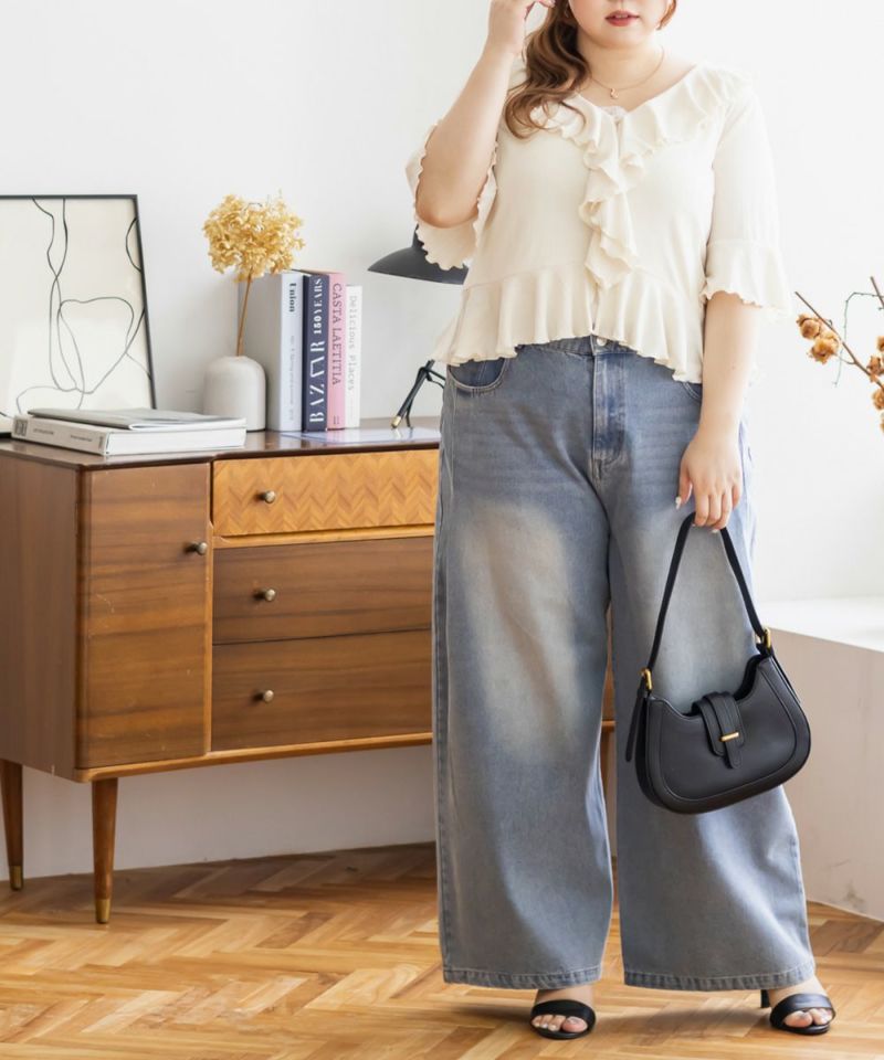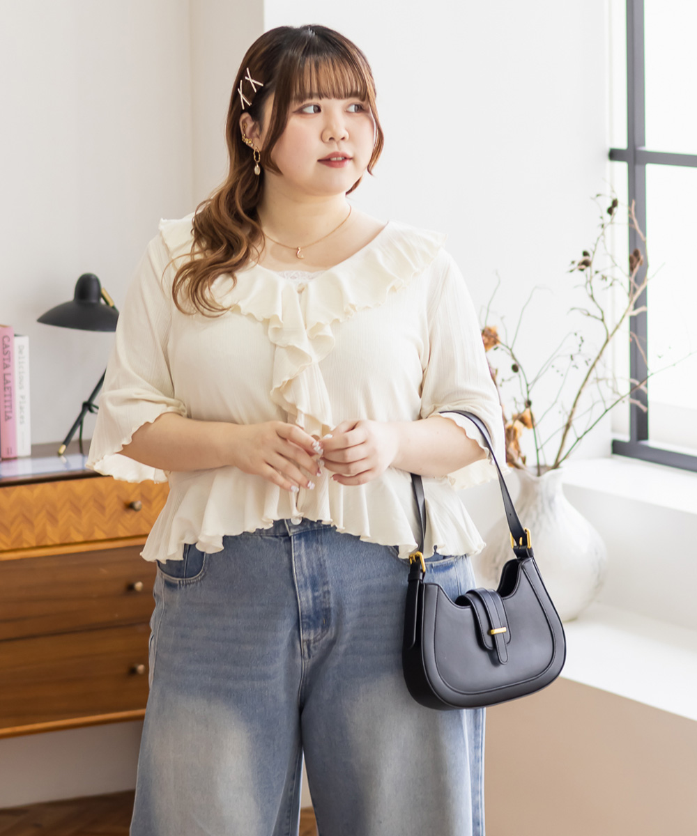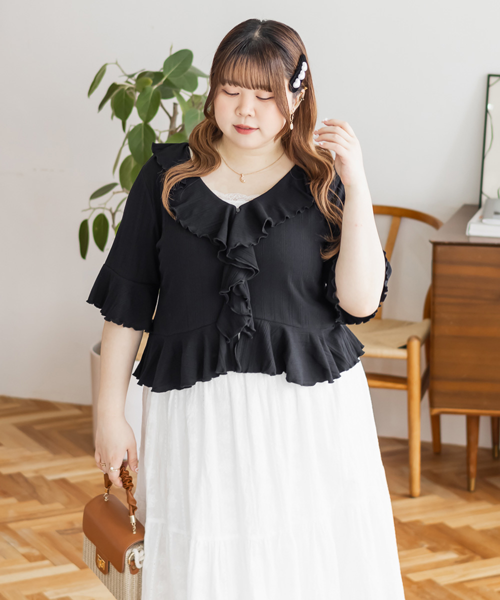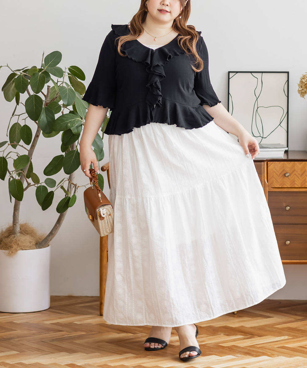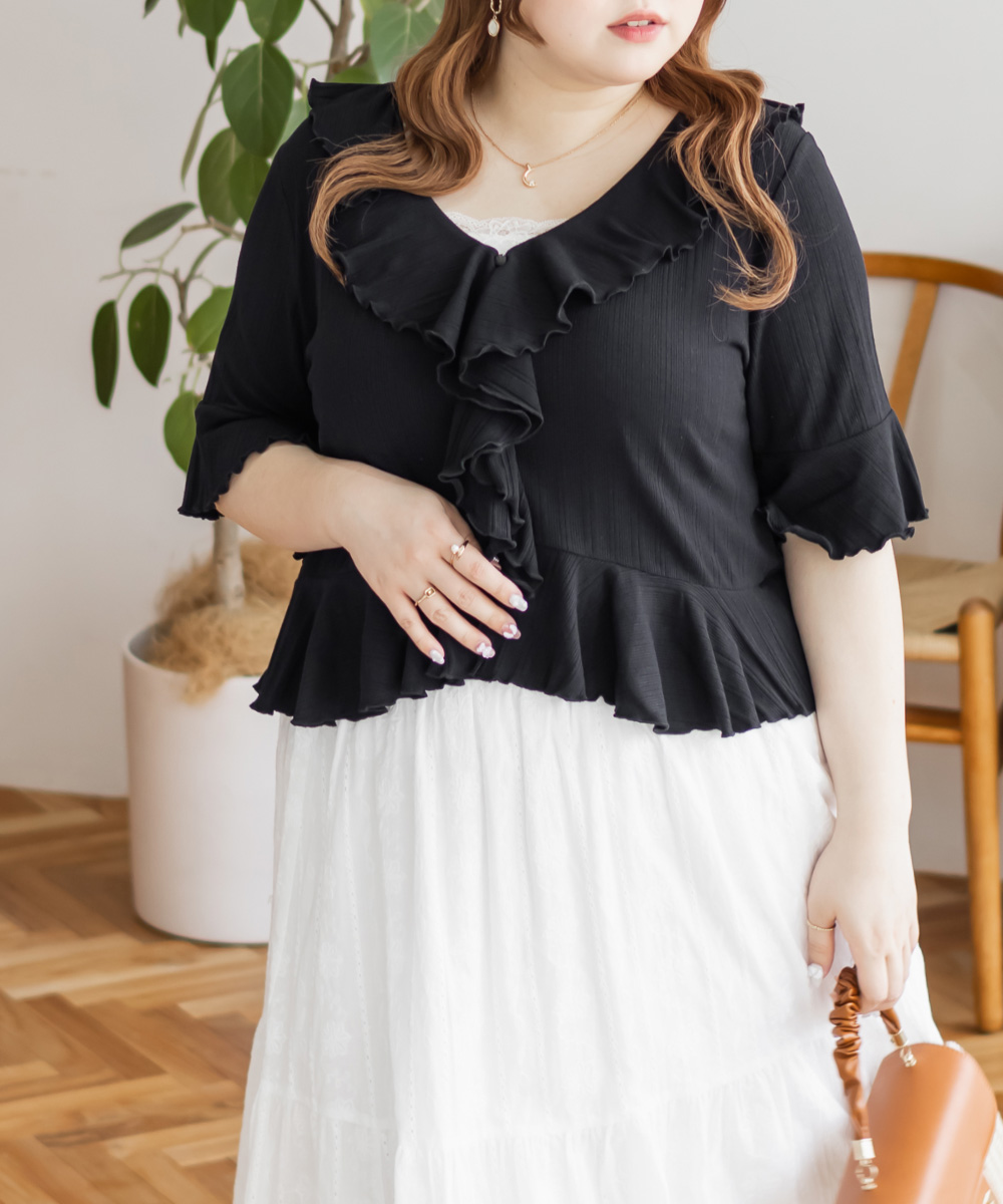 3Lを着て、窮屈感無く、いつも通りのサイズ感で着用出来ました。ランダムリブ素材で伸縮性があって、身体に程よくフィットしてくれる着心地でした◎フリルのデザインが甘すぎず、さりげなくフェミニン感をプラスしてくれるので、大人可愛いコーデにもぴったりです♪締め付け感がなく、動きやすさもあって、可愛いのに着心地抜群です!インして着ないデザインで、丈感がちょうどよく着回ししやすくてボトムを選ばずに着られる万能トップスです!