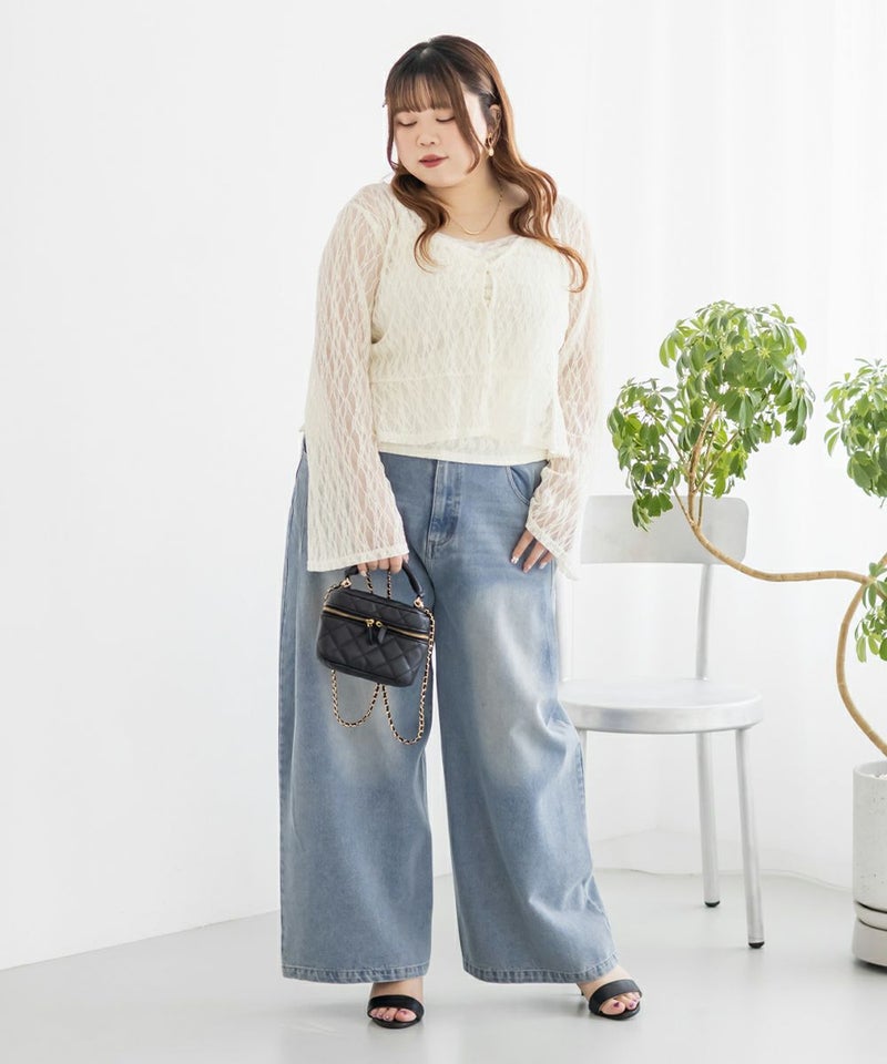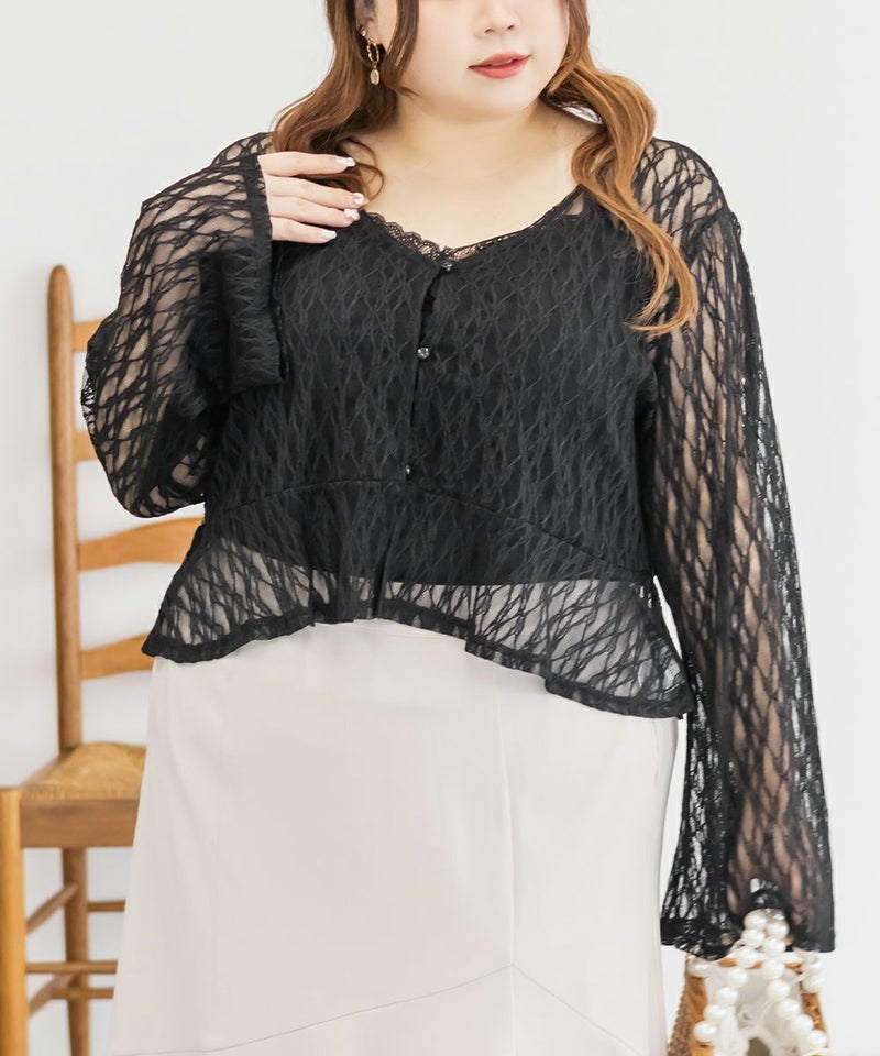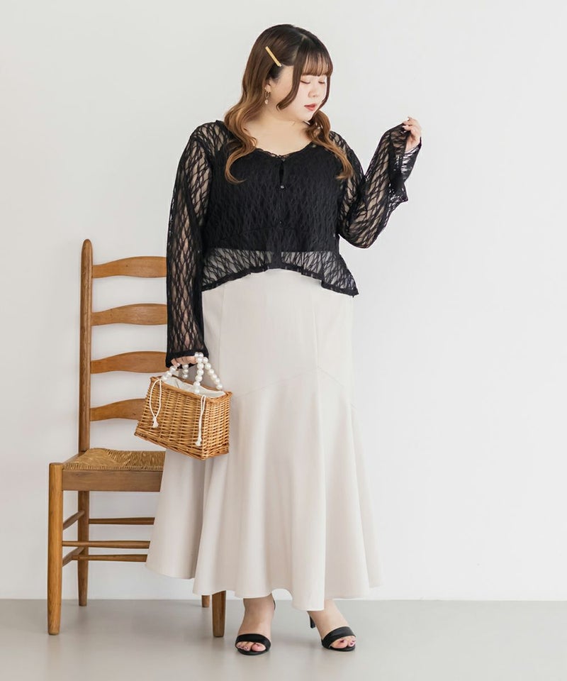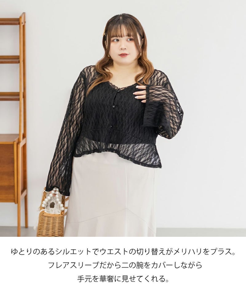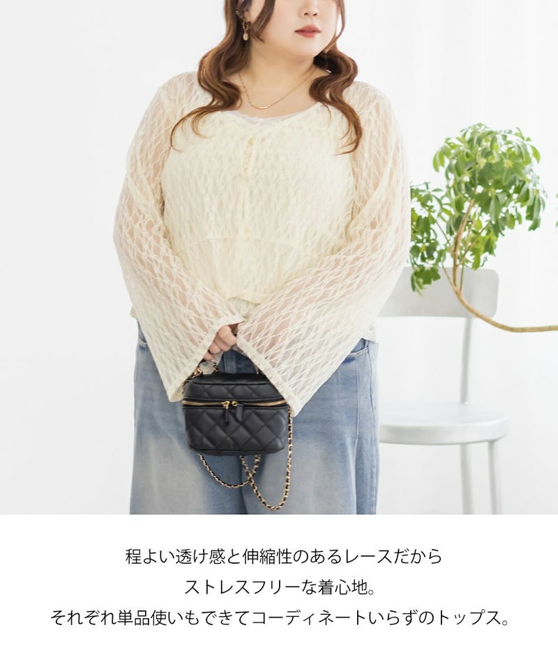 3Lサイズを着用して、身頃も腕まわりも窮屈感なくちょうどいい着心地でした◎さらっと涼しい肌あたりで、インナー付きなのもうれしいポイントです♪インナーには肌触りの良いカットソーの裏地がついているのもポイントです!透け感が上品で、カジュアルにもきれいめにも合わせやすく、一枚で華やかさを演出できる万能トップスです。気になる肩まわりもふんわりカバーしてくれるので、体型カバーを意識したい日にもぴったりでした♪長袖なので長いシーズン着まわせるのであると便利なアンサンブルです!