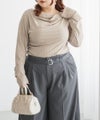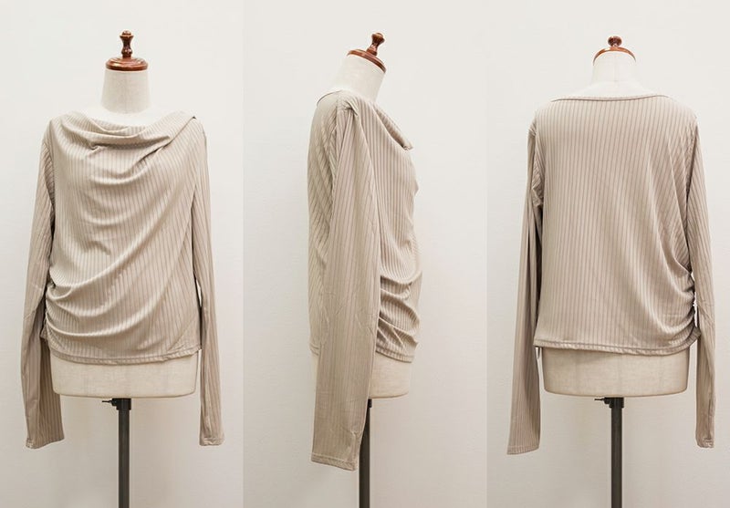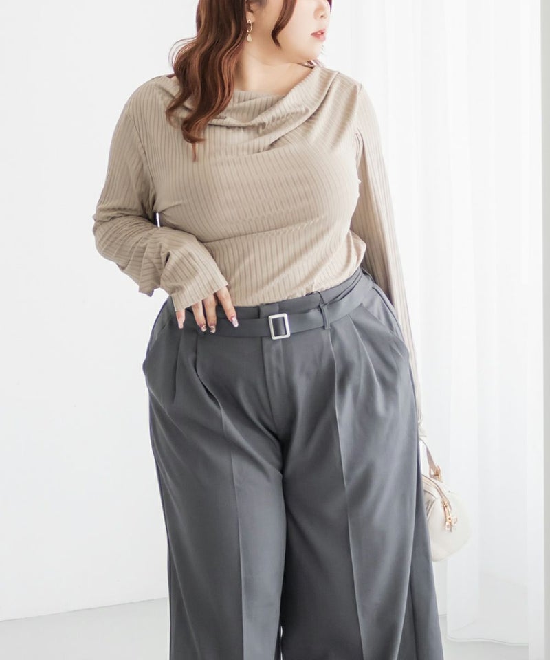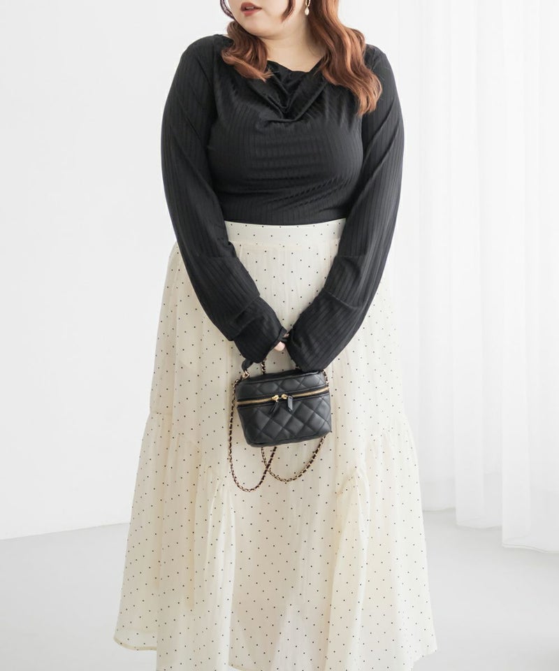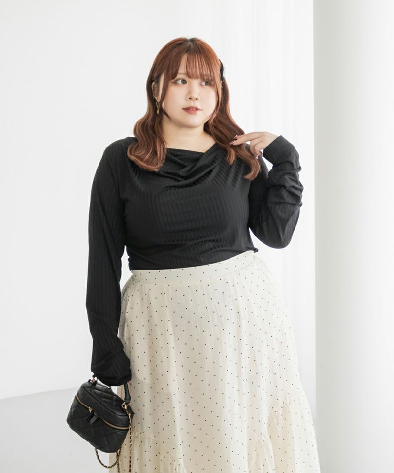 3Lサイズを着用して、ちょうどいいサイズ感でした。ワイドリブ生地なのでボディラインを拾いづらく、華奢見せ&女性らしさをプラスする印象でした!顔周りをスッキリ見せるドレープがシンプルながら女性らしいデザインで、こなれ感プラスして1枚で大人っぽい洗練された雰囲気になれます♪伸縮性の良い素材感とシンプルなカラー展開で、合わせるアイテムを選ばないのもうれしいポイントです!トレンド感あるトップスなので1枚持っておきたいです!