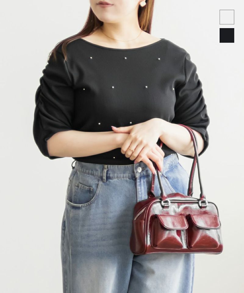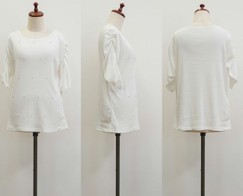 3Lサイズを着用して、フィット感もちょうどよく、リブ素材で程よく身体に馴染んでくれる着心地です。パワショルのデザインでさりげなく肩にボリュームが出るので、華奢見えするのが嬉しいポイント◎二の腕もすっきり見える絶妙なシルエットです。ビーズのアクセントがさりげなく華やかで、シンプルながらもおしゃれ感のある一枚。きれいめにもカジュアルにも使えるので、デイリーに着回せるアイテムです。