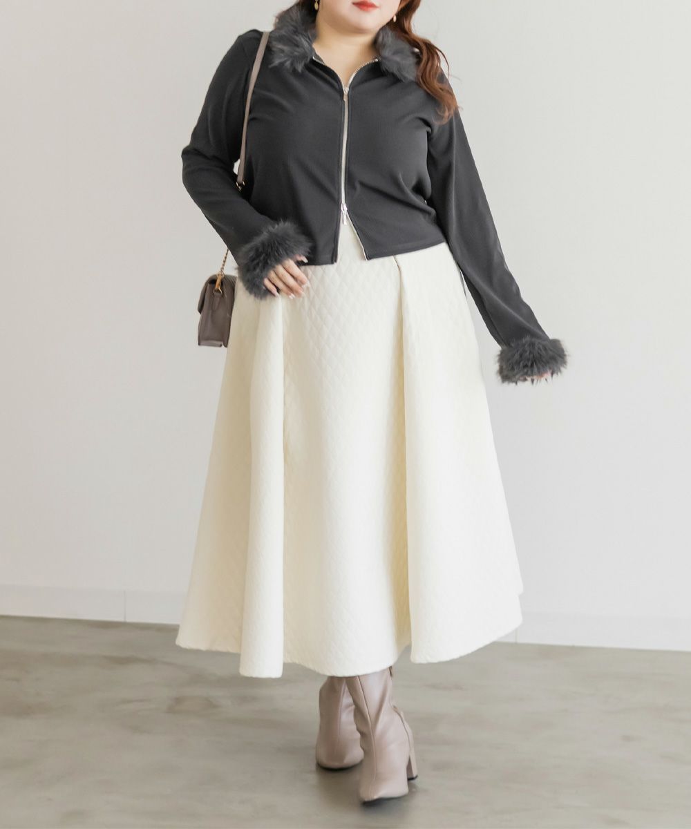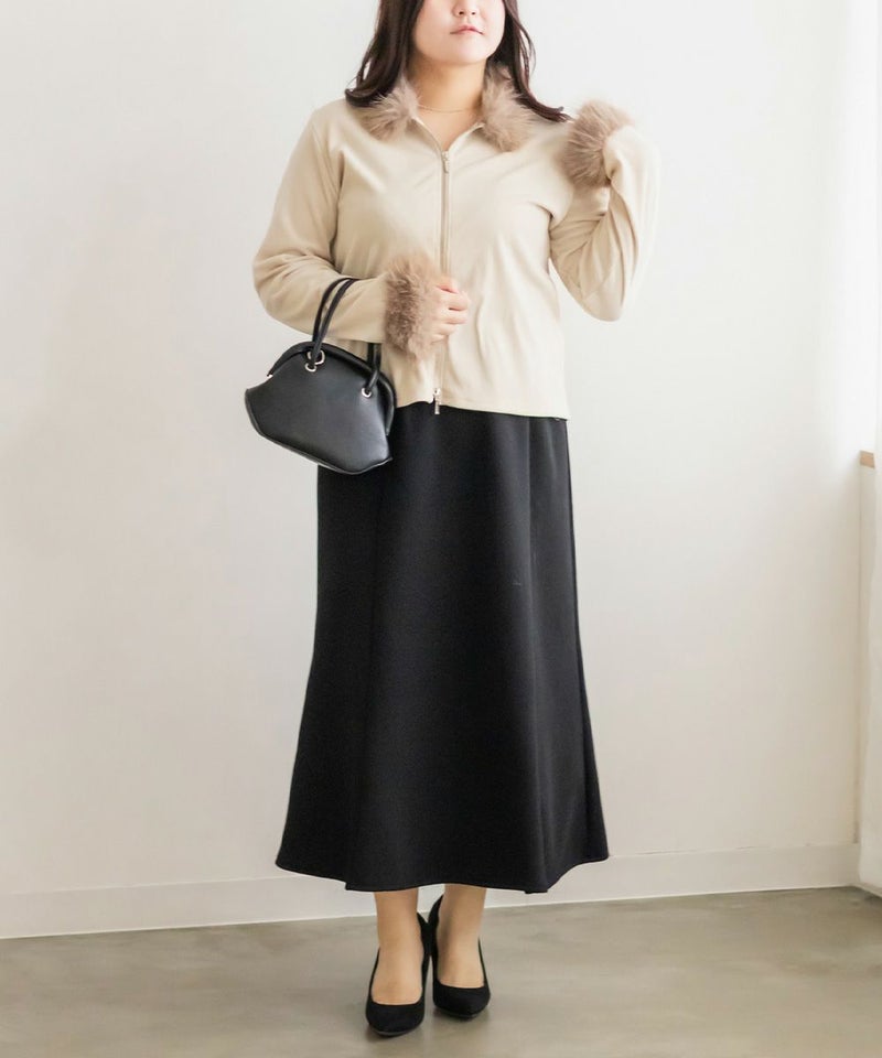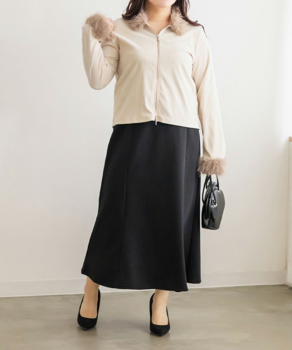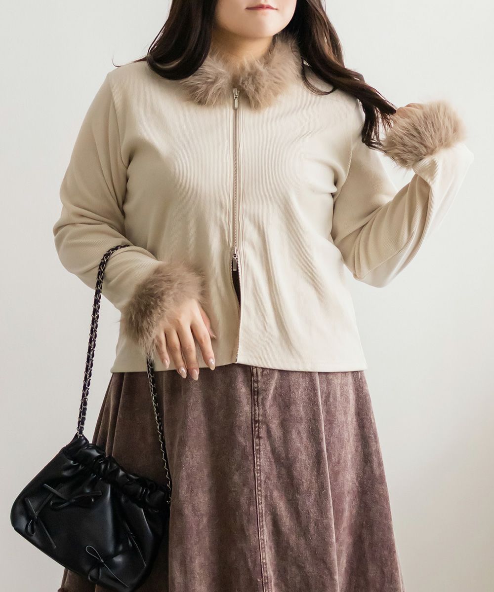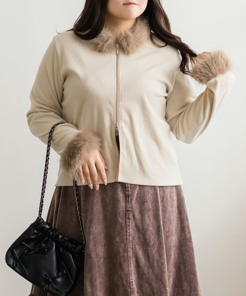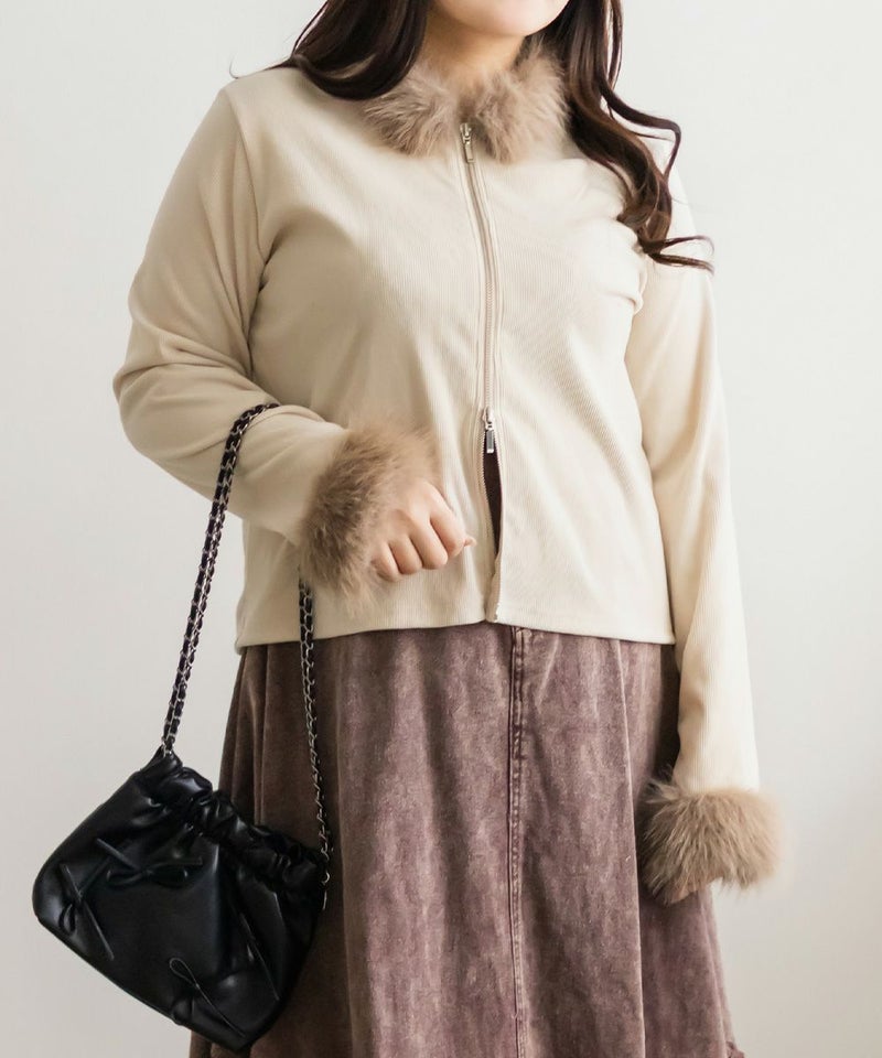 3Lサイズを着用してちょうどいいサイズ感でした。ダブルジップなので首元と裾は好きな空き具合で着用出来ます◎伸縮性があるリブカットソー生地で、程よくハリがあってボディラインも拾いづらいです!程よく短丈ですっきりとコンパクトな印象に着られて今っぽいシルエットが可愛いです♪襟と袖にファーがついていてアクセントになってフェミニンに着こなせます!スカートはもちろん、デニムパンツや、ワンピースに羽織っても良さそうです!
