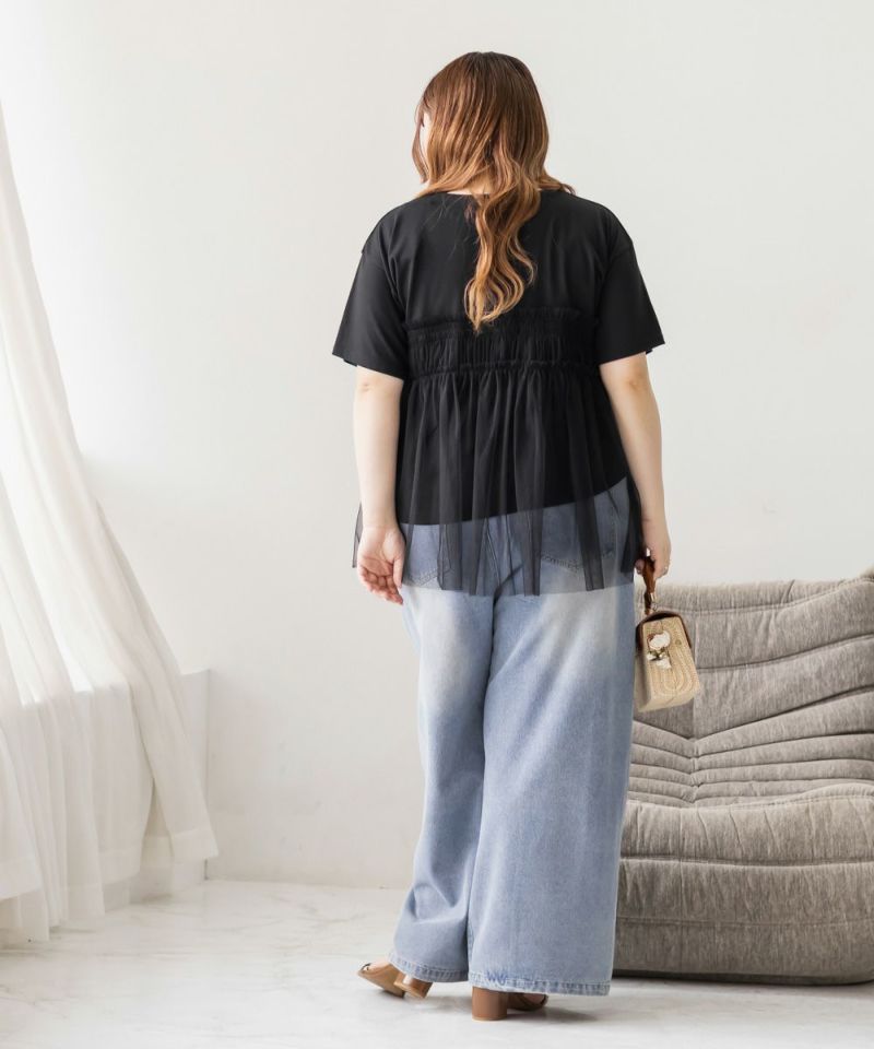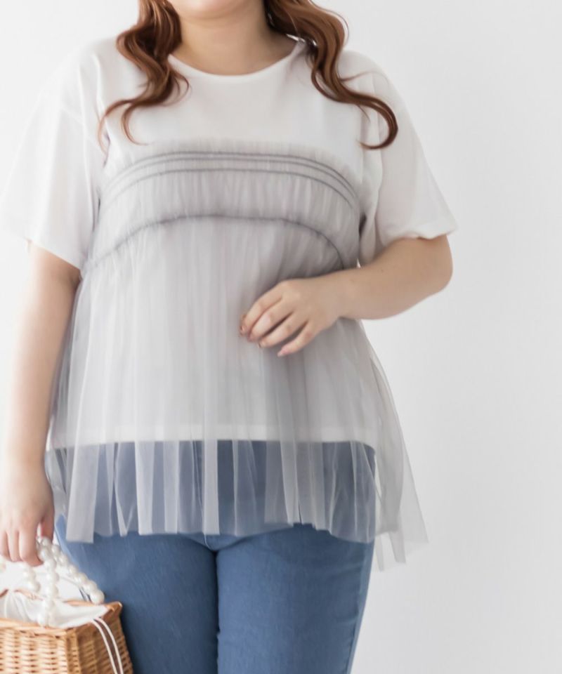 チュール ドッキング カットソー ギャザー フリル Tシャツ 大きいサイズ プラスサイズ クレット 3L 4L チュールドッキングカットソー
