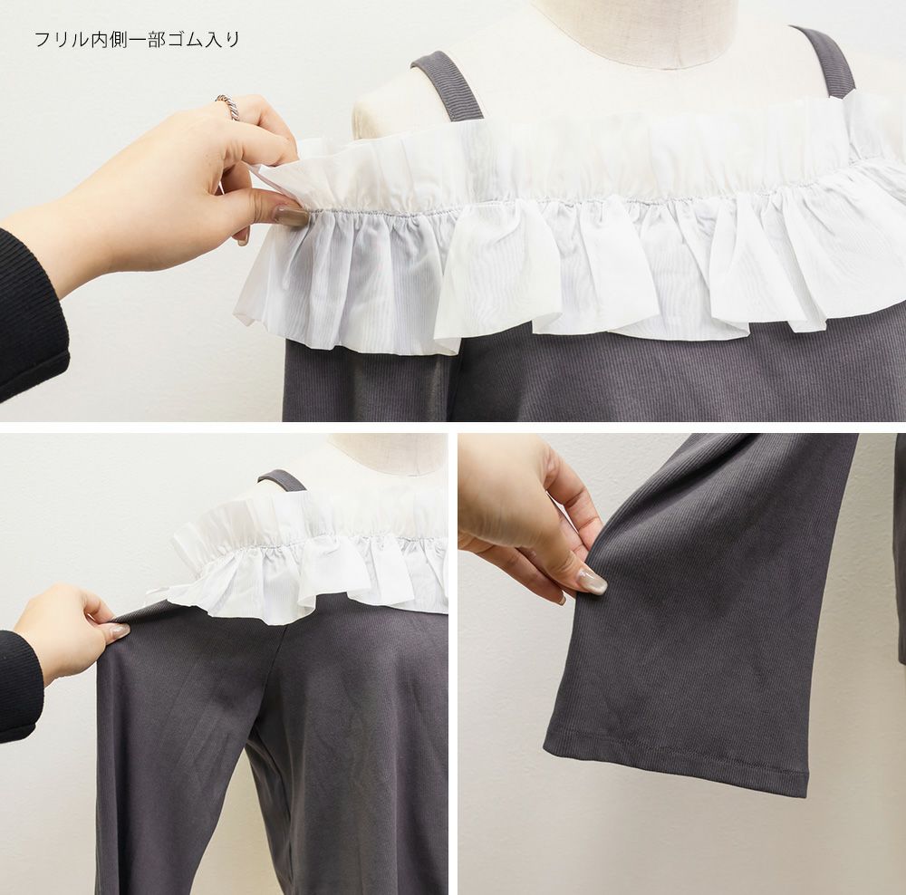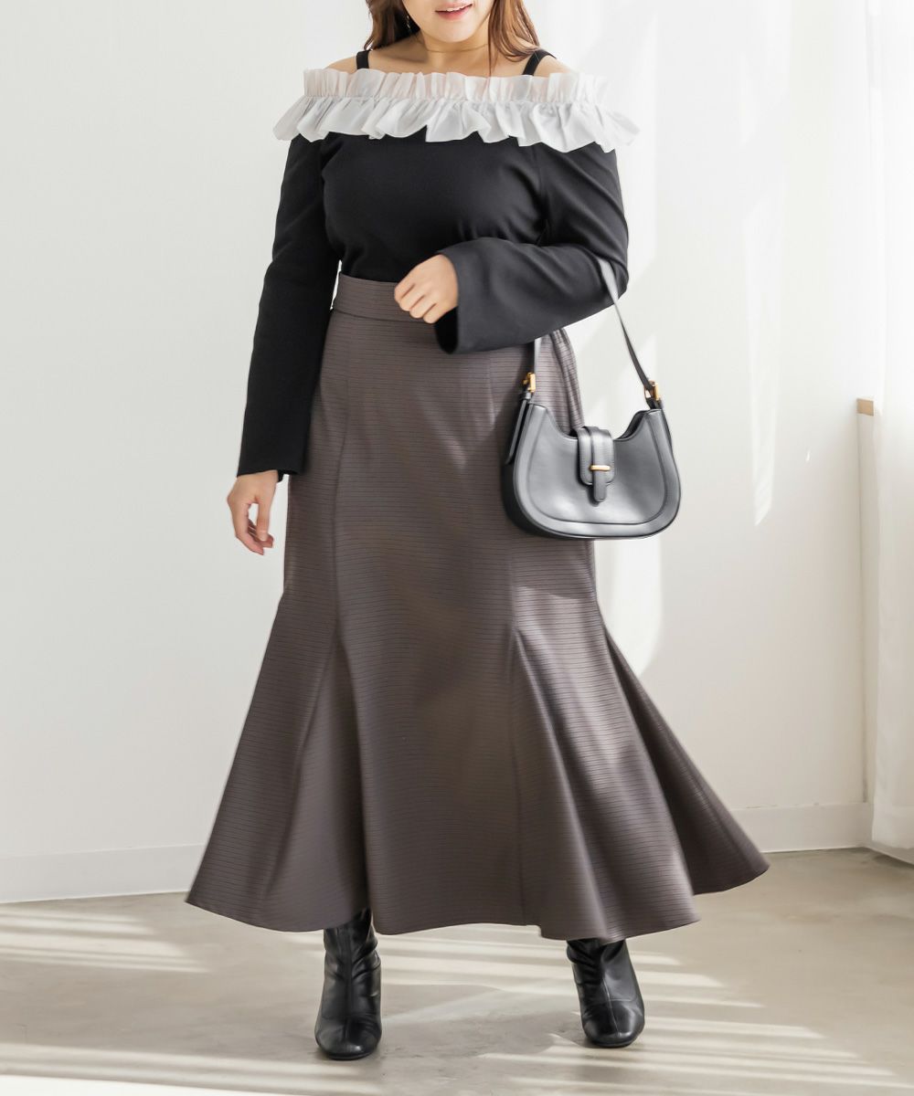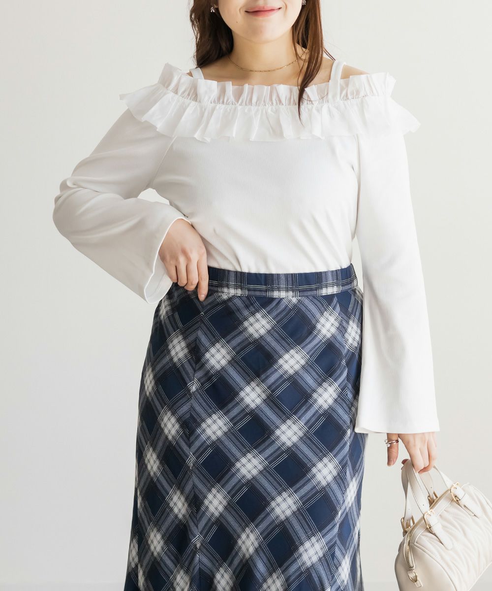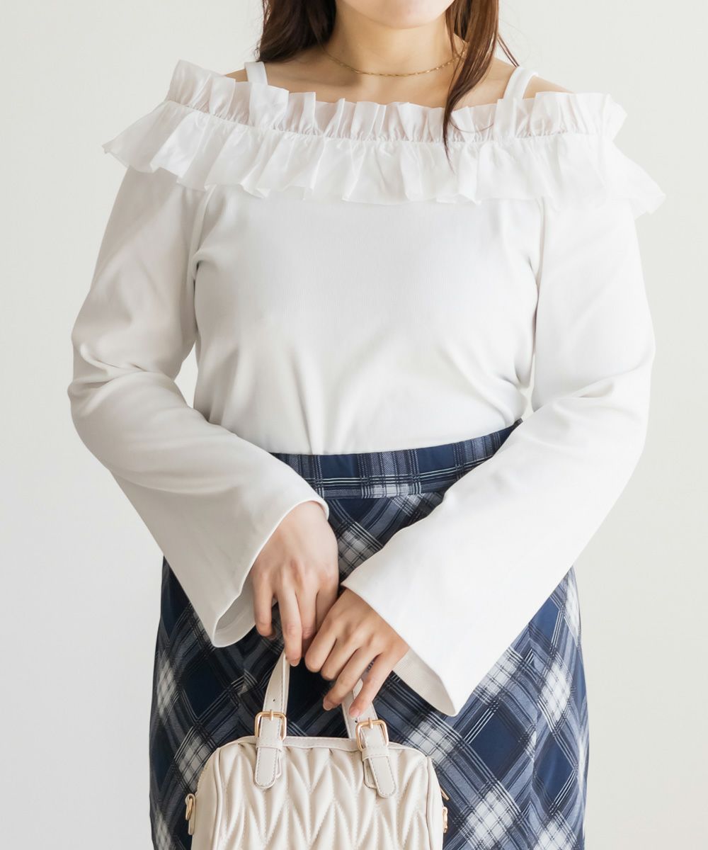 3Lを着用してちょうどいいサイズ感でした。程よく薄手のカットソーで伸びもあってとても楽に着られました!デコルテがすっきりと開きながら、下着の肩紐が見えないようなデザインになっているのがポイントでインナーに困らないのが嬉しいです。女性らしい肌見せが叶う1着です◎胸元のフリルはフェミニンさとメリハリをプラスしてくれて、とってもかわいいです♪袖先は少しフレアに広がっていて手元もおしゃれで可愛いです。丈はタックインせずに着られるのでパンツともスカートも相性のいいので、1枚持っておきたいトップスです!