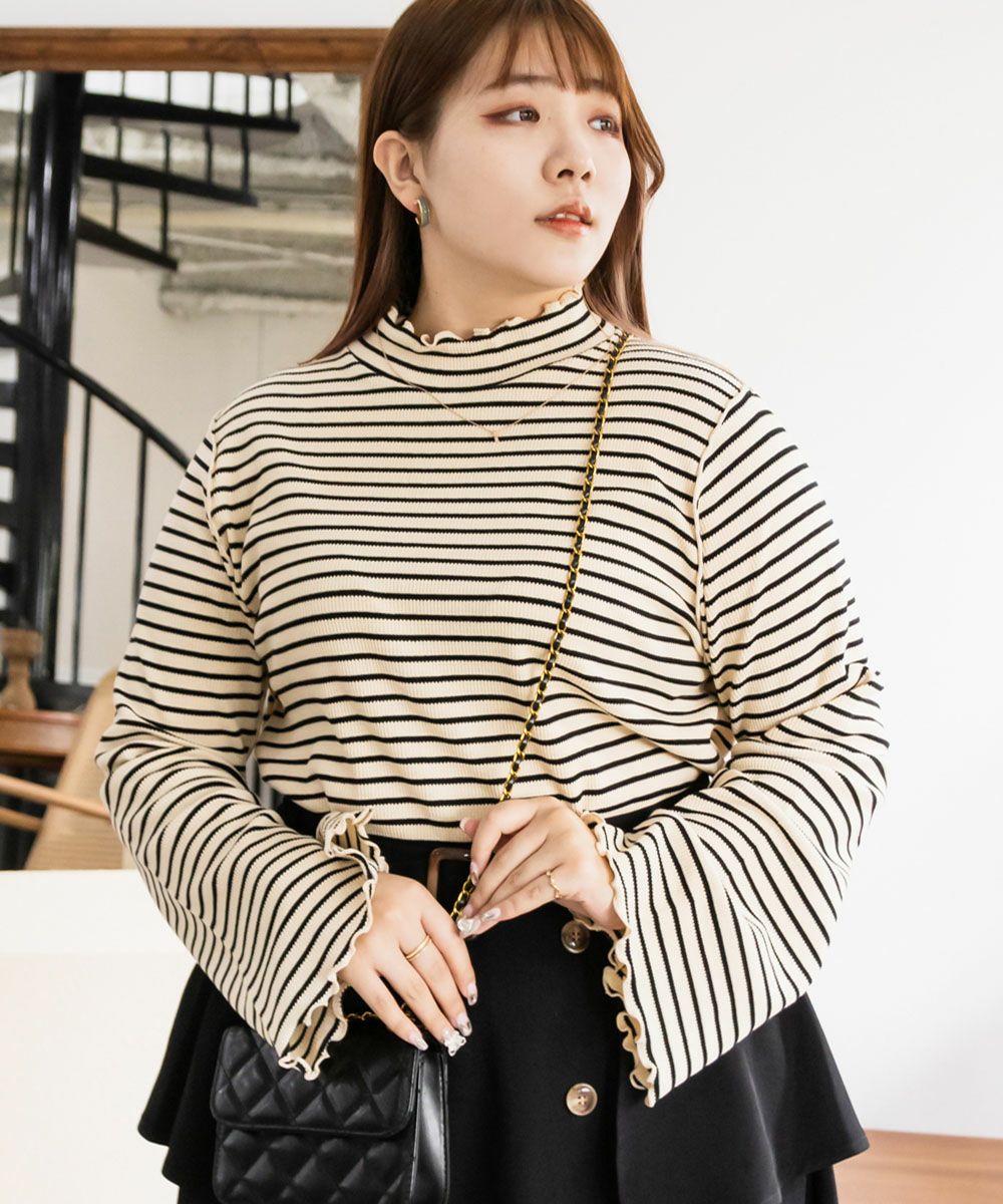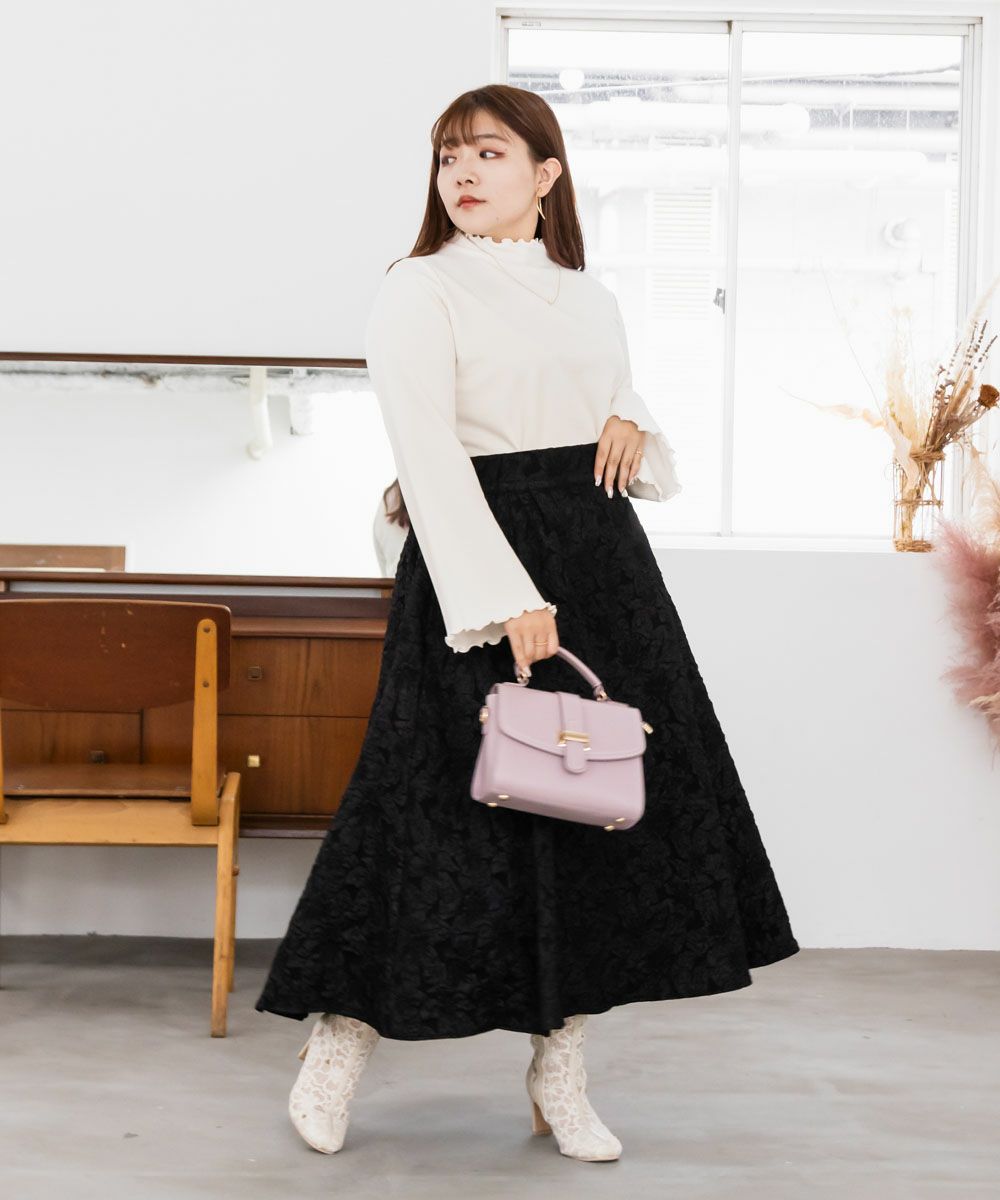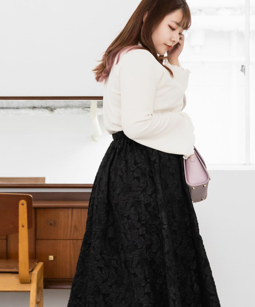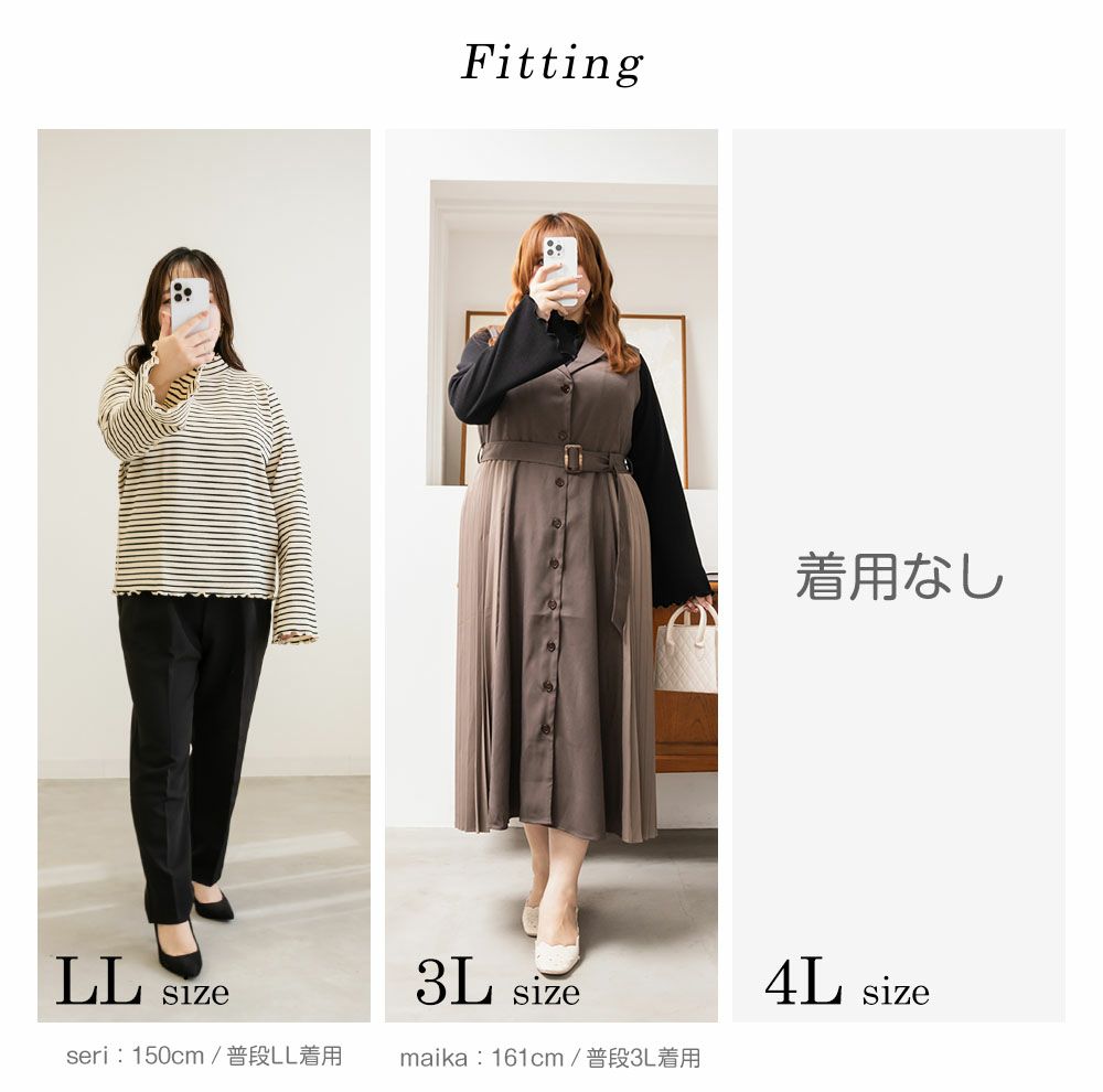 3Lを着て丁度いいサイズでした。身体にフィットしすぎないサイズ感だから、1枚でトップスとしても使えるのが嬉しいです!ワンピースのインナー使いにもおすすめなので、色々な着回しが可能◎フレアスリーブで女性らしい、大人っぽいスタイルが完成します!