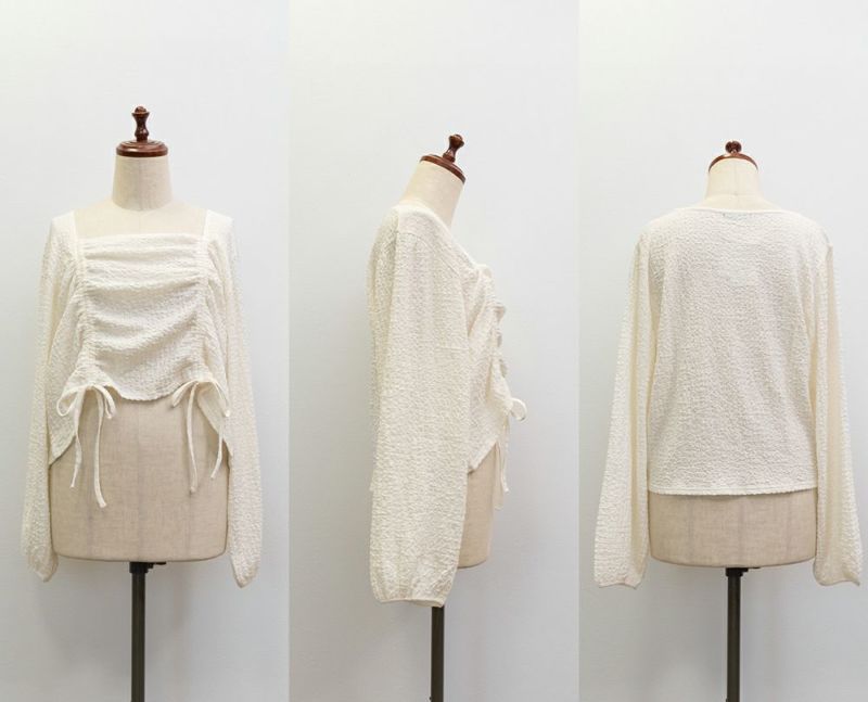 くしゅくしゅのところと丈感が可愛くて、思わず買いました。 胸元の空きが気になってましたが着てみたら紐の調節次第で問題なかったです。 袖周りが結構緩いかなと思ったのとアイボリーを買ってますが、オフホワイトがあったらより嬉しかったです。