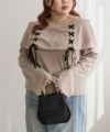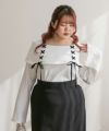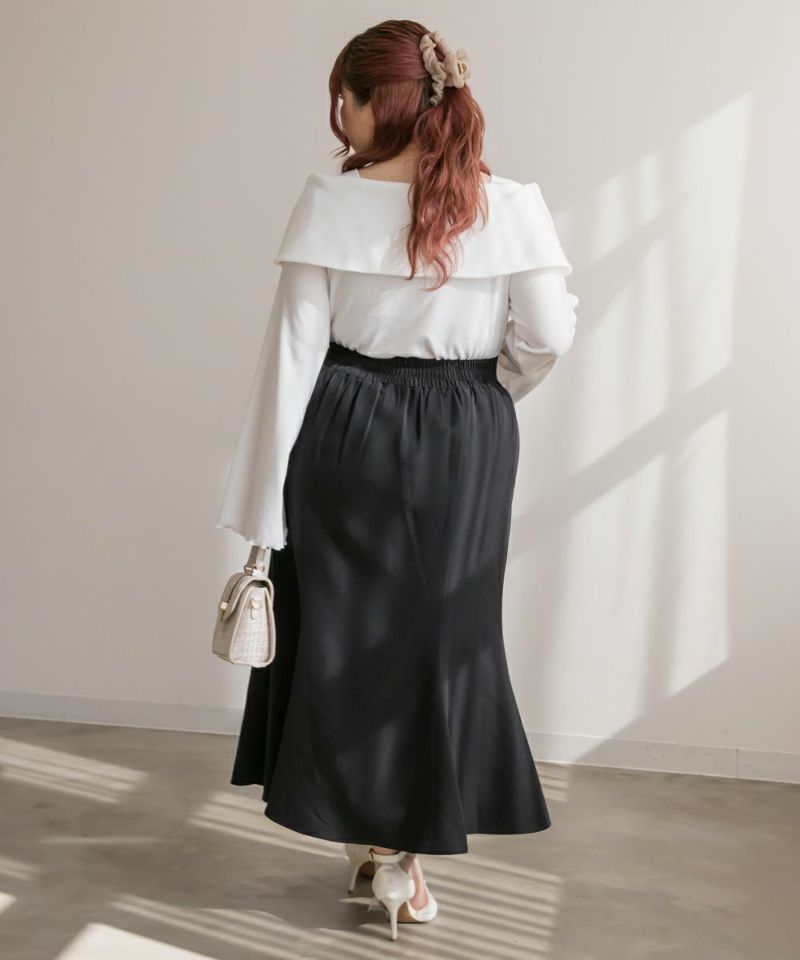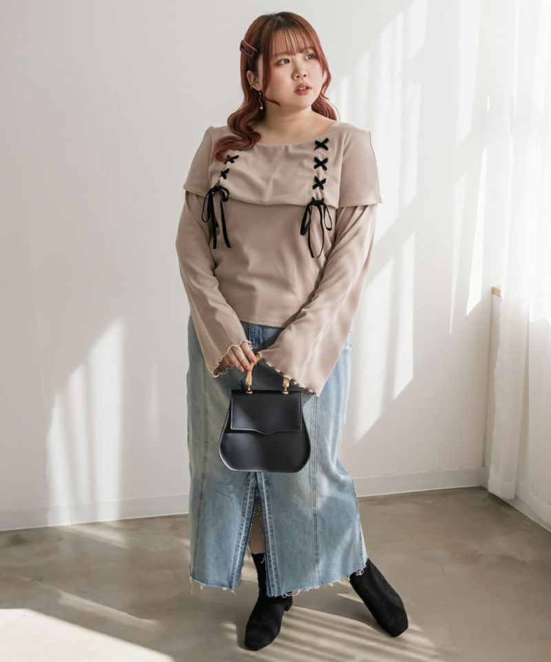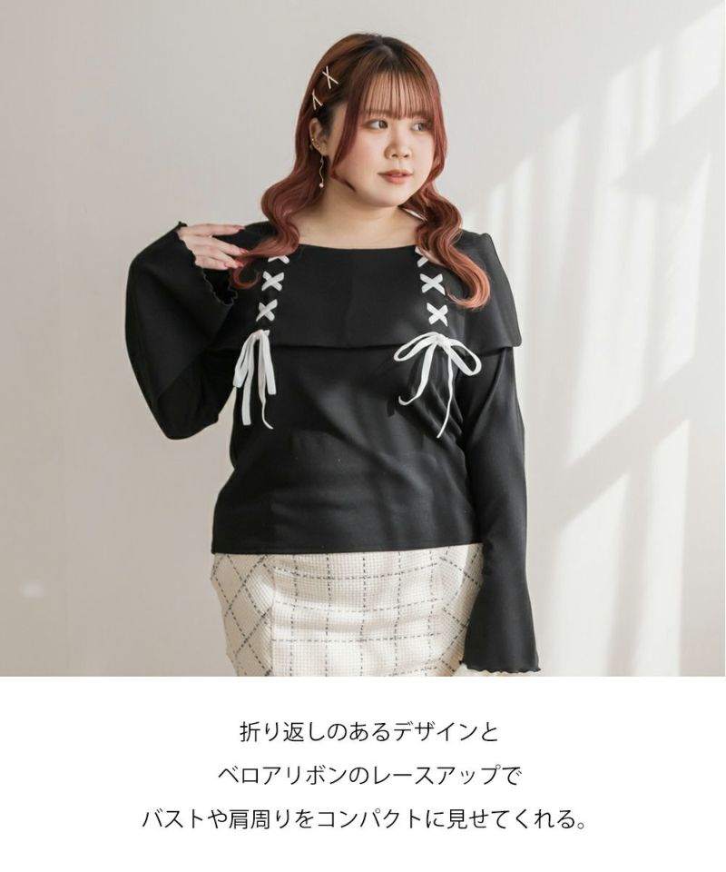 3Lを着用してちょうどいいサイズ感でした。ネック回りが綺麗に開きながら、下着の肩紐が見えないようなデザインになっているのがポイントでインナーに困らないのが嬉しい!オフショルは苦手だけど女性らしいデザインを探している方におすすめです♪レースアップのリボンがアクセントになっていて、メリハリのあるすっきりとした印象になれます!袖もフレアに広がっていて女性らしさたっぷりで手元もおしゃれで可愛い◎丈はタックインせずに着られるのでパンツともスカートも相性のいい1枚持っておきたいトップスです!
