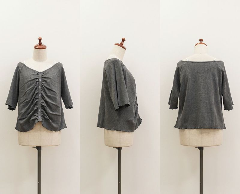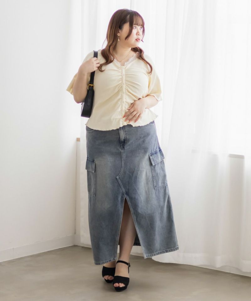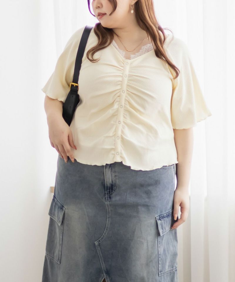 3Lサイズを着用しましたが、ちょうどいいサイズ感でした◎伸縮性のあるリブカットソー生地が快適な着心地で、軽やかに着られるので春夏にもぴったりです!胸元のレースキャミを重ね着したようなデザインが今っぽく、コーデに甘さをプラスしてくれて、1枚でレイヤード風のスタイルが完成するのが嬉しいポイントです!身頃はボディラインをカバーしてくれるふんわりとしたシャーリングになっていて、お洒落さと着?せを両立してくれます♪デニムやワイドパンツと合わせて、カジュアルガーリーなコーデを楽しみたいです!