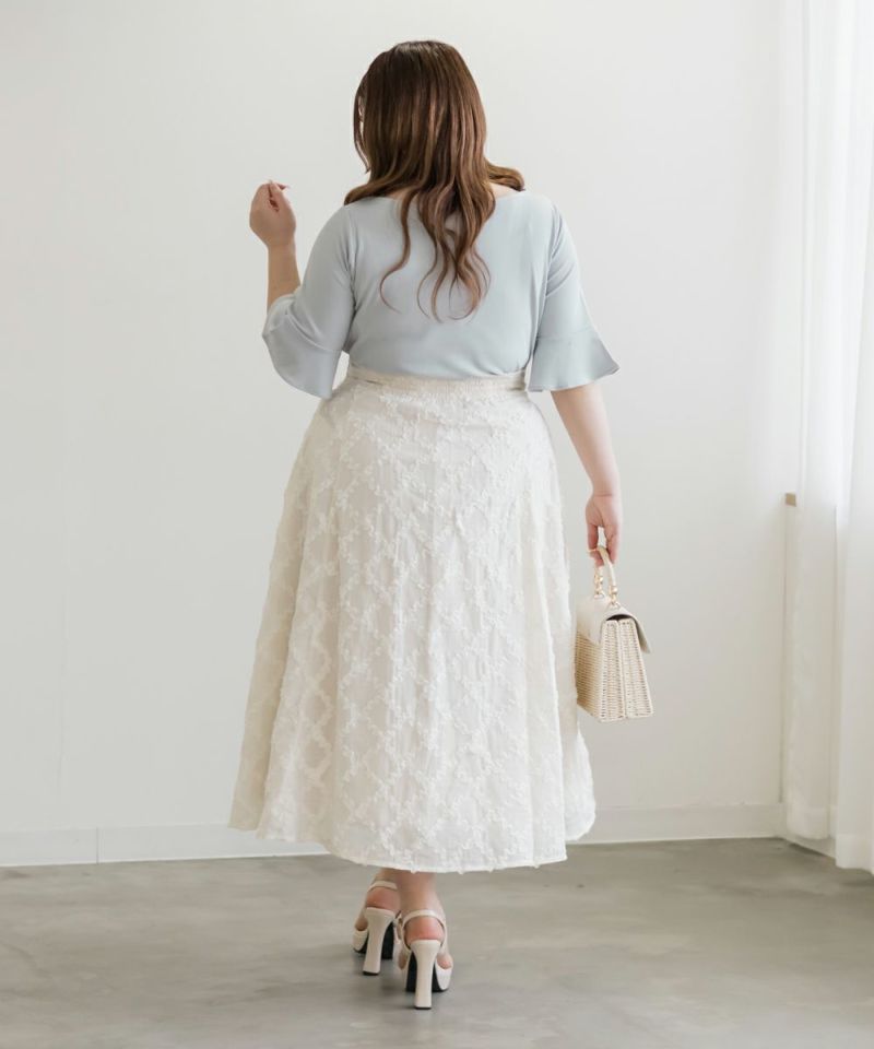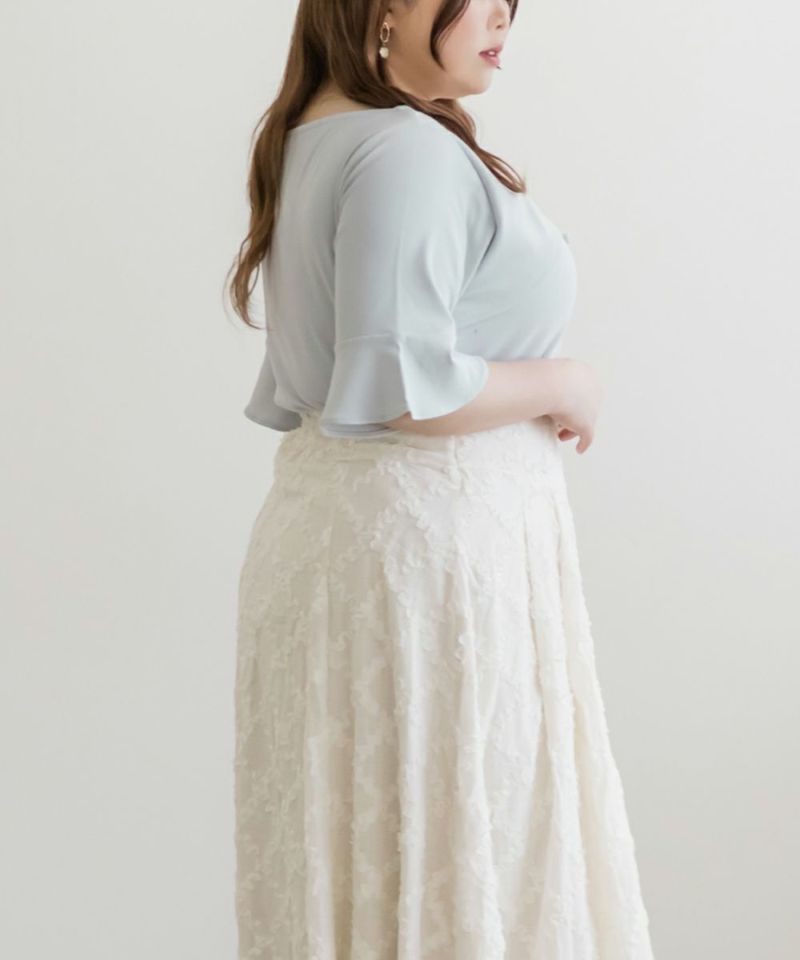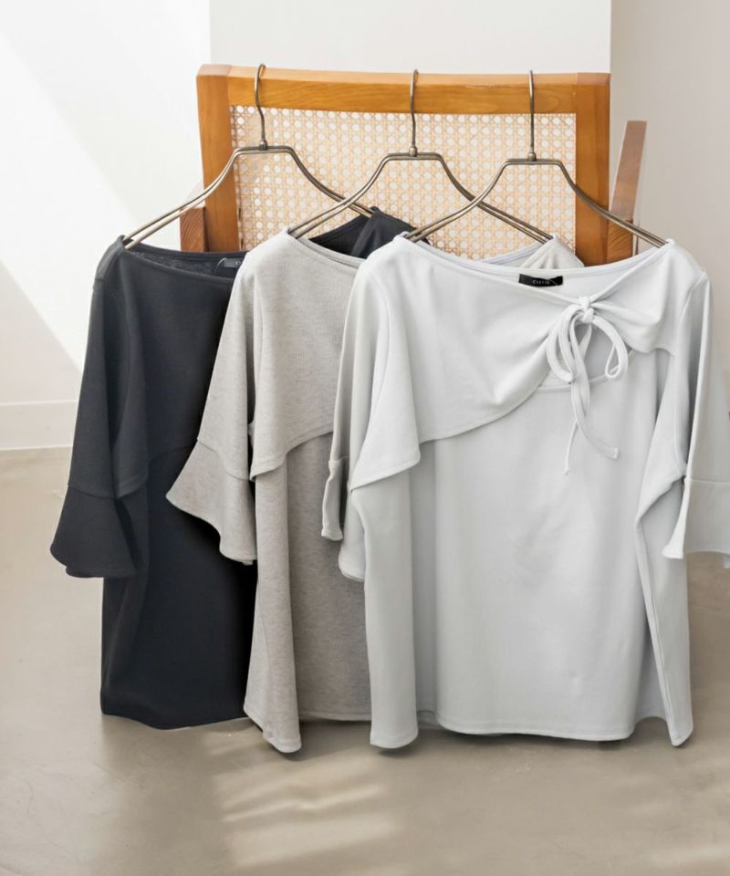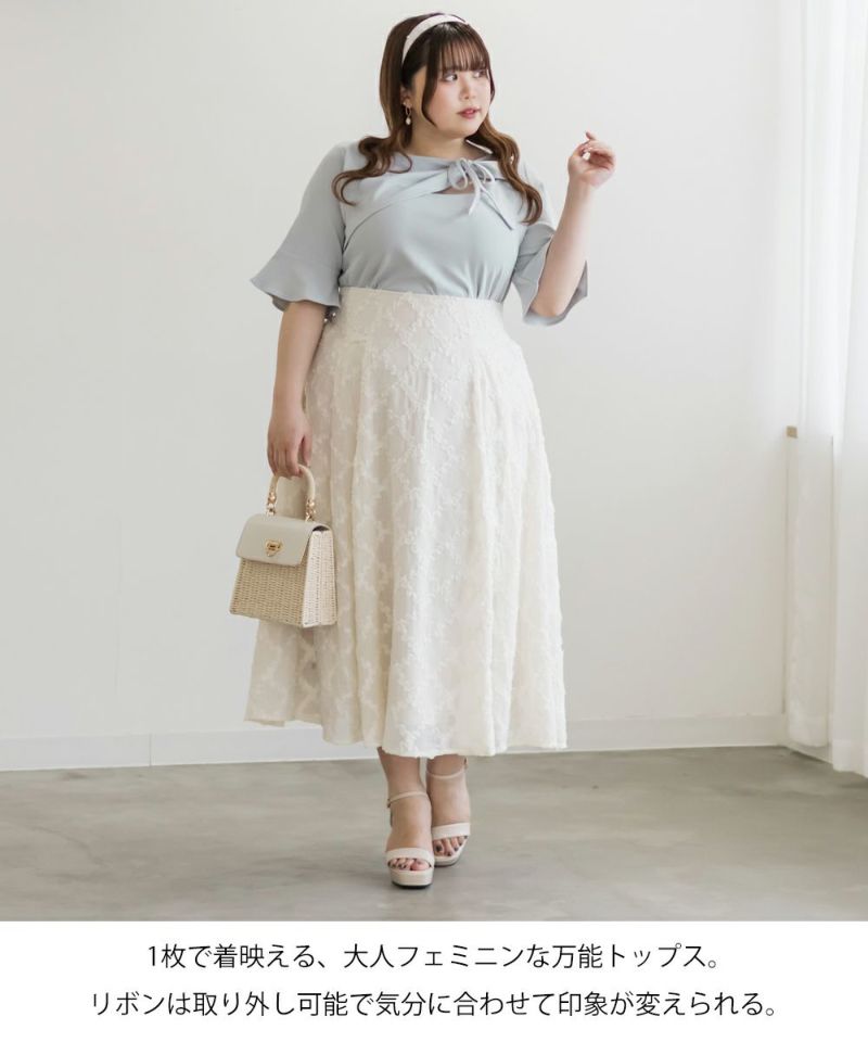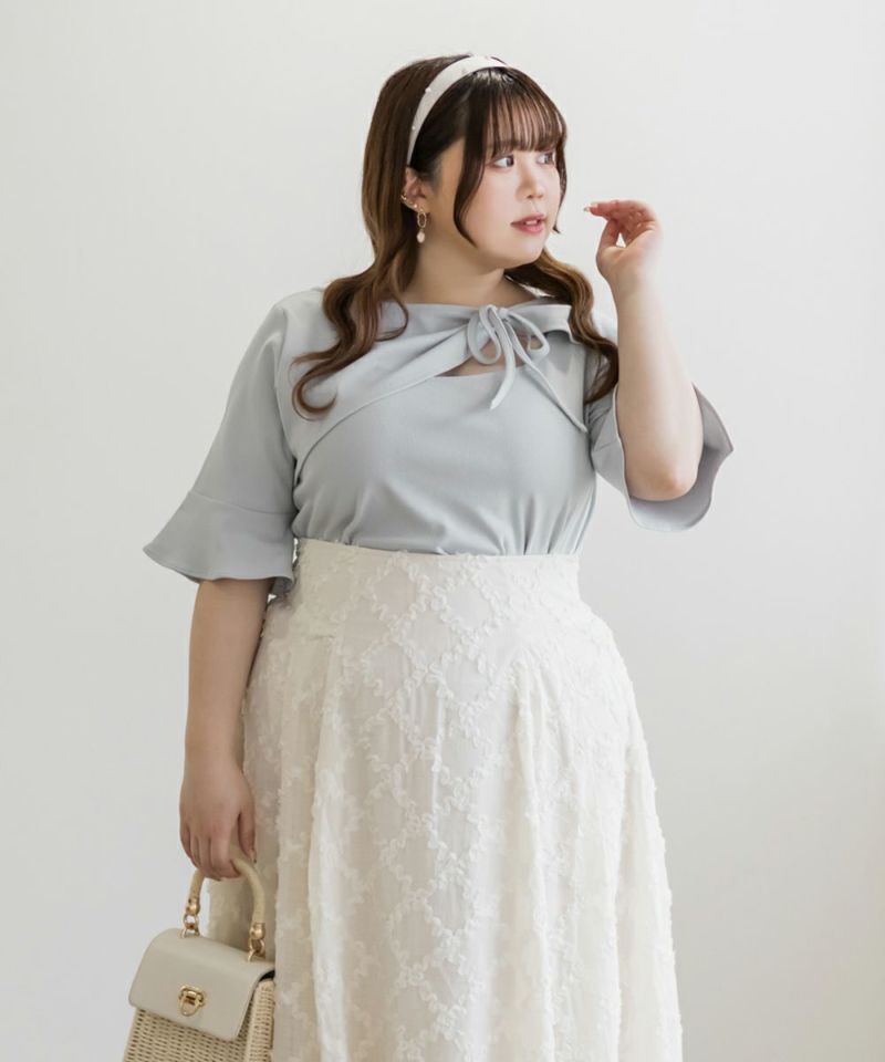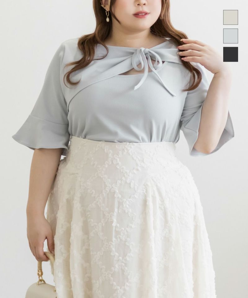 クレット 大きいサイズ プラスサイズ カットソー リブ トップス Tシャツ 肌見せ フレア袖 CLETTEオリジナル★デコルテノットリボンプルオーバー