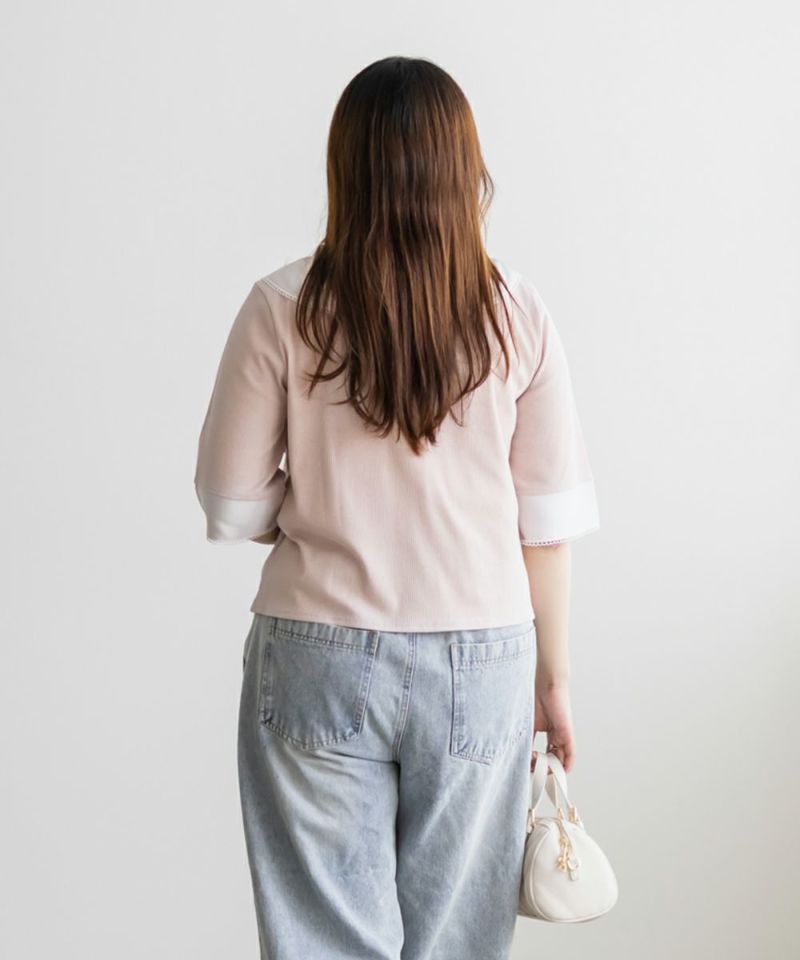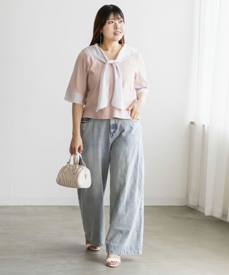 3Lサイズを着て、バストまわりや腕もほどよくゆとりがあり、体のラインを拾わず快適な着心地でした!薄手で柔らかなリブカットソーで、真夏でも涼しく着られます◎1枚でコーデが華やぐ、主役級プルオーバーです!胸元にあしらわれたスカーフ風デザインが目を引き、レイヤード風のディテールで着るだけでおしゃれ感がアップします!裾はタックアウトでもバランス良く決まり、オンにもオフにも活躍しそう♪スカーフがあることで背中周りもカバーしてくれます!トレンドのスカーフを取り入れやすいデザインなので今っぽく決まります◎デニムには勿論、スカートとも相性抜群です!