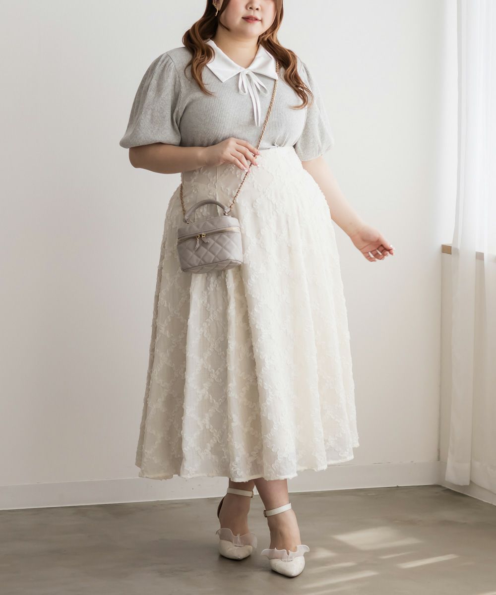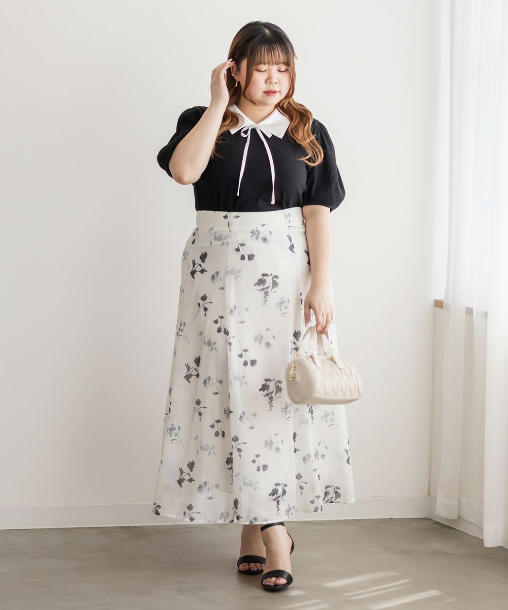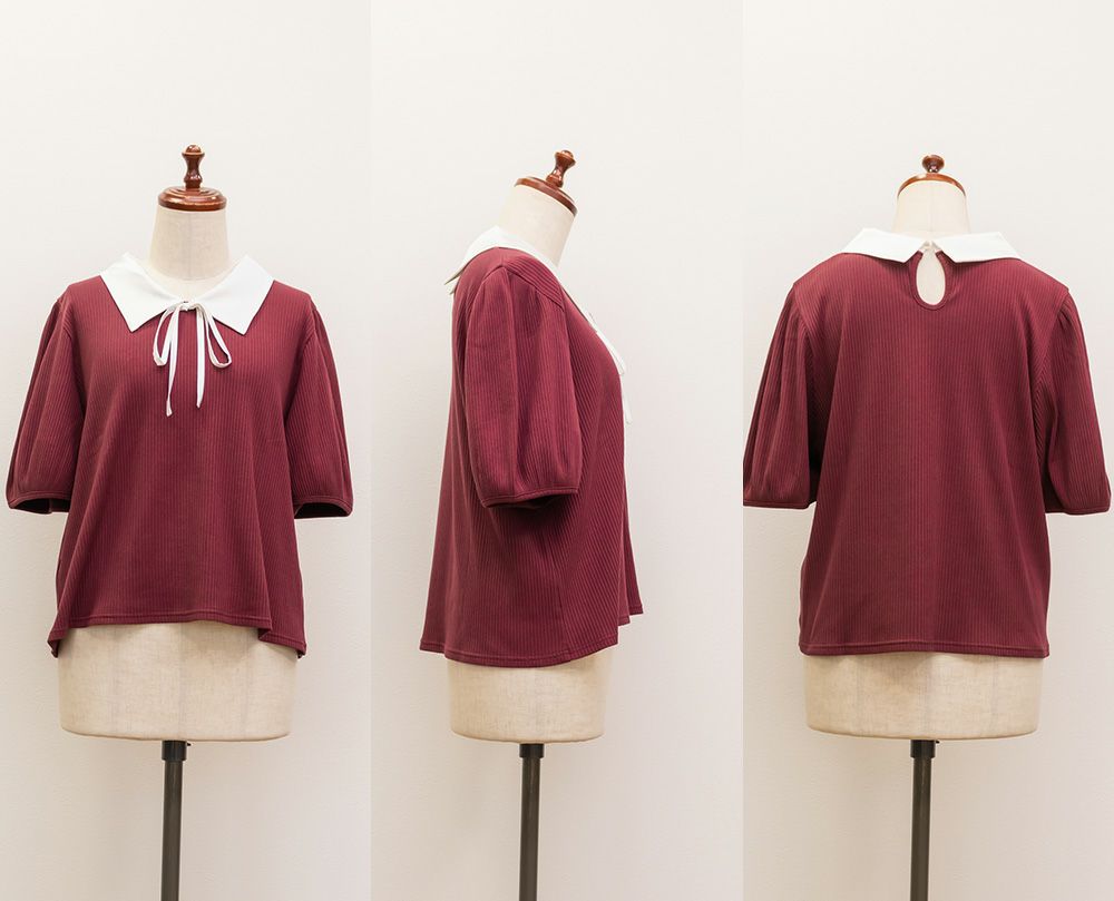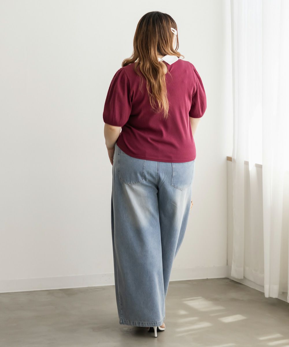 3Lを着ていつも通りのサイズ感でした。伸びのいいリブ素材だけど、身体のラインをを拾いすぎないゆとりを持たせたシルエットで嬉しいです! 袖もふんわりしていてぴったりせず、二の腕が気にならないのがポイント!光沢感のある襟とリボンがアクセントになっていて、着るだけでコーデが華やかになるトップスです◎カットソー生地だけど、デザインが上品にもフェミニンにも仕上がる雰囲気なのでパンツにもスカートにも合わせやすく、オンにもオフにも活躍するアイテムです♪