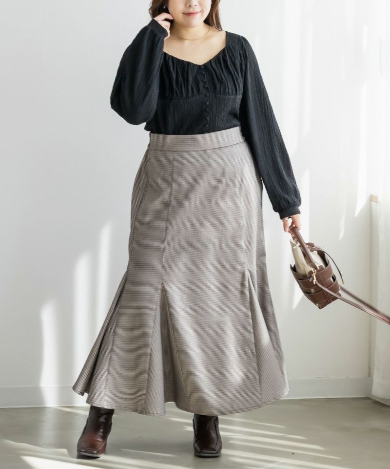 3Lサイズを着用して、ほどよくゆとりを持って着られる着心地でした。軽くて伸縮性のある生地で、とても楽な着用感でした。凹凸のある表面でボディラインを拾いずらいのも嬉しいポイントです。バストにギャザーが寄せてあって、女性らしくメリハリのある雰囲気になります。胸下からはすっきりとしたデザインになっていて、着痩せして見えます。デザイン性があって大人っぽくも、フェミニンにも合わせられるので、ボトムを選ばずに着回しできます◎秋~春とロングシーズン活躍する1枚です♪