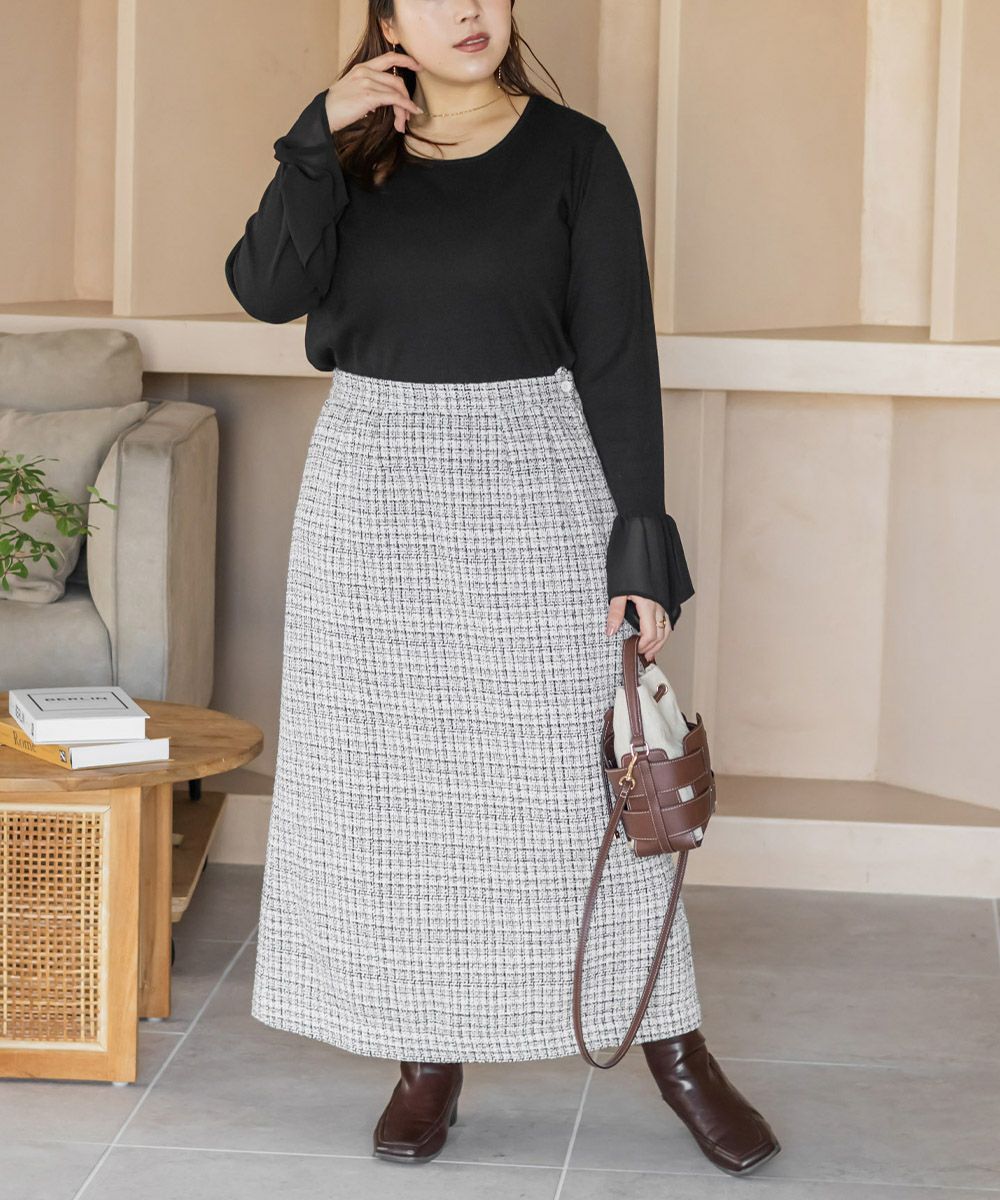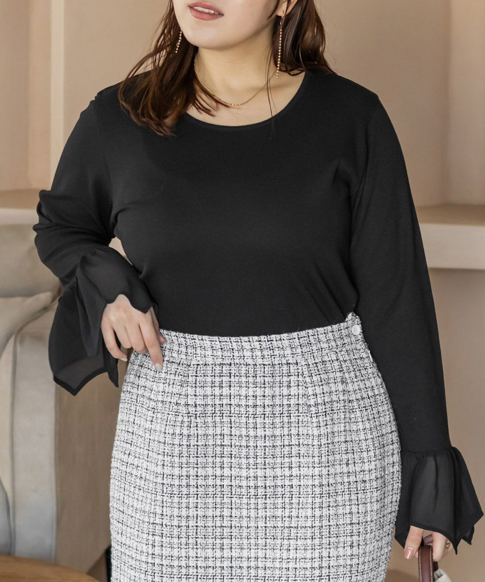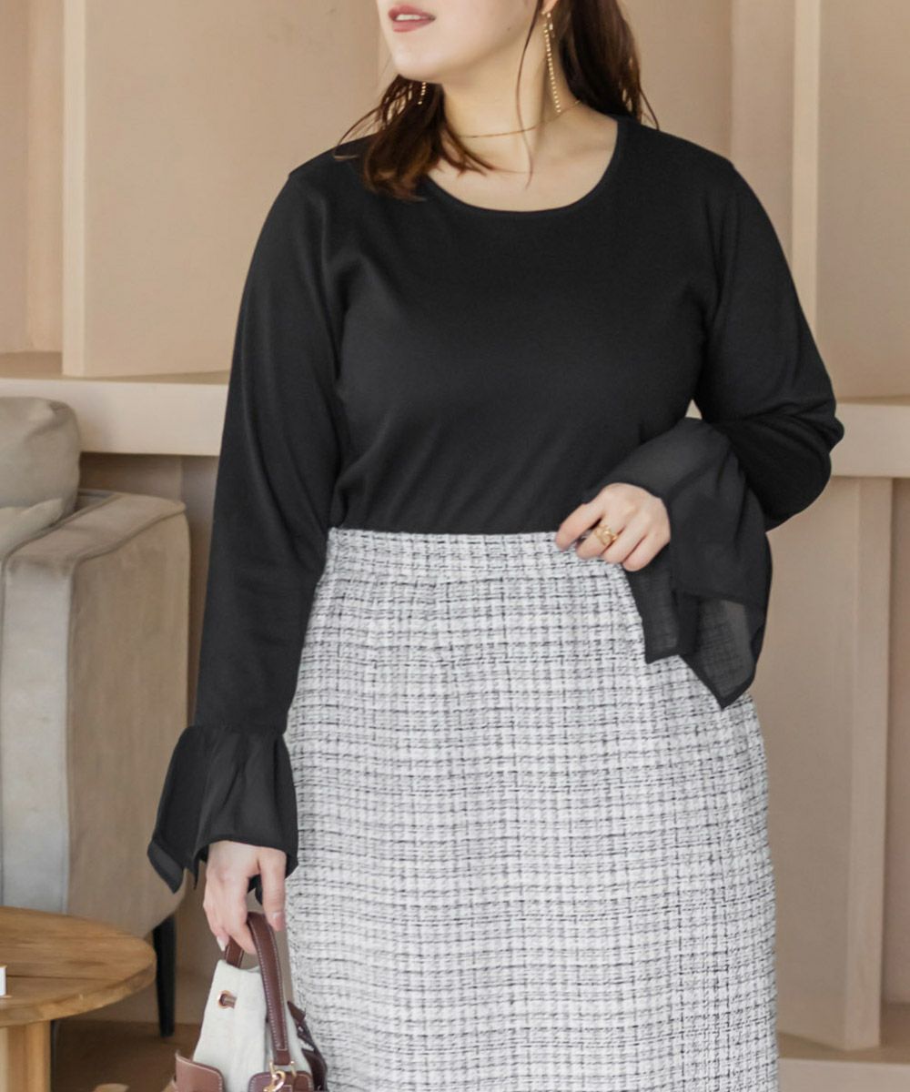 3Lサイズを着用して、ちょうどいい着心地でした。シンプルなリブトップスだけどお袖のジョーゼットが可愛くて手元を華やかにしてくれます♪ 少し透け感があってひらひら動くジョーゼットだから、シルエットもきれいに見えします。伸びの良いリブ素材で着心地はちょうどよく、1日着ていてもストレスを感じませんでした◎トップスとしてはもちろん、ジャンスカやキャミワンピのインナーにも使いやすくて、着回し力抜群の1枚です!