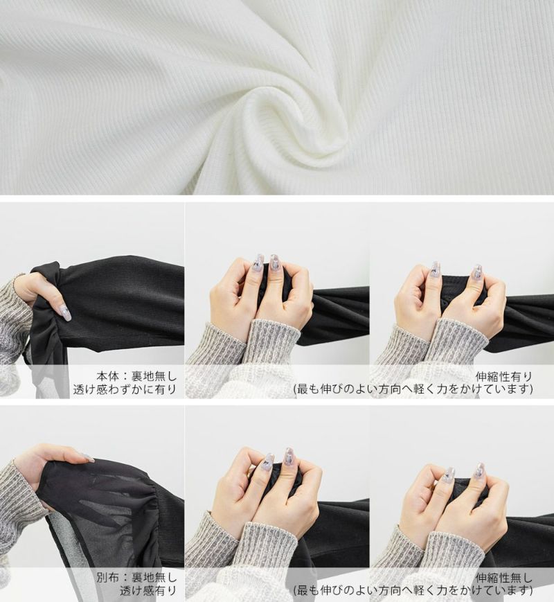 本体はリブカットソーで袖部分はさらりとしたジョーゼット素材。真夏以外のロングシーズン使える生地です。程よい生地感だからインナーとして着てももたつかず、コーデの主役トップスとして着る事も可能。