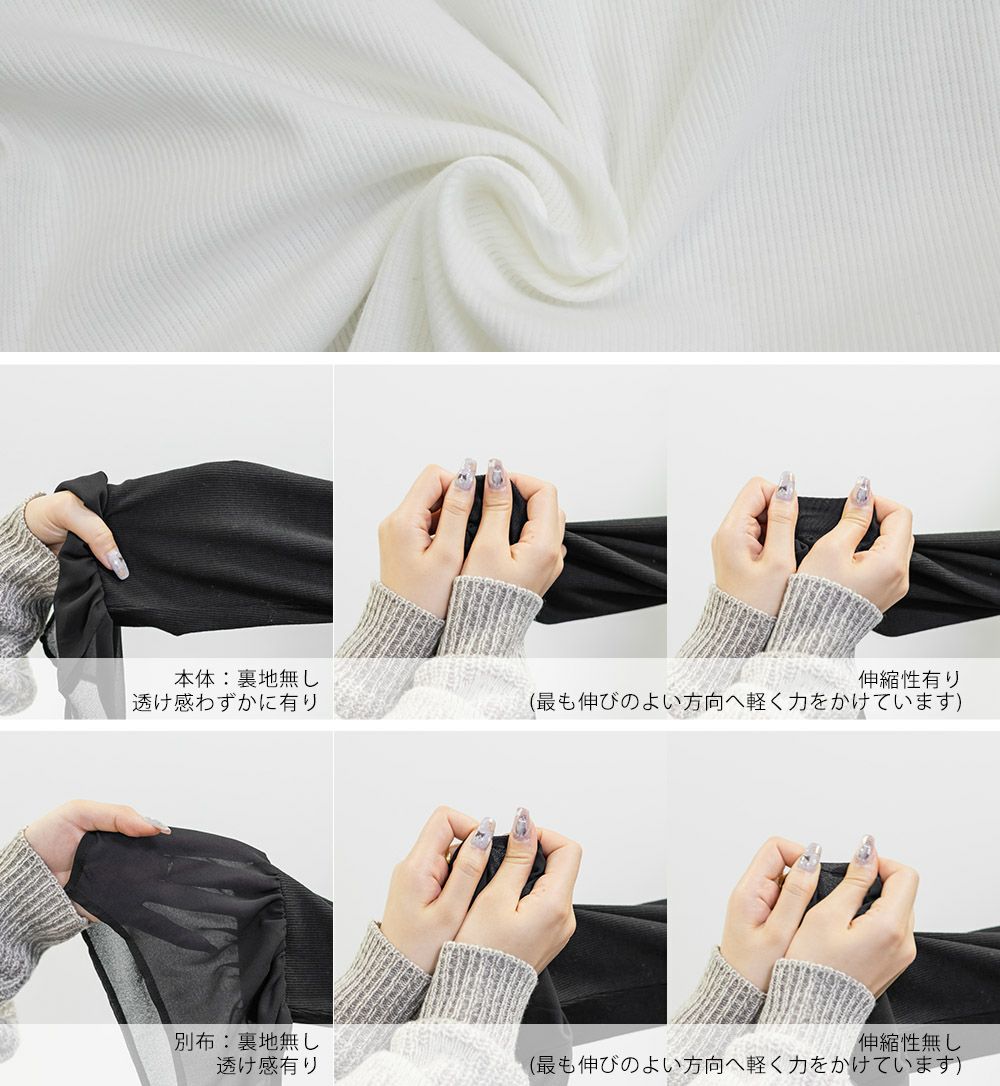 裏地・透け感・伸縮性 本体:裏地無し、透け感わずかに有り、伸縮性有り / 別布:裏地無し、透け感有り、伸縮性無し