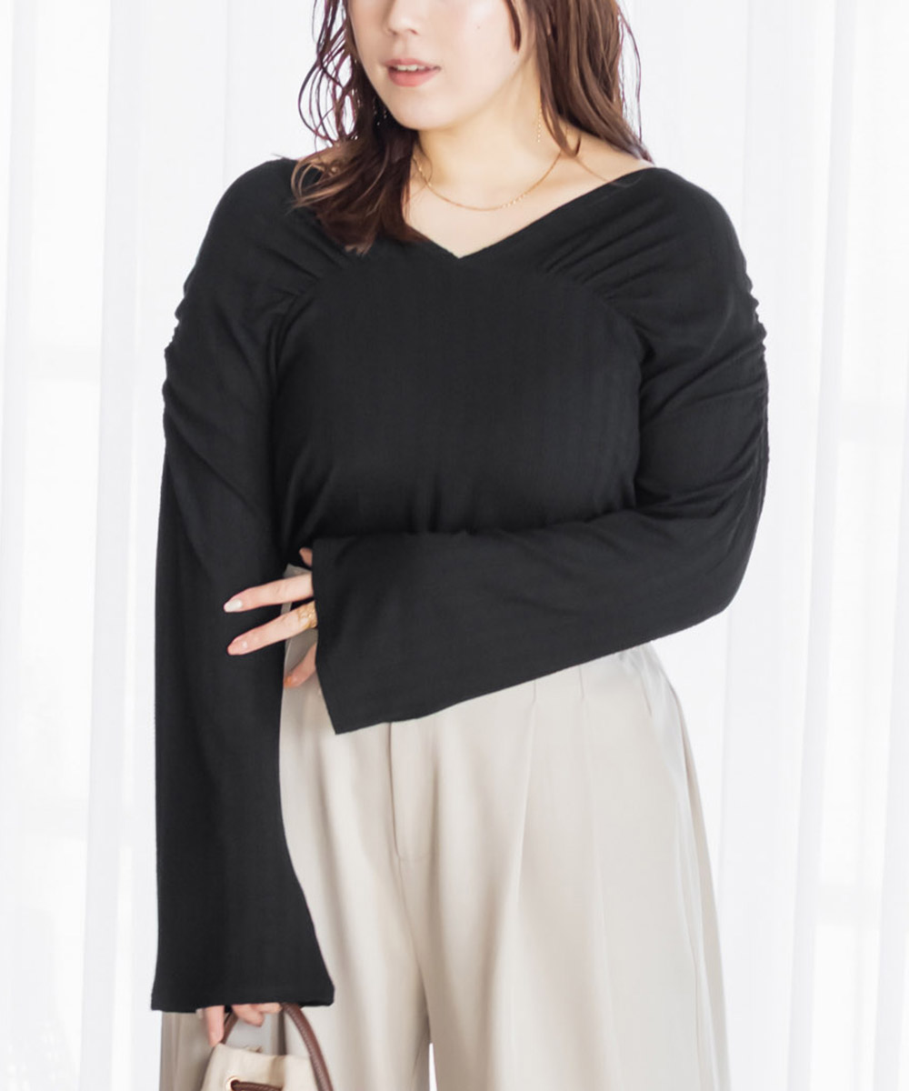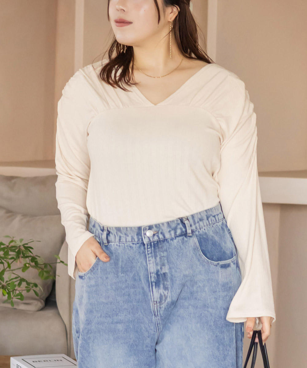 すっきりとした美しいデコルテラインが印象的なVネックのカットソー。オフショルとして着る事もできる2WAY仕様で自分好みの着こなしに変化できます。二の腕を細く見せるフレアに広がった袖も着やせのポイントです。