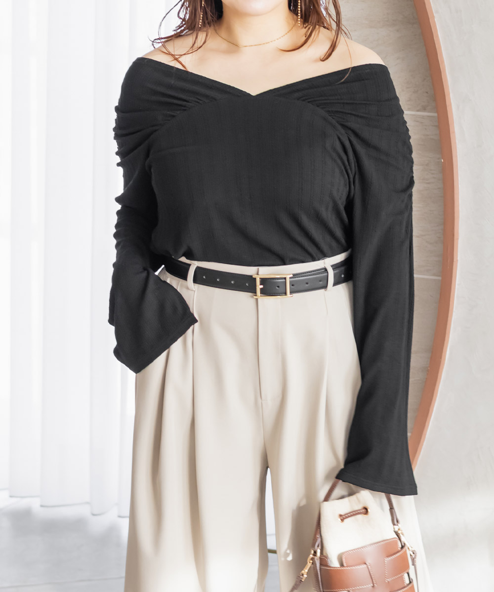3Lを着て、着用感はぴったりでちょうどいいです。オフショルとしても使える2WAYデザインで、シーンに合わせて雰囲気を変えられるのが嬉しいポイント!ジャストサイズで着るのがおすすめです!肩まわりのフィット感もちょうどよく、ずれにくいから安心して着られます。肩回りのデザインが視覚効果になって、腕をすっきり見せてくれます◎ポコポコでさらっとした生地感で着心地もよく、ロングシーズン着回しできます!