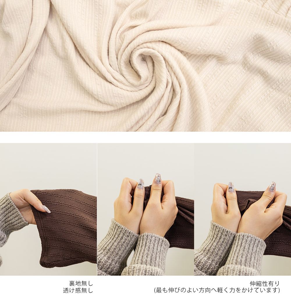 細いケーブル編みのような部分もある、フェミニンな印象の柔らかいリブ素材。伸縮性があり肌触りが良く着ごちの良い生地です。凹凸感があるからボディラインを拾わないのも嬉しいです。