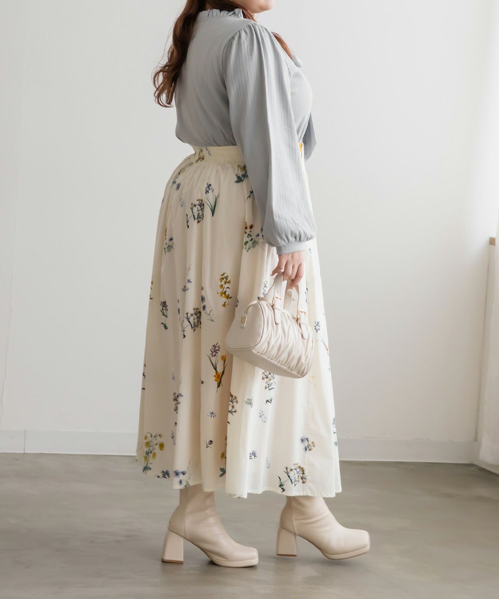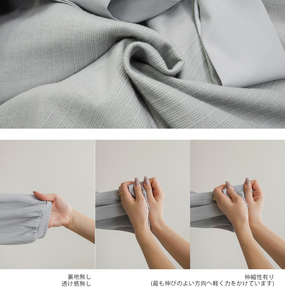 【design】襟のフリルと大きめリボンがフェミニンなポイントになったカットソー。着心地らくちんなのにデザイン性たっぷりの嬉しい1枚。【material】伸縮性があり程よくしっかりとしたリブカットソーに、襟とリボン部分には柔らかい布帛生地を使用しています。【styling】可愛らしい雰囲気なのでスカートと合わせてガーリーなスタイルにまとめるのがお勧めです。裾がごわつかないデザインなのでスカートに裾をインした、フィット&フレアシルエットで王道スタイルもしやすいアイテムです。
