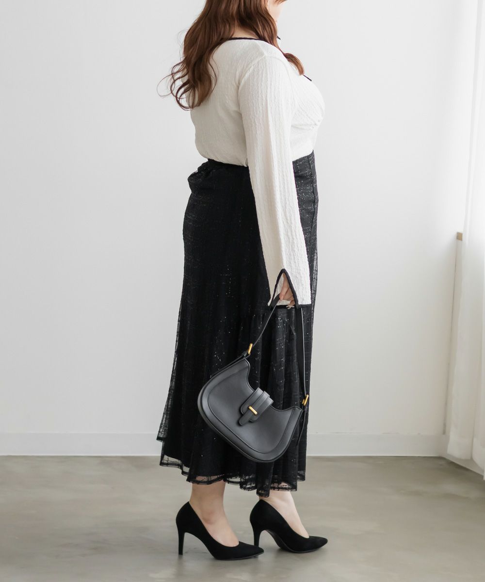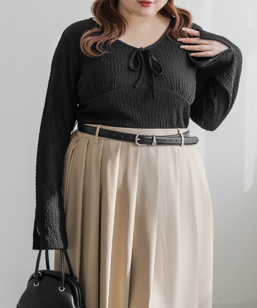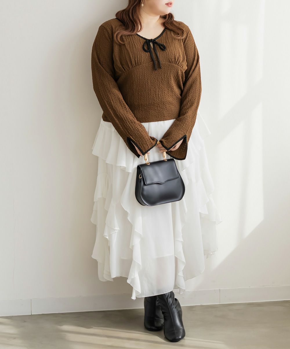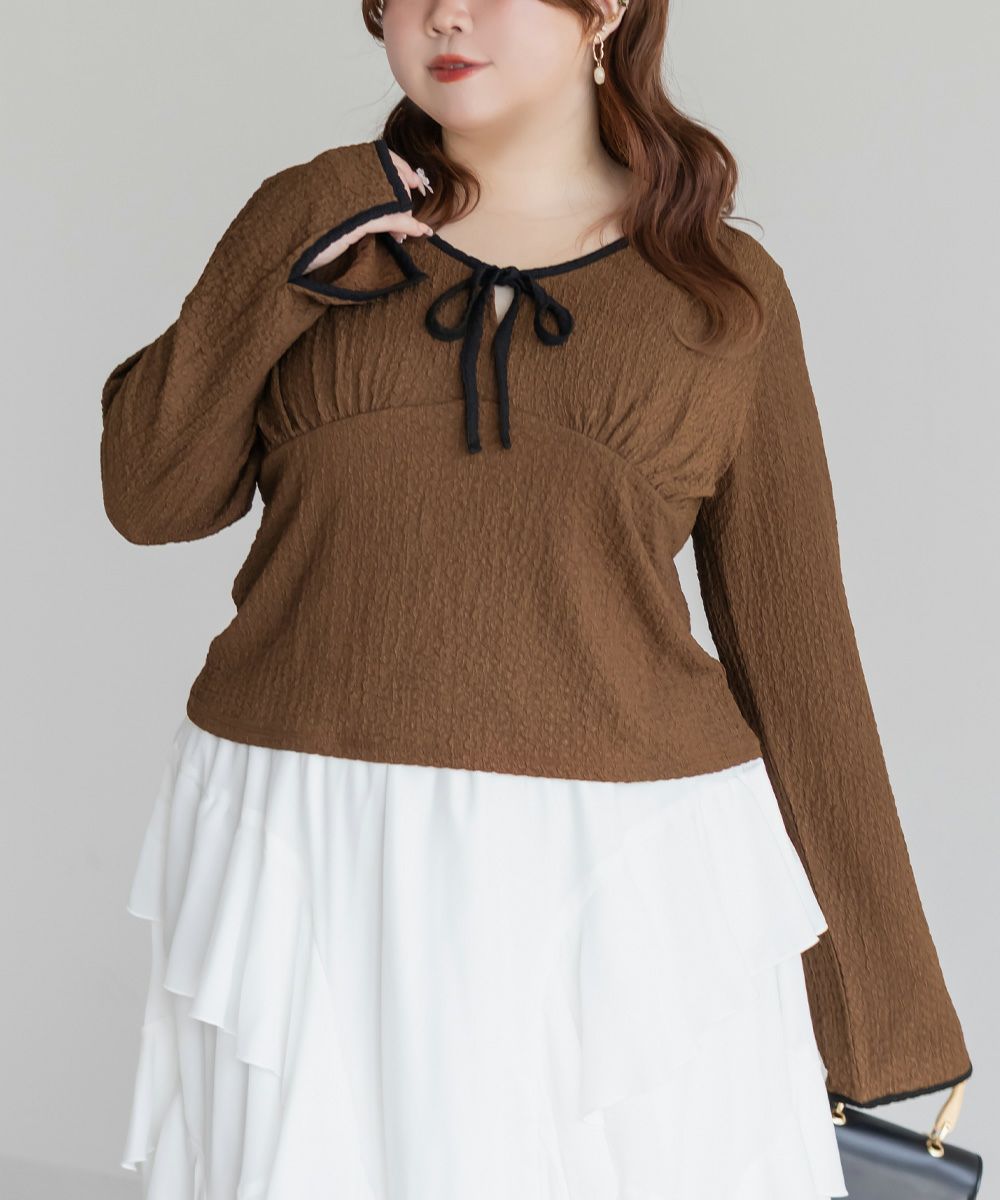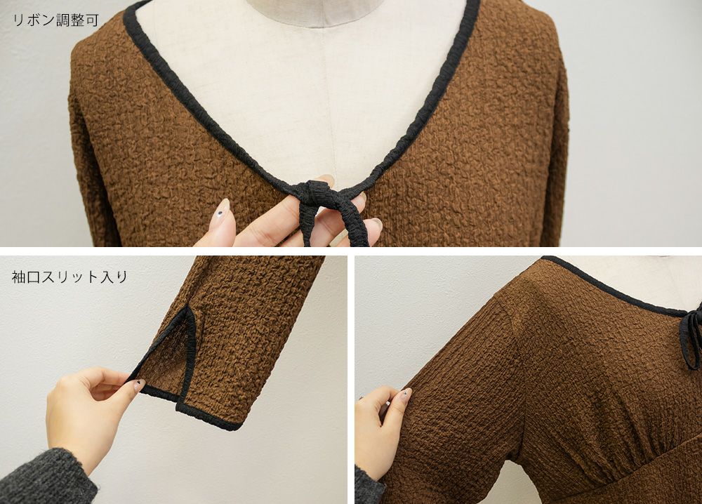 3Lサイズを着用しました。いつも着ているサイズ感と比べてちょうどよく、身幅や袖にも程よいゆとりがあって楽に着られました。配色デザインとリボン切り替えがポイントになって、1枚でしっかり着映え
