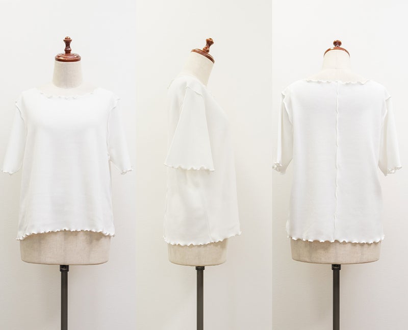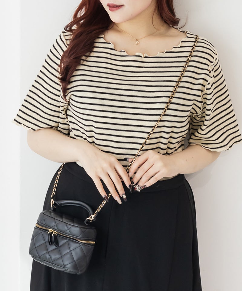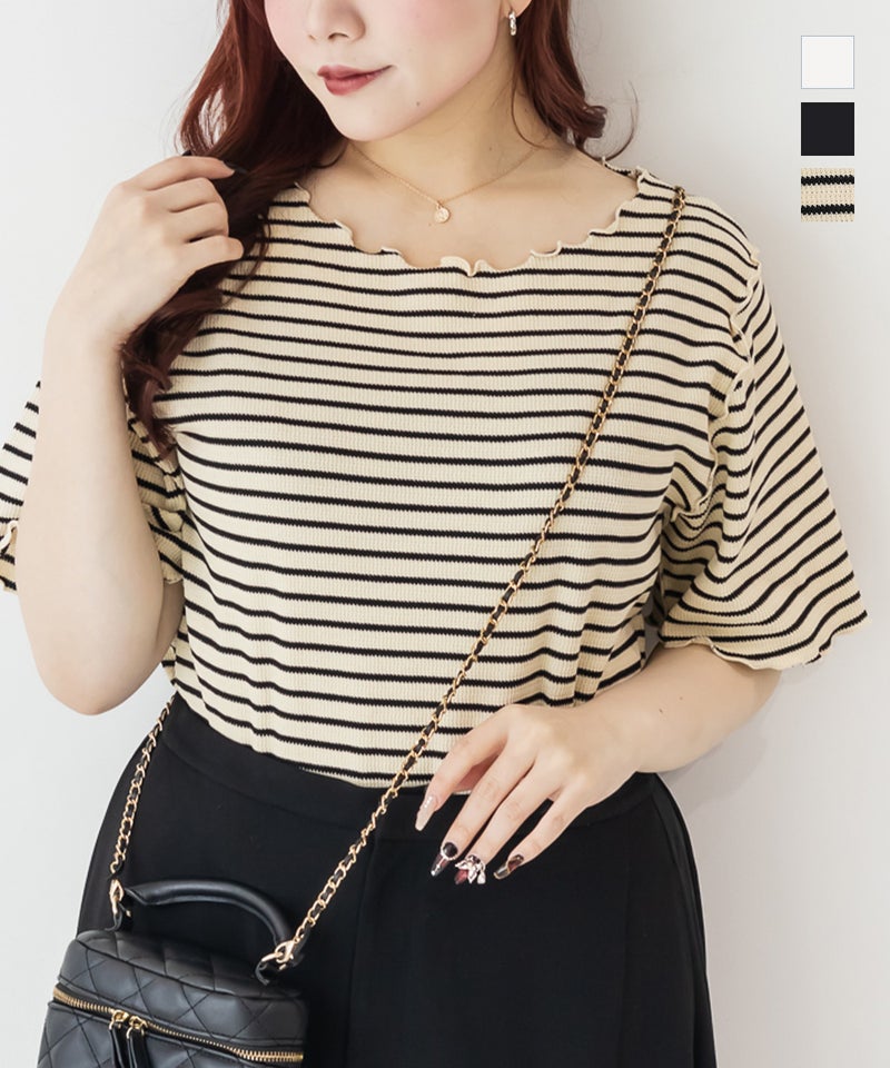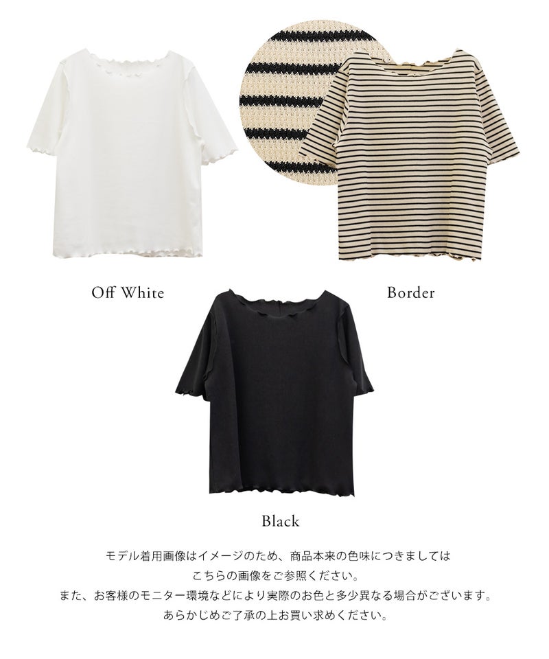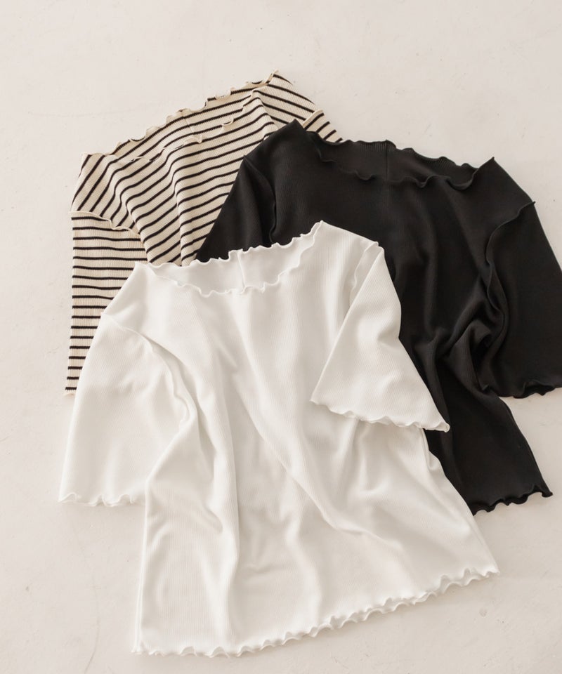 【design】ーシックなデザインで使いやすいカットソー。シンプルな中のメロー使いやアウトシームがアクセントに。トップスとしても、キャミワンピなどのインナーとしてみ着回しの効く1枚あると便利なアイテム。【material】無地:しっかりとした伸縮性のあるリブカットソー。ボーダー:さらりとしていながら程よくしっかりとした伸縮性のあるワッフル生地。どちらもハリがあるからボディラインを拾いづらく、着用した時すっきりとした印象になれる。【styling】シンプルだからどんなアイテムとも合わせやすい。ボートネックとの相性も良く小顔効果をプラスできる、ネックレス合わせがおすすめ。