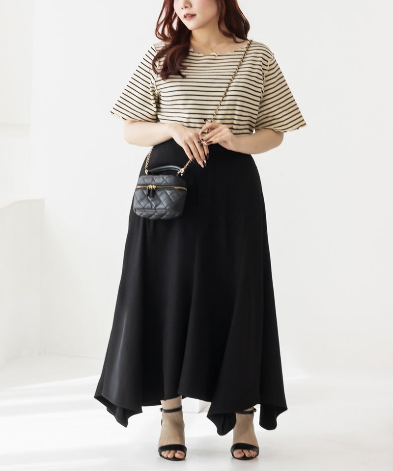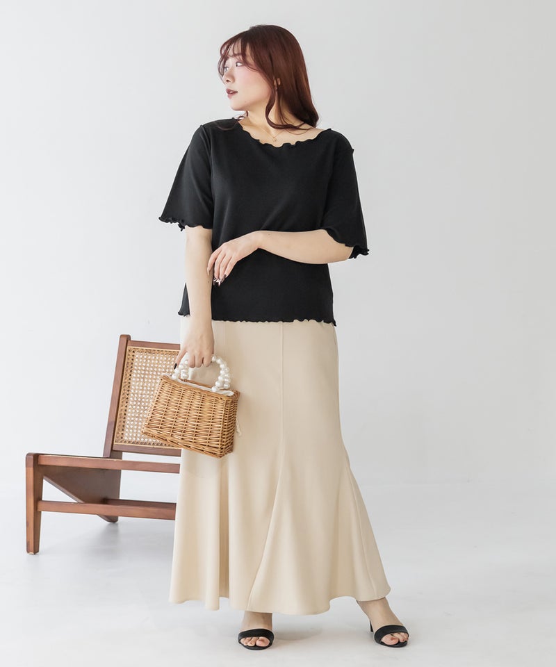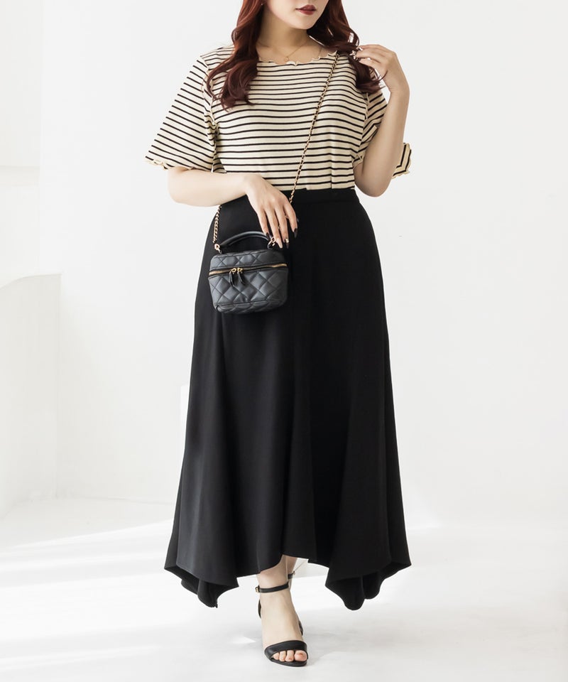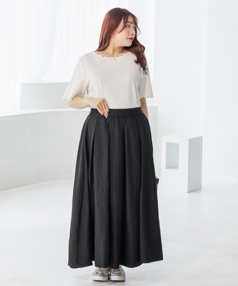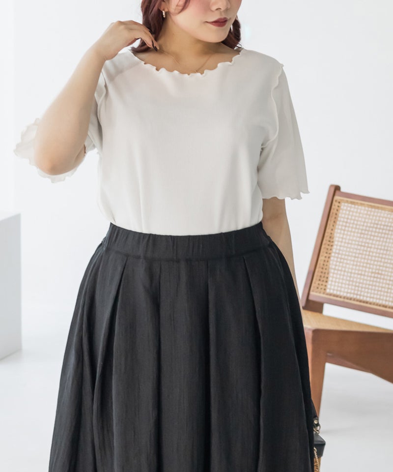 3Lを着てちょうどいいサイズでした。程よくしっかりとしていて、ゆとりのあるシルエットだから、身体のシルエットを拾いづらいです◎シンプルなデザインだから、インナー使いとしても、トップスとしても活躍できます、すっきろとしたネックラインにアクセサリーを合わせるのもおすすめです♪ベーシックだけどさりげなくメローデザインが入っていてかわいらしさもある1枚です!