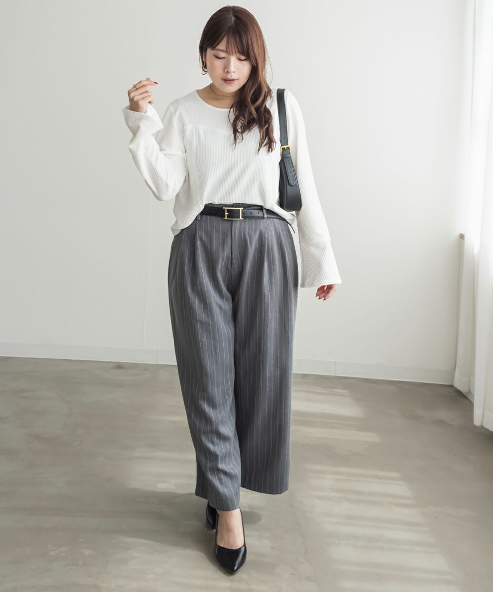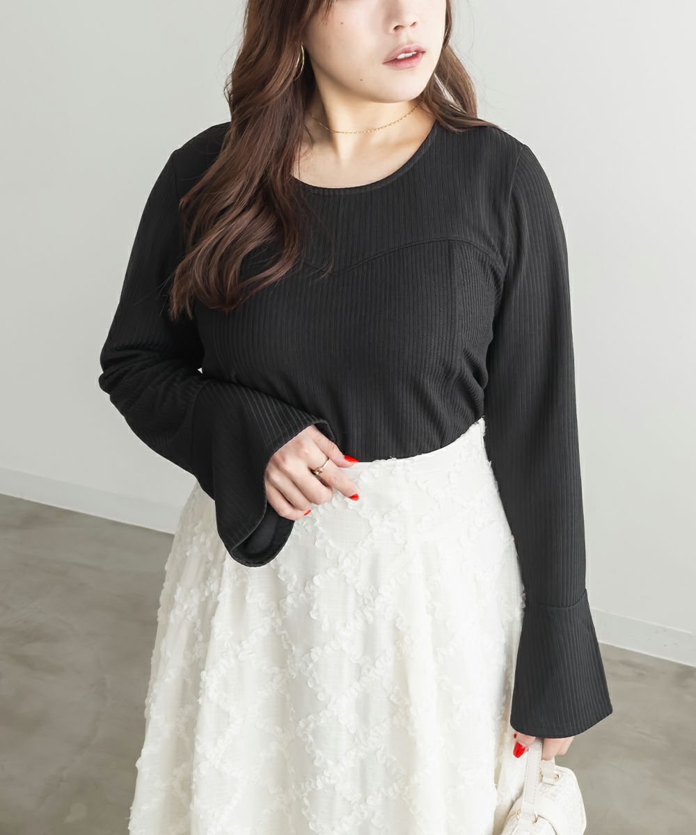 3Lサイズを着用しました。着用感はちょうどいいです。ビスチェを重ね着したような切替デザインがポイントのプルオーバーで、1枚でレイヤード風コーデが完成します。リブ素材の程よいフィット感が身体のラインをきれいに見せつつ、伸縮性があるので動きやすく快適です◎ 袖口に向かって広がるデザインが手元を綺麗にみせてくれます♪すっきりとしたシルエットで、アウターを重ねてももたつかないのが嬉しいポイントです。デニムやスカートなど、ボトムを選ばず着回しやすく、シンプルながら着映えするアイテムです。
