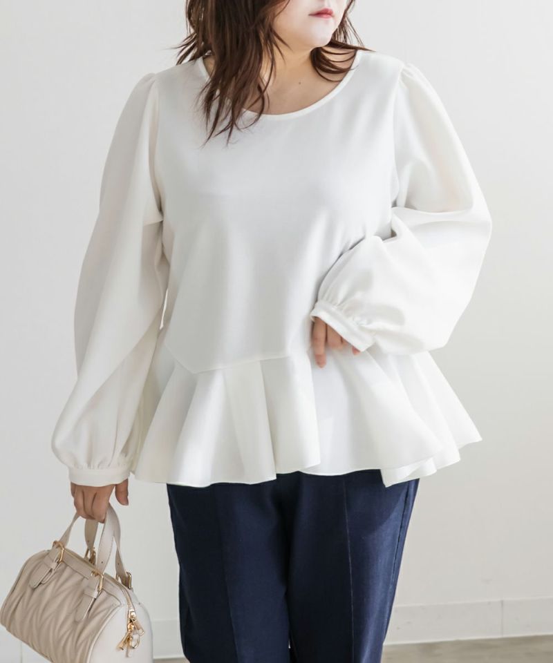 LLサイズを着用しましたが、ちょうどよくリラックス感のある着心地です。生地自体も肌なじみが良くノンストレスです。楽なのに上品見えするシルエットなのが嬉しいです!ウエスト切替から広がるペプラムが自然に体型をカバーしてくれて、気になるお腹まわりも目立ちません!イレヘムデザインなので、動くたびに揺れ感が出て、シンプルなのに華やか見えします♪オフィスシーンなどの綺麗めに仕上げたい時にもおすすめで、パンツ合わせでカジュアルに、スカート合わせでフェミニンにも着回せる万能トップスです!