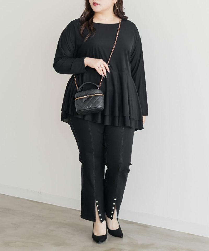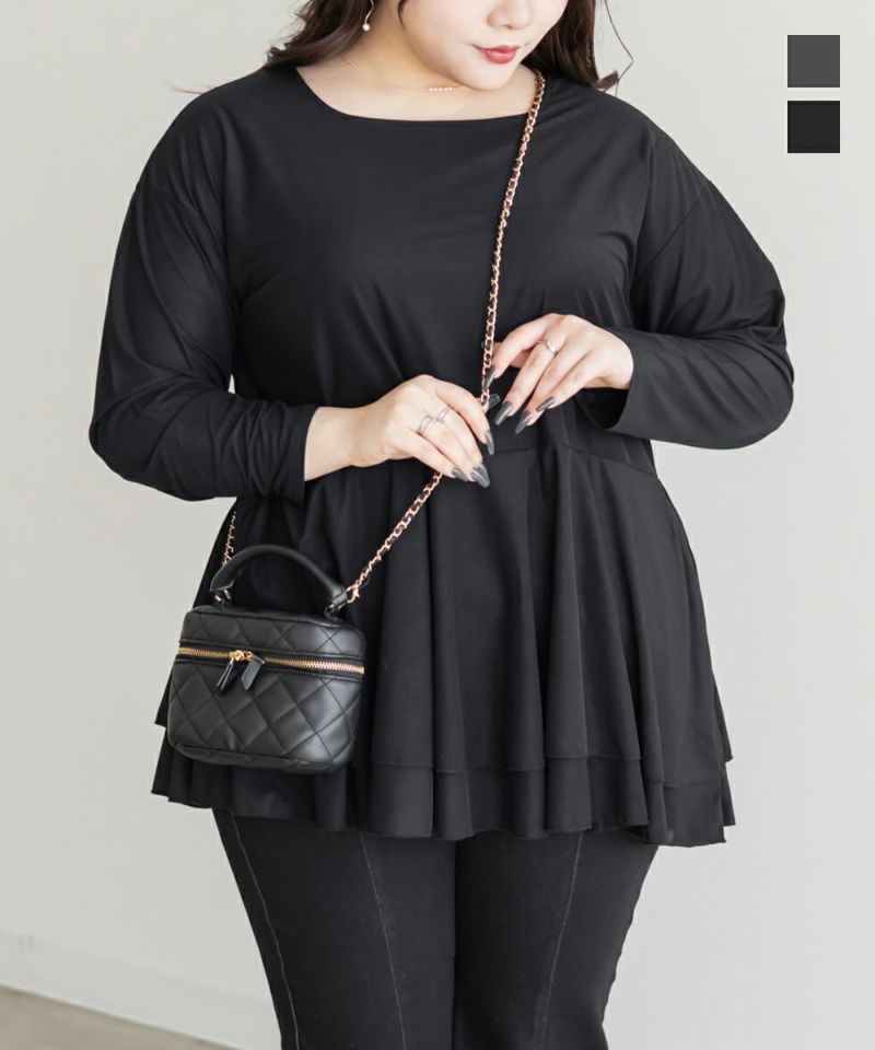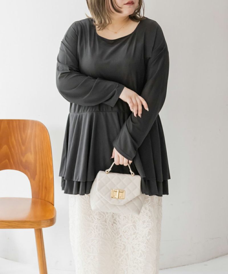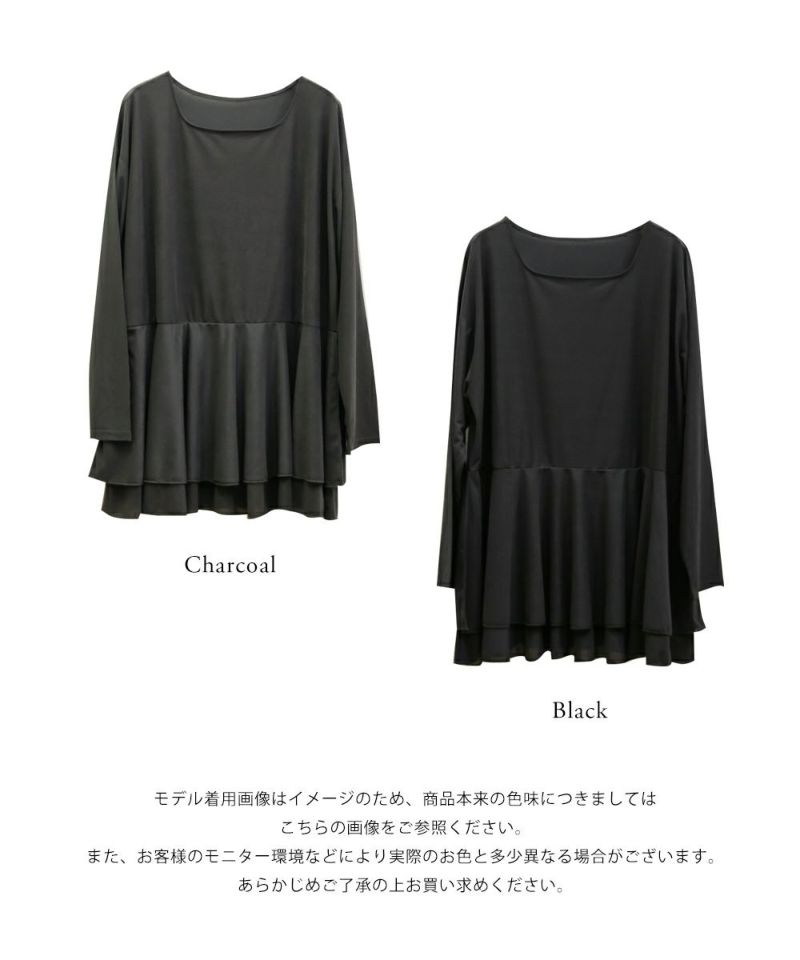 裾フリル シアー ストレッチ カットソー チュニック 無地 透け感 3L 4L 5L クレット 裾フリルシアーストレッチカットソー