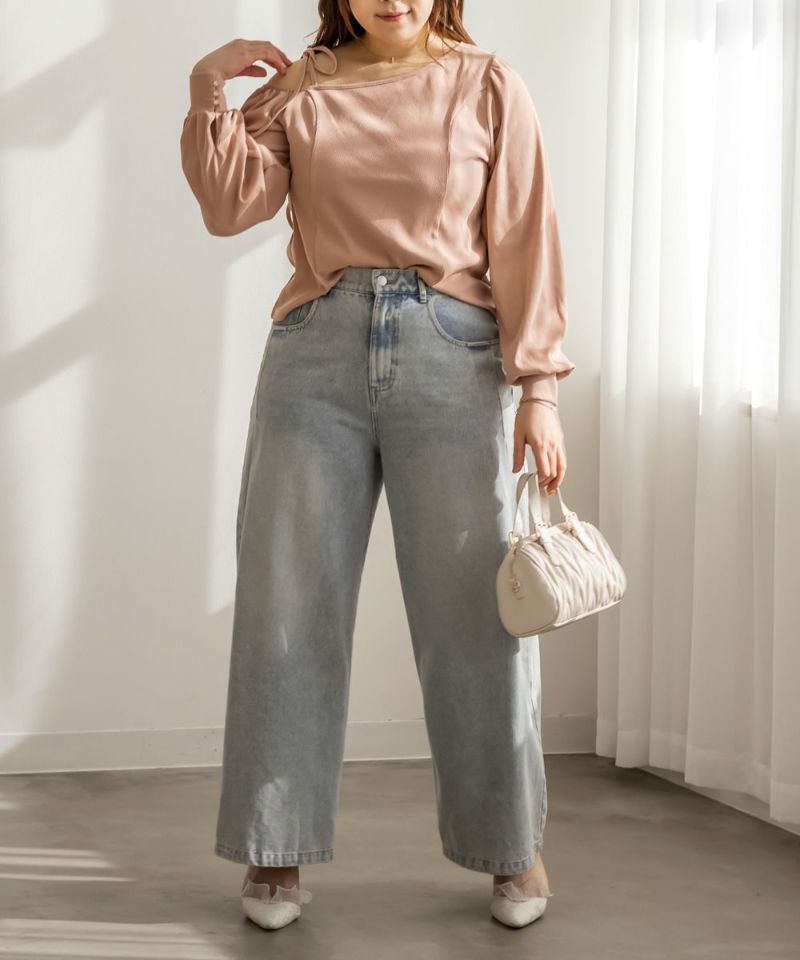 LLサイズを着用しました!生地自体も伸びがあり、窮屈感は特に無く着用出来ました。ワンショルデザインだったのでピッタリで着用したほうが綺麗に着れそうでした。 野暮ったくならず洗練された印象になるディティールがポイントで、肩はさりげないリボンがついていて可愛いです◎リブカットソーでラフなのに女っぽさ満点の1枚で、ナチュラルな肌見せが上品な雰囲気の1枚です。さらっとした生地感なので、春~秋と長いシーズンお使いいただけます!