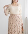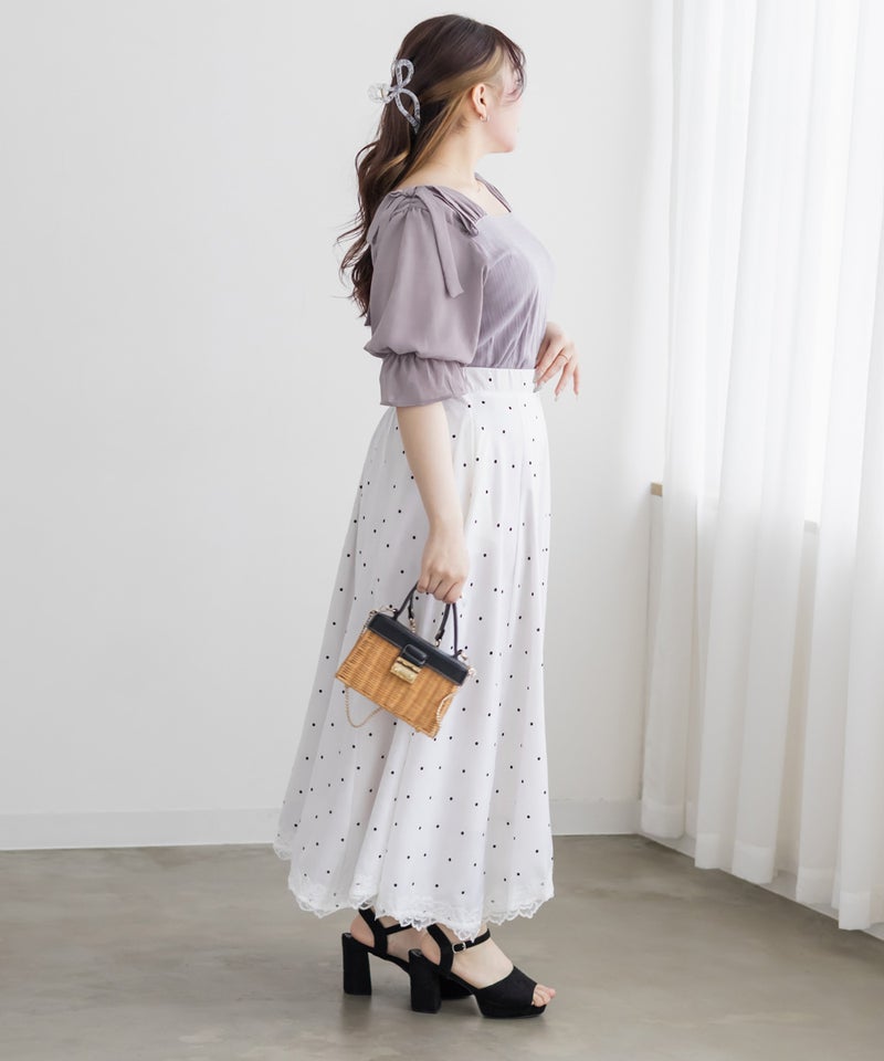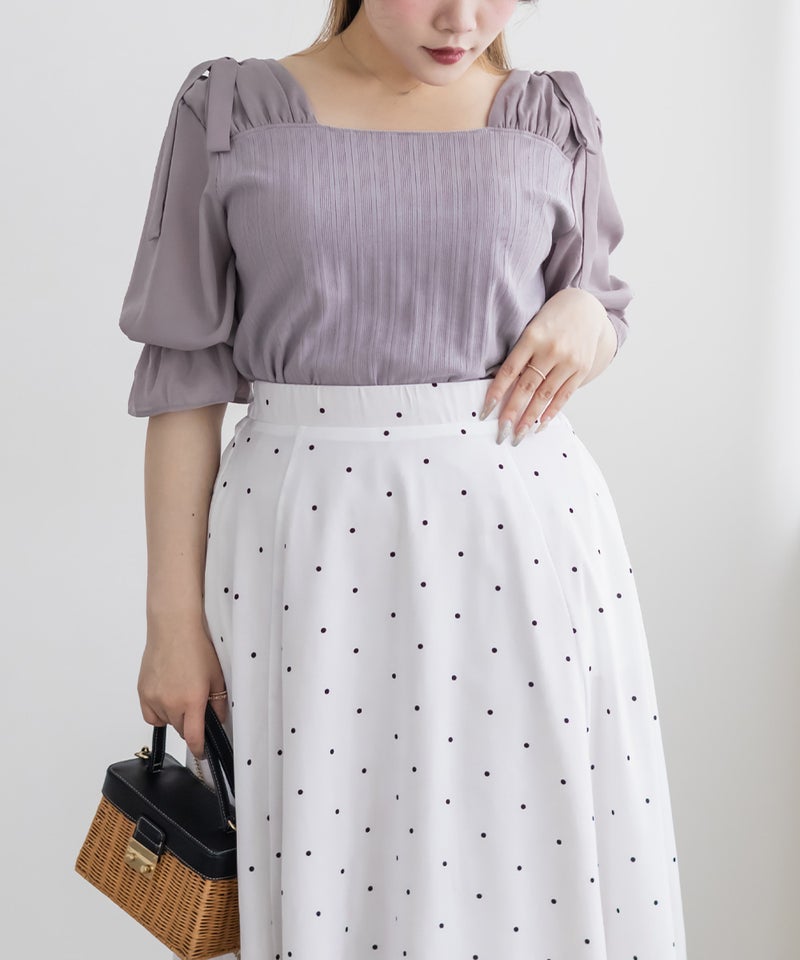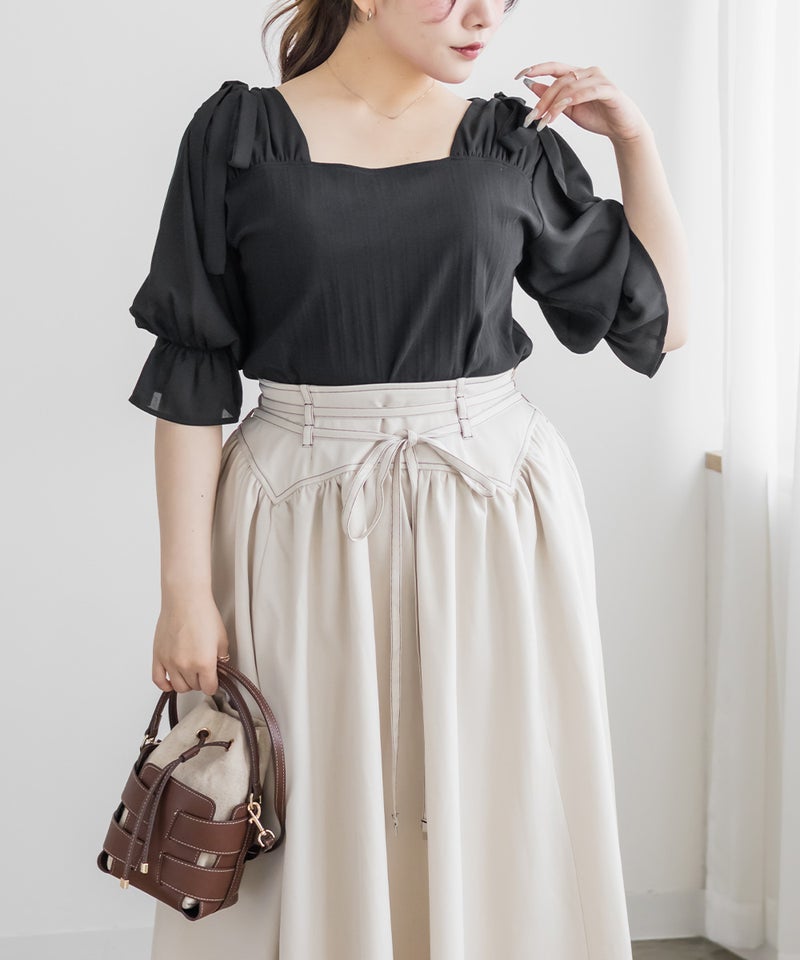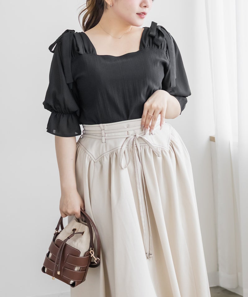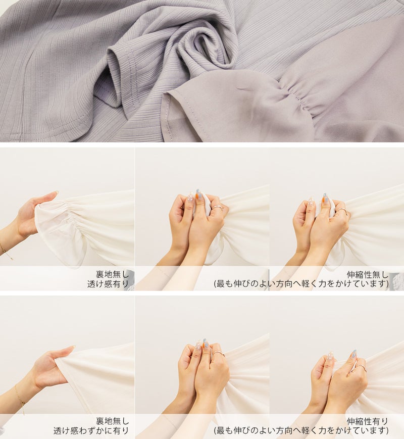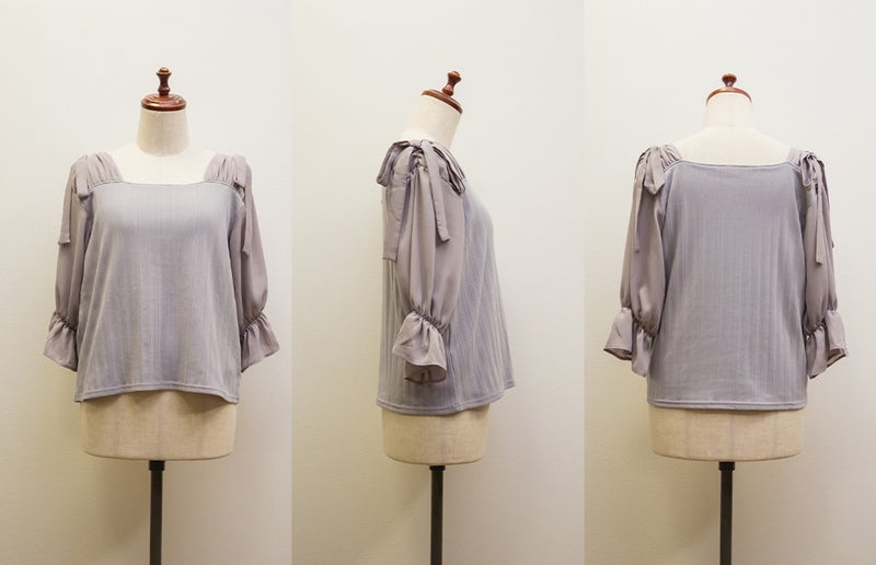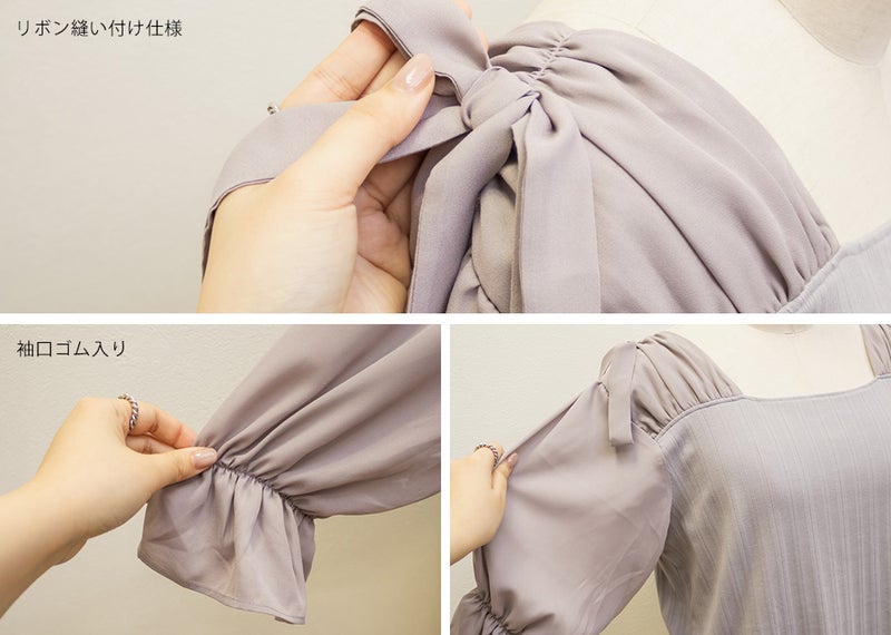 【design】心地よさと着映えを両立したフェミニントップス。ラフに着られて、自然と華やぐ一枚。スクエアネックと肩のリボンで、顔まわりをすっきりと。ふんわりとしたキャンディースリーブが、二の腕から肘までやさしくカバー。さりげなくスタイルアップを叶えてくれます。【material】身頃部分は細かいピッチの伸縮性のあるリブ素材で、デコルテ/袖/リボンは上品な透け感・落ち感のある伸縮性のないジョーゼット生地。
