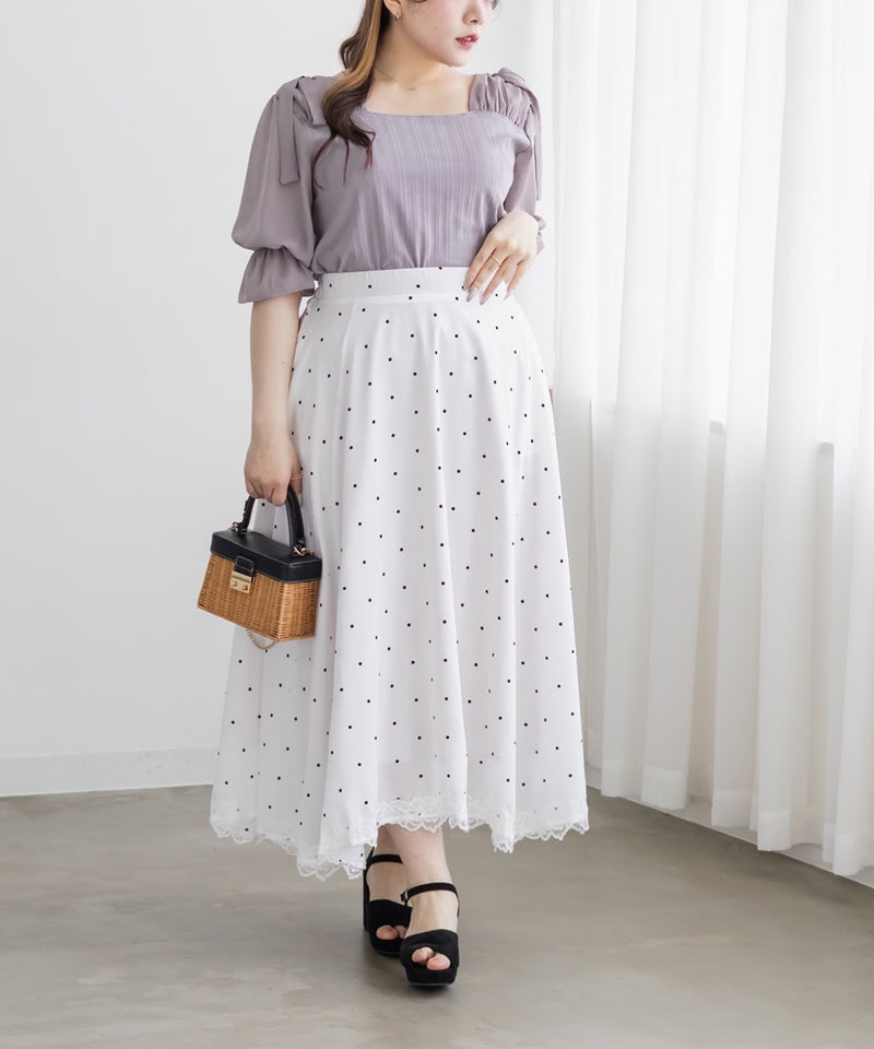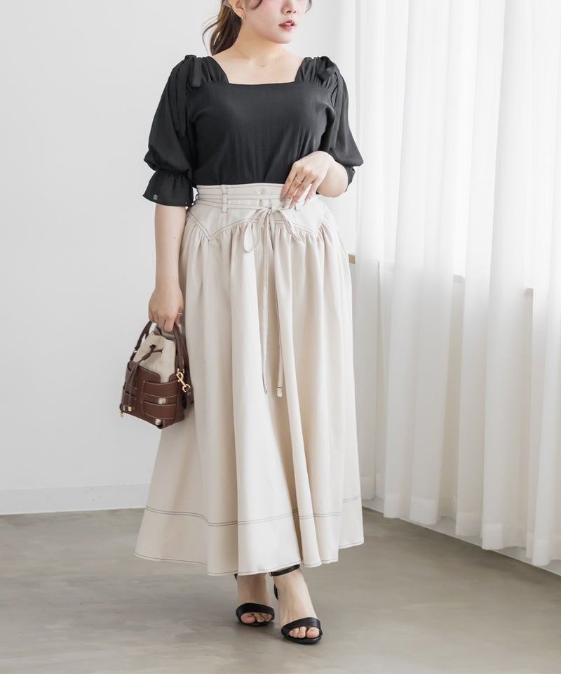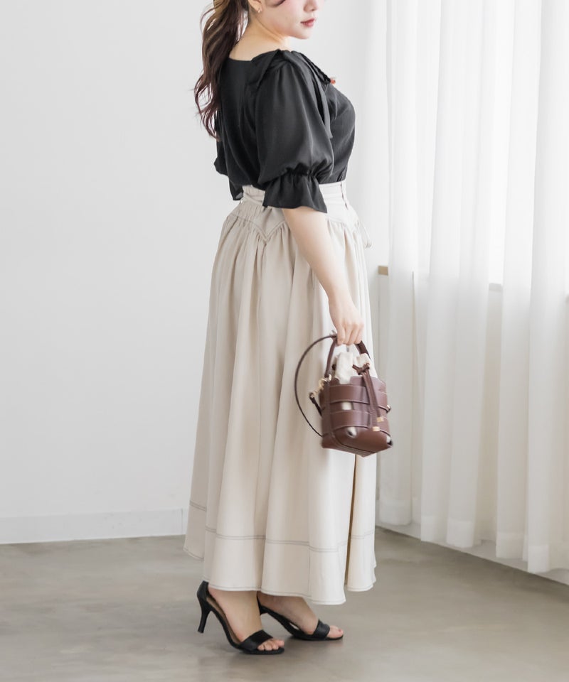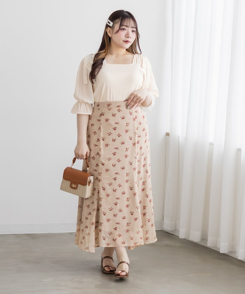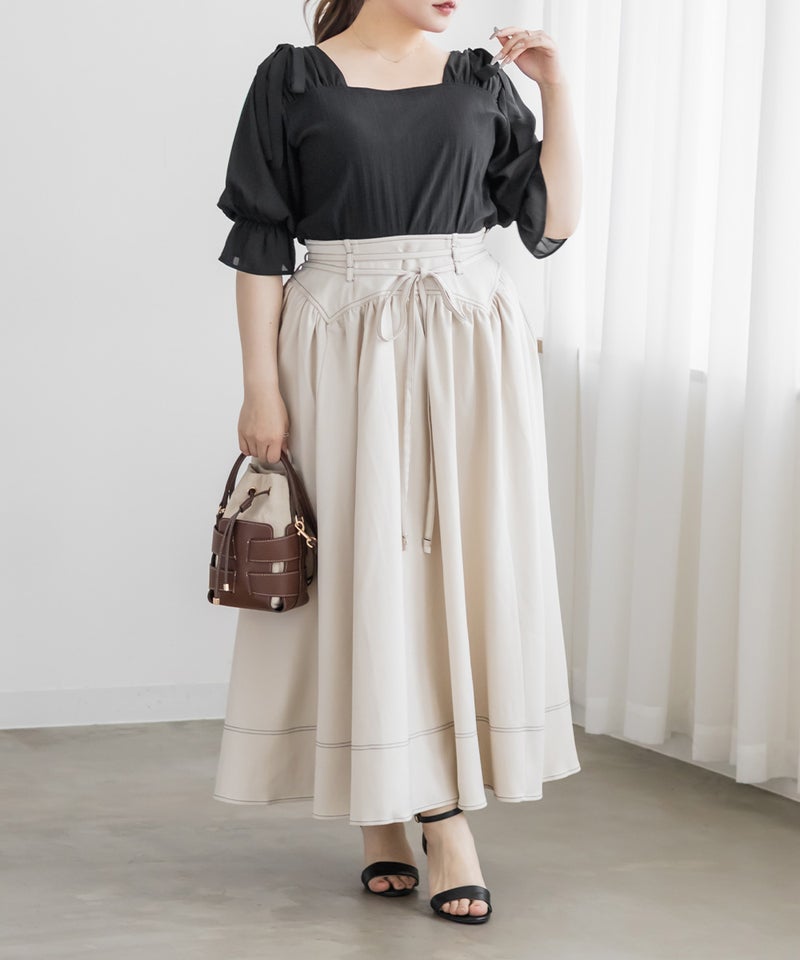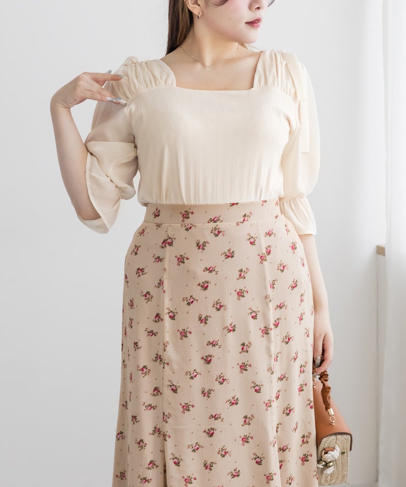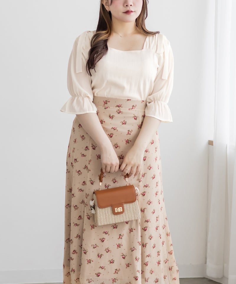 3Lサイズを着てみて丁度いいサイズでした。見頃は女性らしいランダムリブカットソー、袖がシアー感のある生地になっていてカジュアルになりすぎずにフェミニンな印象のアイテムです!スカートにもパンツにも合わせやすく、真夏でも涼しく着られそうです◎肩にリボンがついているのもガーリーで可愛く、お出かけにもおすすめの1枚です!