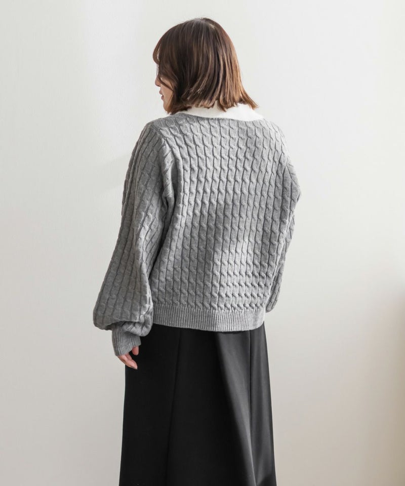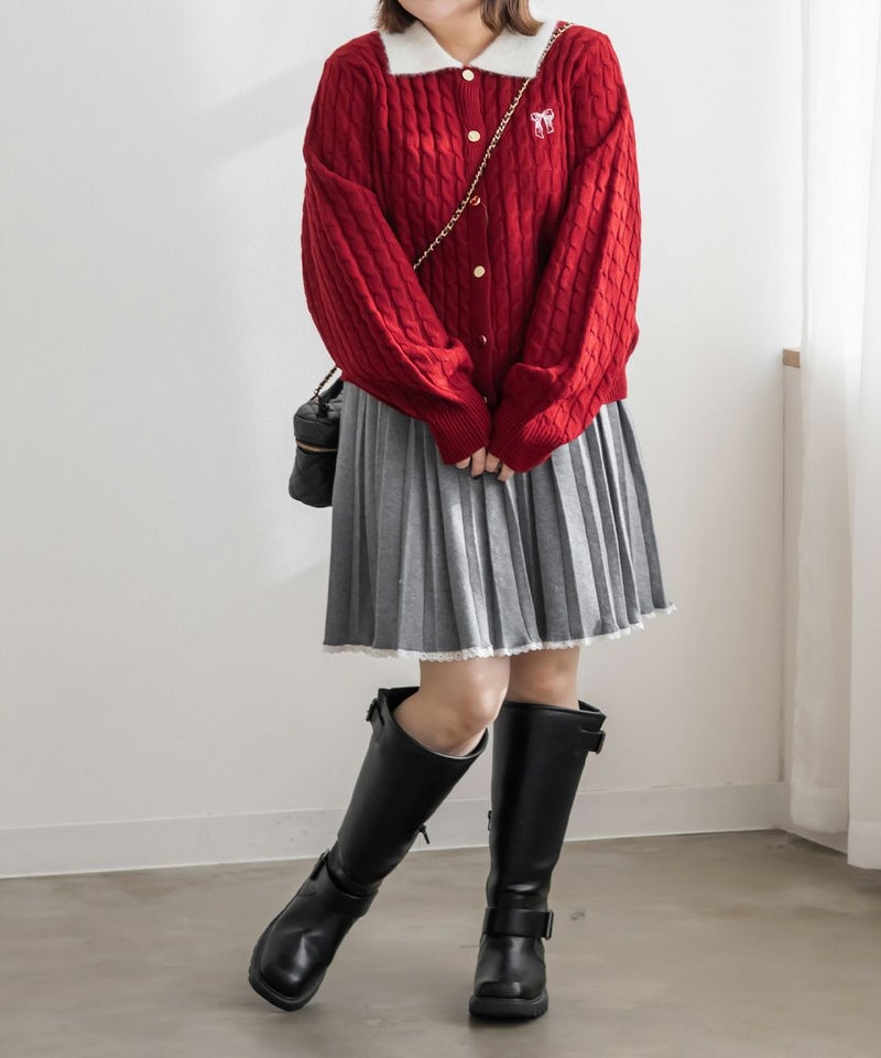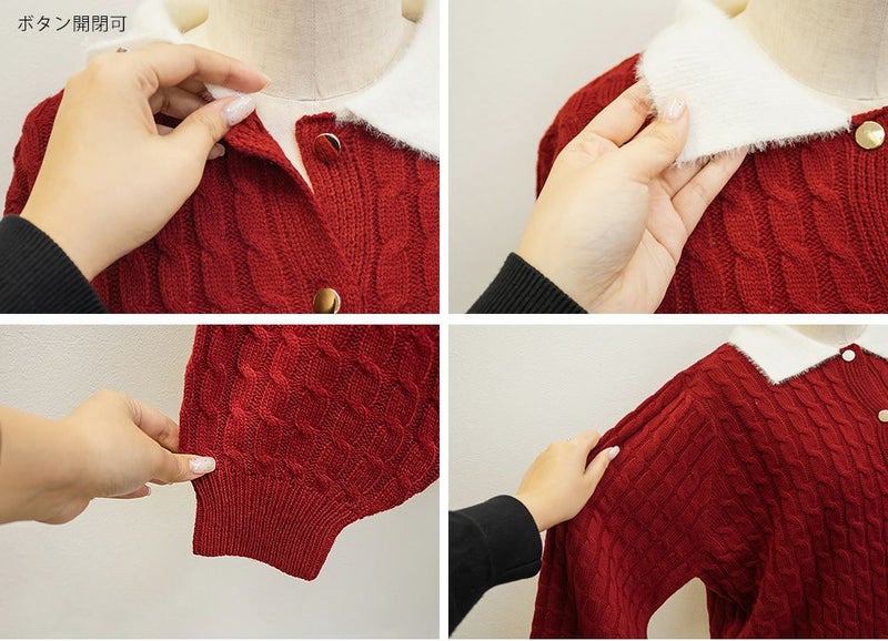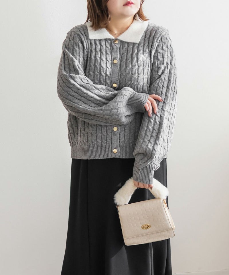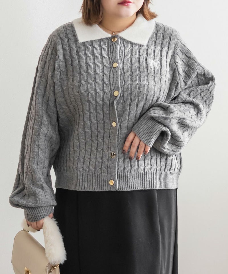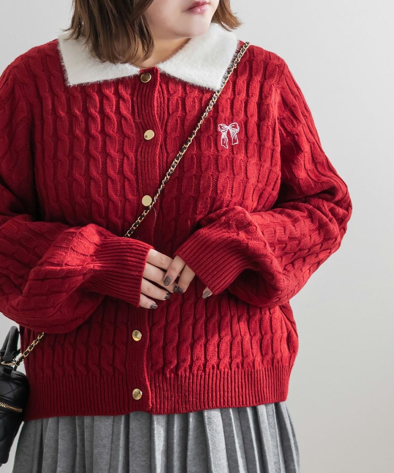 3Lサイズを着用しました。伸びのいいニットで楽に着られました。メリハリのあるケーブル編みで可愛いです◎ 襟付きデザインとゴールドボタンがトレンド感をプラスしてくれて、 ガーリーに着られるところがお気に入りです♪リボン刺繍のワンポイントも付いていてコーデのポイントになるアイテムです!これからの季節、デートやお出かけなどにおすすめです!