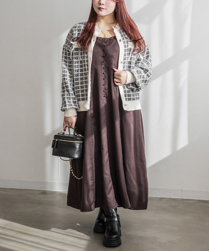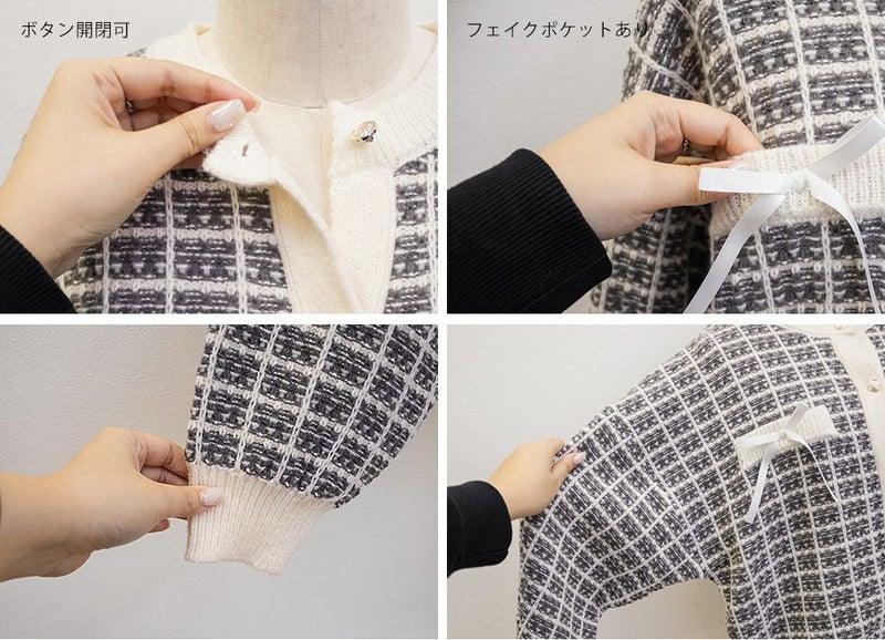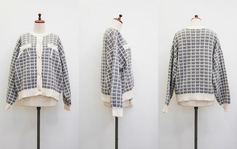 3Lサイズを着用してちょうどいいサイズ感でした。ツイード風の高見えするニット素材になっているので、上品に着こなすことができます◎ツイードっぽく見えるけどニットなので、伸縮性もありラクに着られました!トップスとしても羽織としても長いシーズン着回しできるポイントでもあります!凹凸のある素材感なのでボディラインも拾いづらいです!程よくゆとりがありコンパクトな印象に着られるシルエットでアイテムなら安心感して着ることができます。胸元にはリボンがついていてフェミニンに着こなせます!