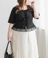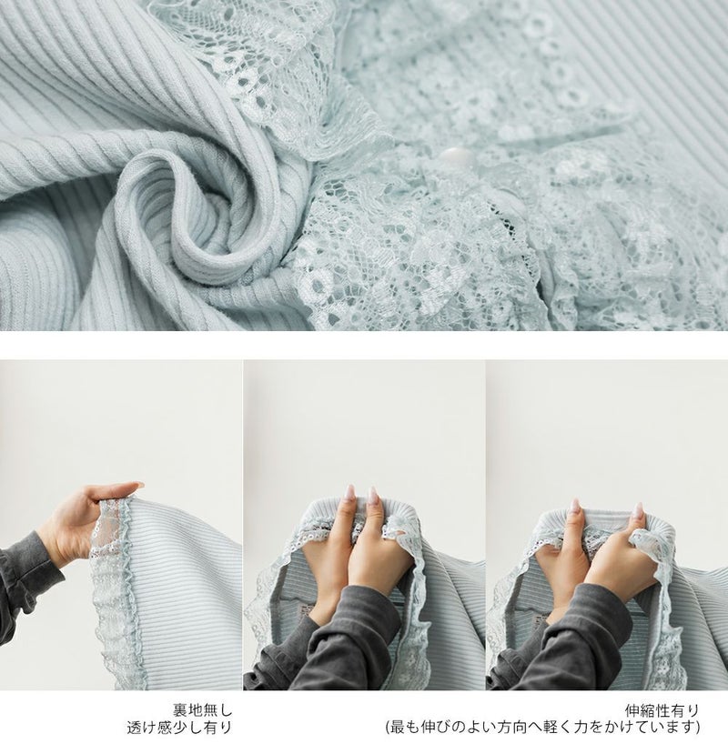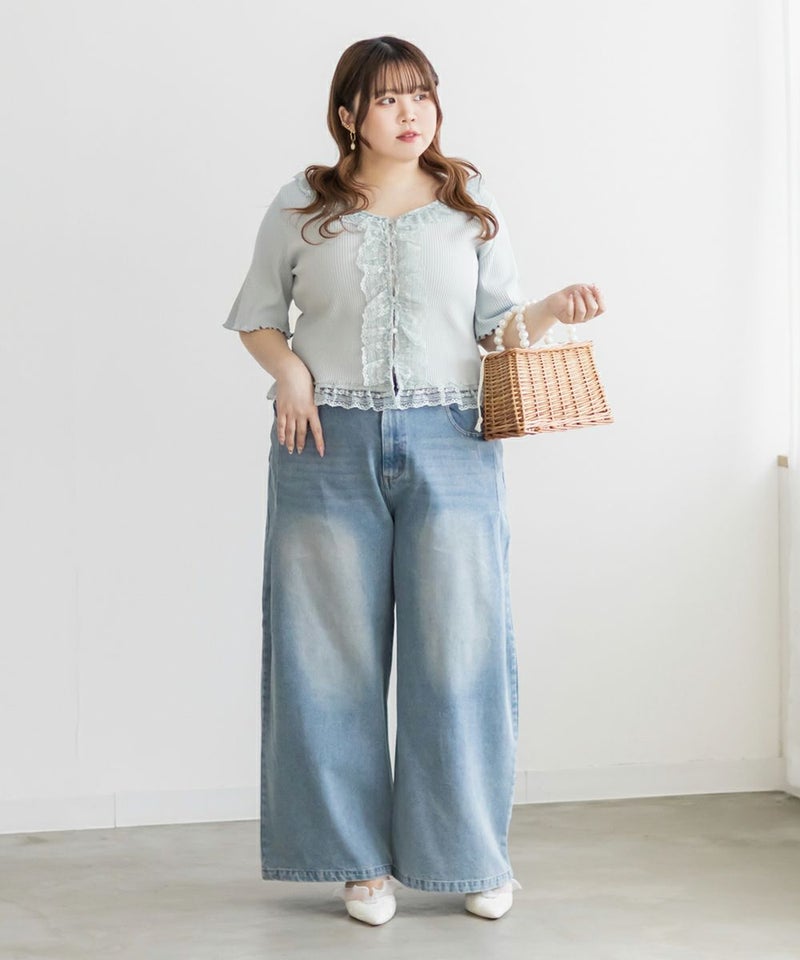 3Lサイズを着用しましたが、程よく体に沿うシルエットで着心地もちょうどいいです◎リブ素材なので伸縮性があり、動きやすさも抜群♪フロントのフリルとレースのコンビが華やかで、甘すぎず大人可愛い印象に。タックインせずに着られる着丈で短すぎずパンツでもスカートでも合わせやすいです。裾のボタンを少し開けて着用すると今っぽい抜け感が出て旬の着こなしになります!キャミやワンピの羽織りとしてもぴったりで、コーデにフェミニンさをプラスしてくれます