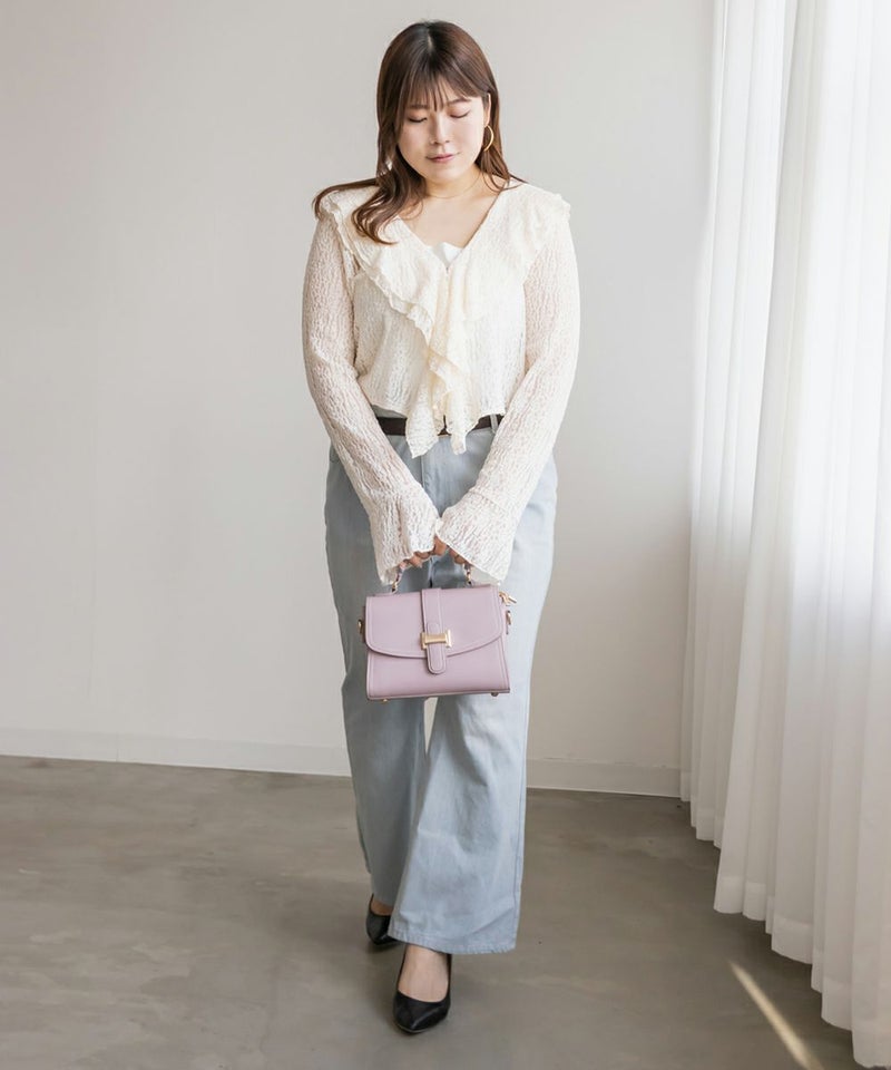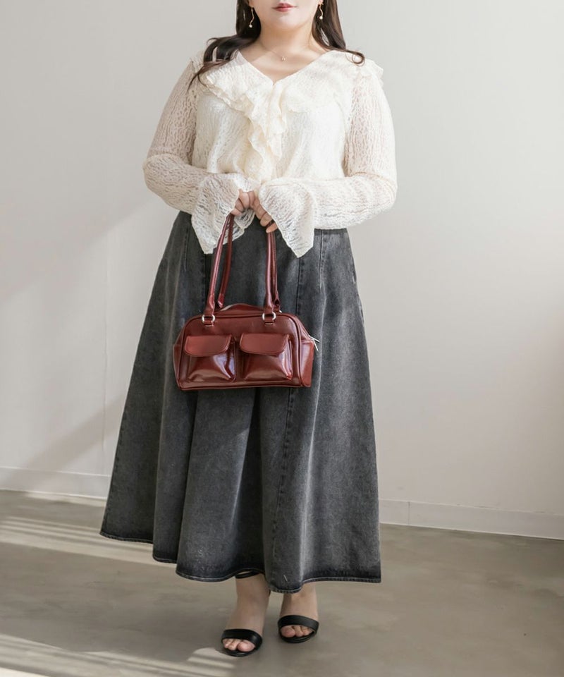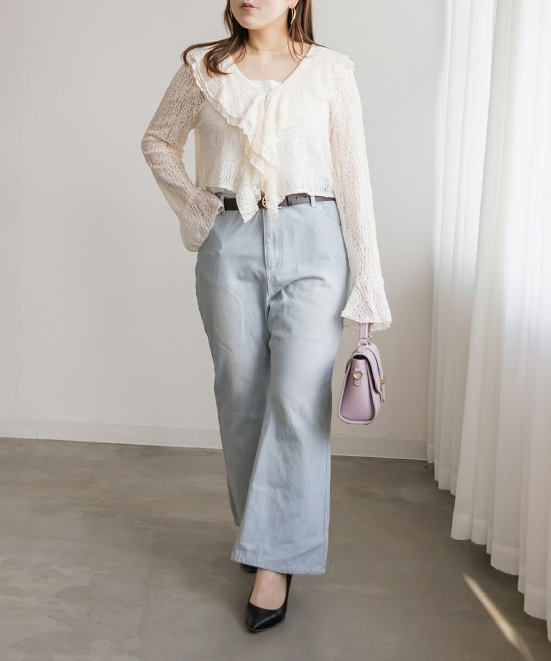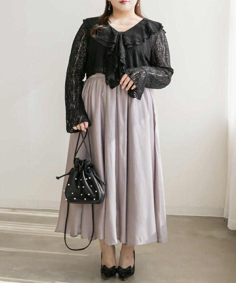 3Lサイズを着用して、ちょうどいいサイズ感でした♪ 伸縮性のあるシャーリング生地で身体にフィットしながらも、窮屈感がなく快適な着心地です。フロントのたっぷりとしたフリルが華やかで、顔まわりを華やかに見せてくれるのがポイント◎ 袖口はフレアスリーブになっていて、手元がふんわり広がるシルエットが女性らしい印象に♪ 1枚で主役級のデザインなので、シンプルなボトムスと合わせるだけでおしゃれに決まります。デニムやスカートと合わせて甘辛MIXコーデも楽しめる一枚です。
