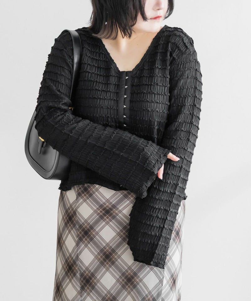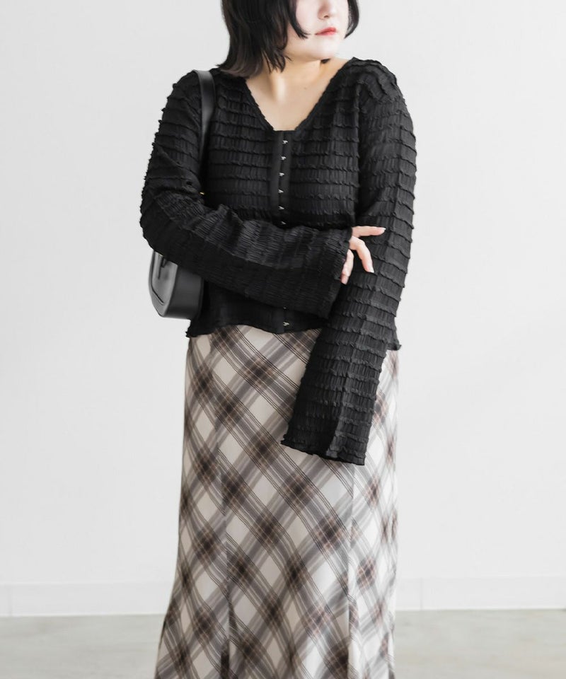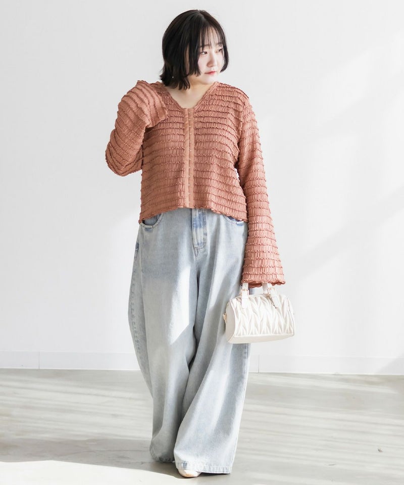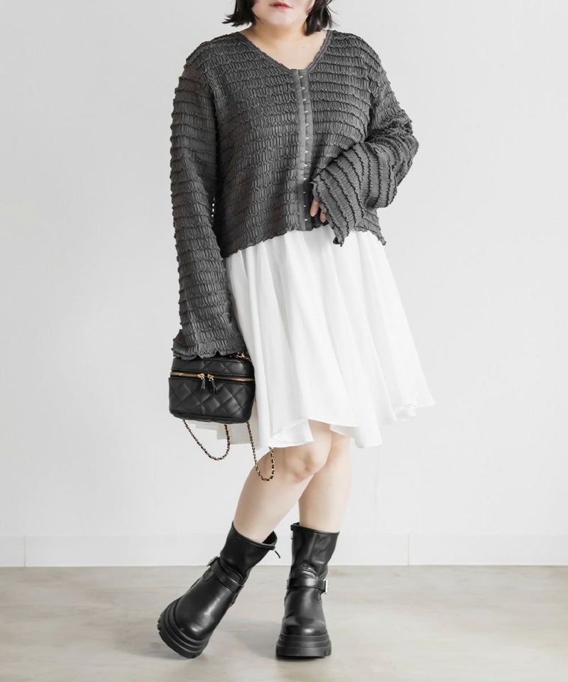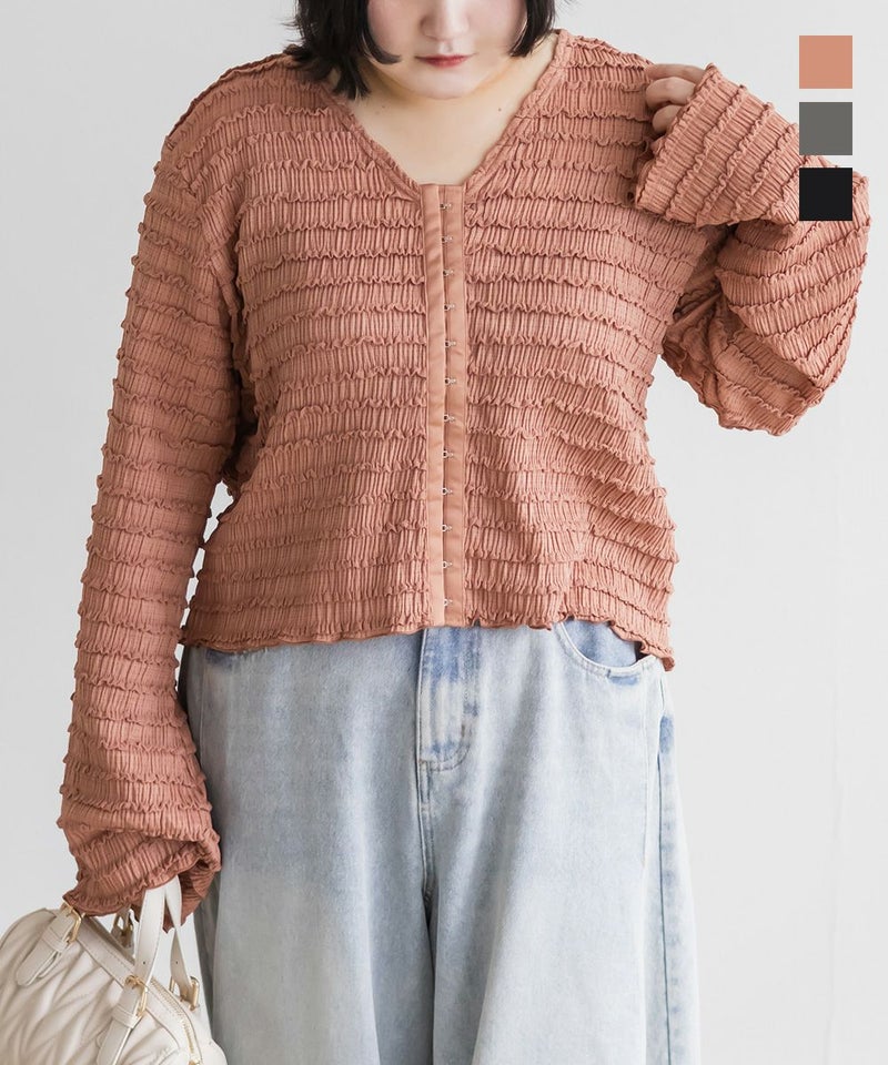 3Lサイズを着用してちょうどいいサイズ感でした。すっきりシルエットのLLサイズを着て、トップスですがピタッとせず程よくゆとりを持って着られました。軽くて伸びある生地で窮屈感なく着られました!フロントのホックが今っぽいデザインで、縦のラインが強調出来て着やせして見えます!ネックラインはVネックに綺麗に開いていて、詰まった印象が無くすっきり見えするのが嬉しいです!生地がポコポコしていて、大人カジュアルにスタイリングできるデザインになっています◎丈感も絶妙でインしなくてもコーデしやすいのもポイントです!秋~春とながく使えるトップスなのであると便利な1枚です!