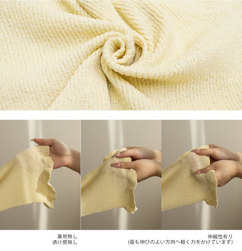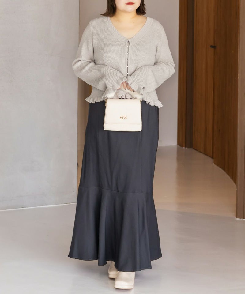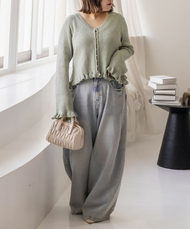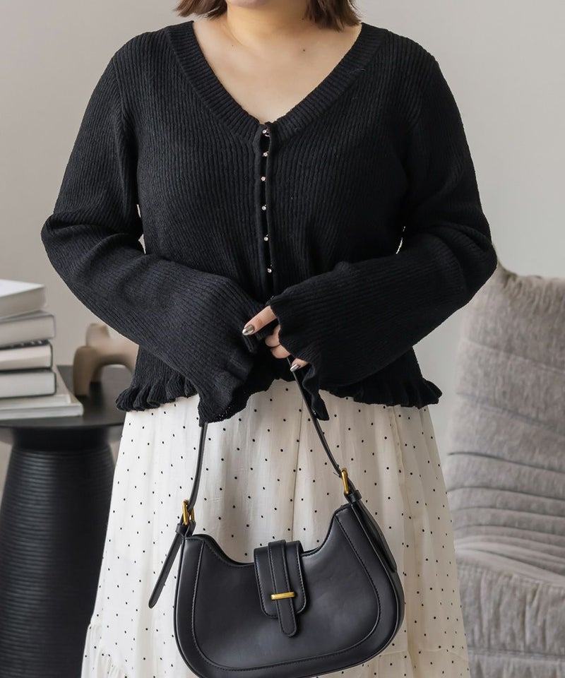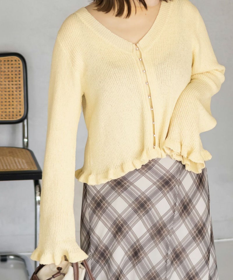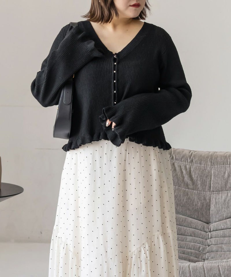 LLサイズを着用して着心地はちょうどいいです!軽やかでさらっとした肌触りのニット素材で、季節を問わず快適に着られます。少し透け感があって軽い着心地です。 袖口と裾のフリルデザインがさりげなく女性らしさをプラスしてくれて、シンプルながらも華やかな印象です。フロントはホックになっていて、ビジューがついているのもさりげなく可愛いです! Vネックが顔まわりをすっきり見せてくれるので、着やせ効果も感じられます。 羽織としても、前を閉じてトップス風にも使えるので着回し力抜群! パンツにもスカートにも合わせやすく、オンオフ問わず使える万能アイテムです。