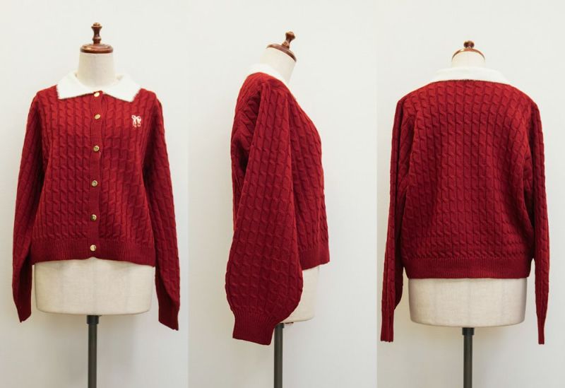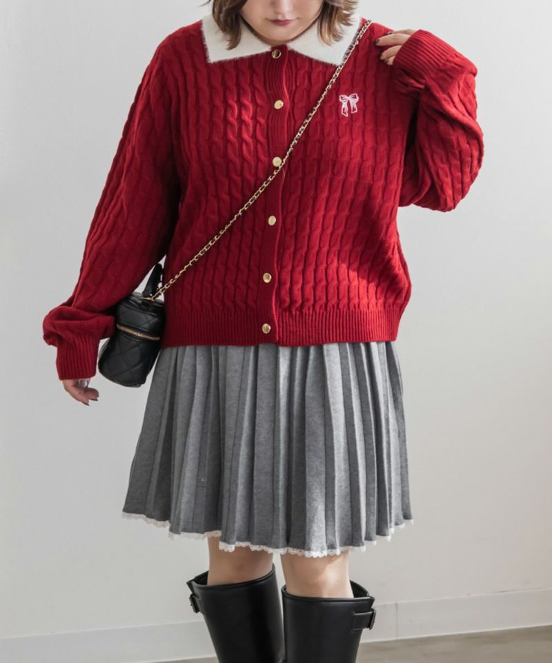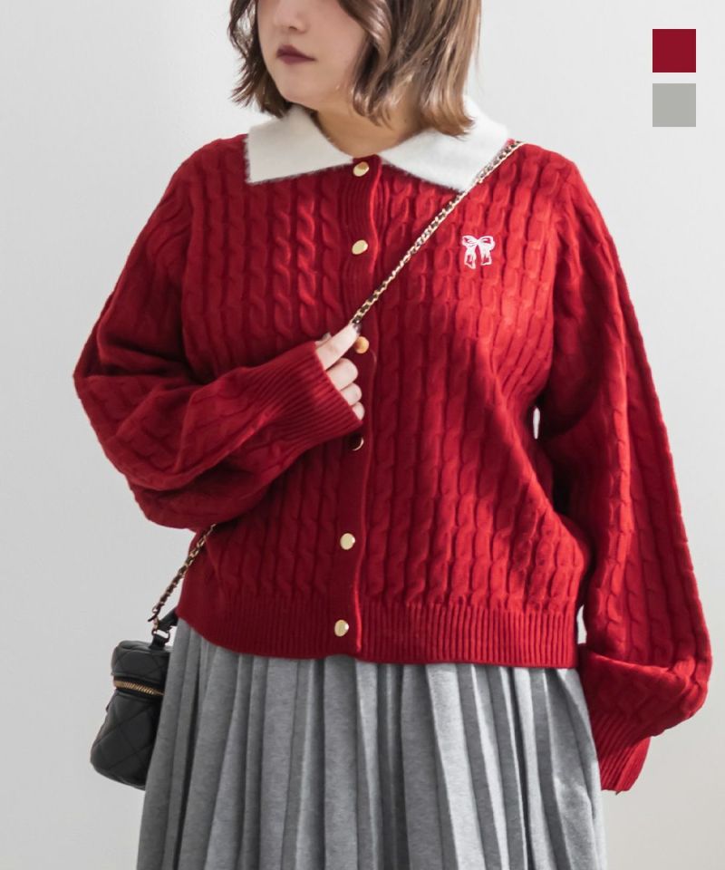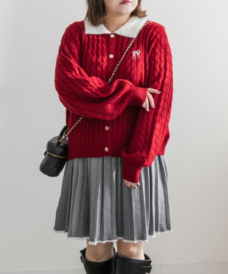 3Lサイズを着用しました。伸びのいいニットで楽に着られました。メリハリのあるケーブル編みで可愛いです◎ 襟付きデザインとゴールドボタンがトレンド感をプラスしてくれて、 ガーリーに着られるところがお気に入りです♪リボン刺繍のワンポイントも付いていてコーデのポイントになるアイテムです!これからの季節、デートやお出かけなどにおすすめです!