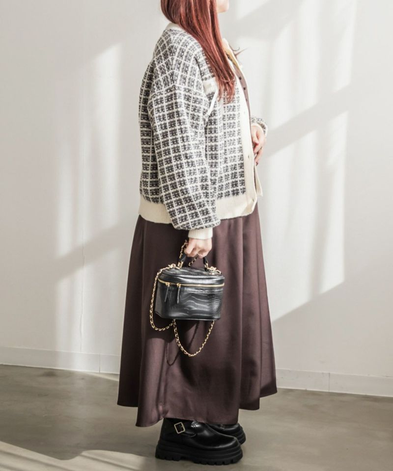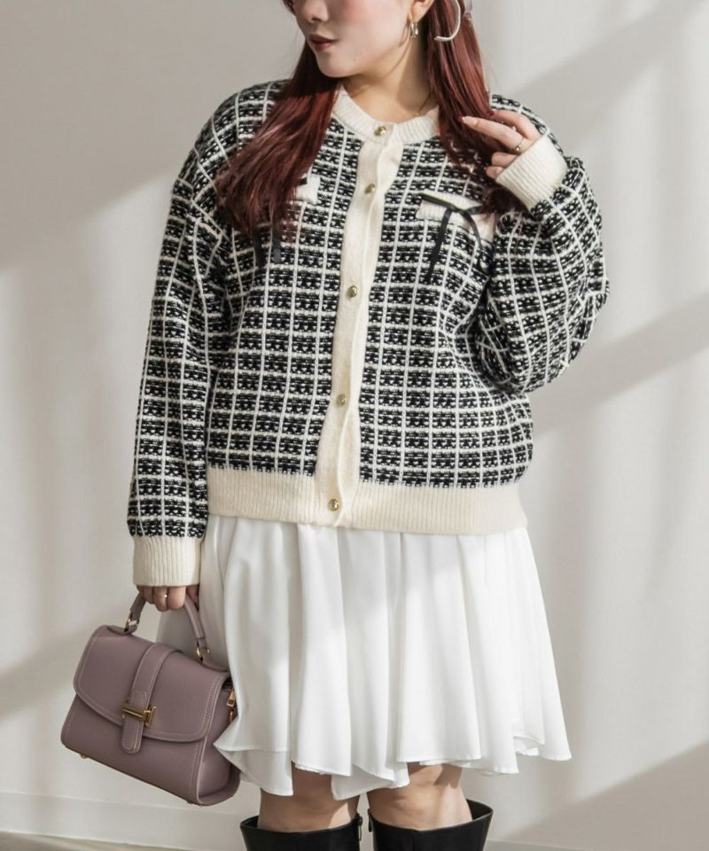 3Lサイズを着用してちょうどいいサイズ感でした。ツイード風の高見えするニット素材になっているので、上品に着こなすことができます◎ツイードっぽく見えるけどニットなので、伸縮性もありラクに着られました!トップスとしても羽織としても長いシーズン着回しできるポイントでもあります!凹凸のある素材感なのでボディラインも拾いづらいです!程よくゆとりがありコンパクトな印象に着られるシルエットでアイテムなら安心感して着ることができます。胸元にはリボンがついていてフェミニンに着こなせます!