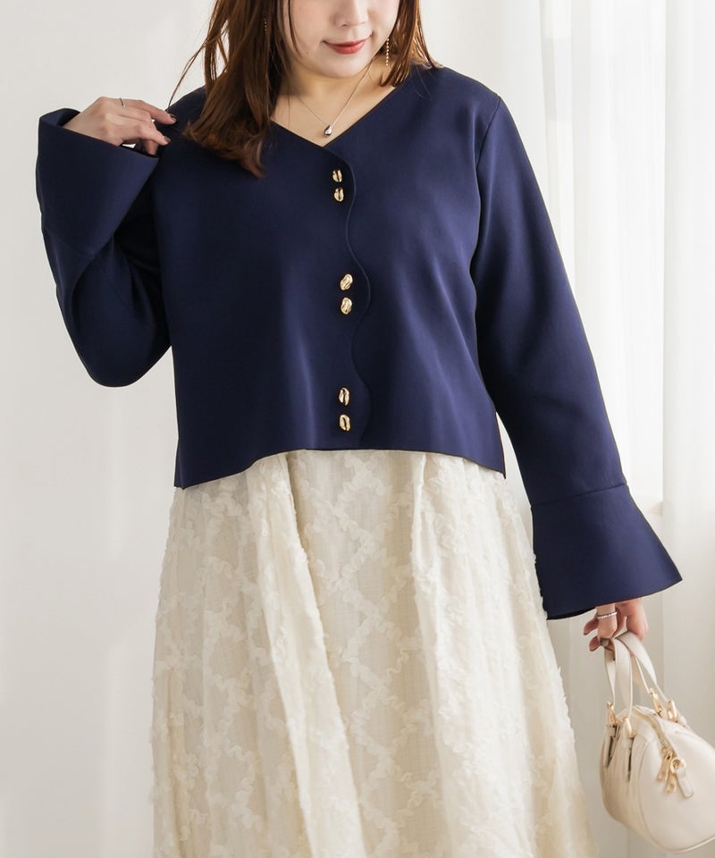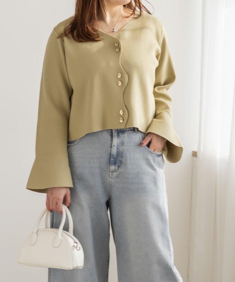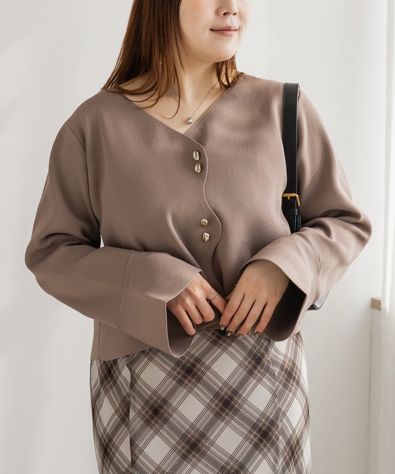 3Lサイズを着用してサイズ感はゆとりがあるのにすっきり見えるシルエットが嬉しいです!ピタッとしすぎないのが嬉しい♪フロントに並んだボタンが、コーデにさりげなく遊び心をプラスしてくれて可愛いです◎なみなみになったデザインも大人可愛いです!シンプルながらもアクセントが効いていて、コーデが華やかになります。生地は程よくハリのあるニットで、チクチクせず肌あたりも心地よかったです。丈感は裾を出してもちょうどよく、パンツにもスカートにもバランスよく合わせられました。