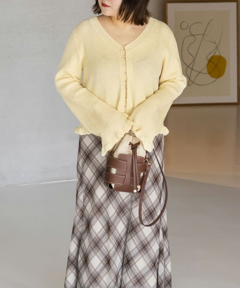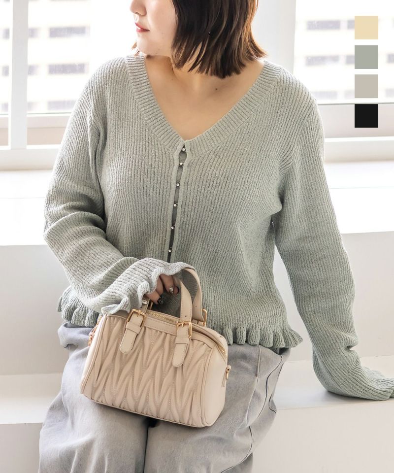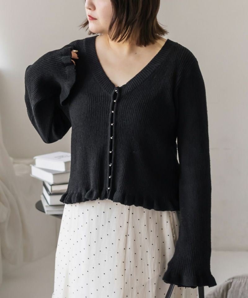 LLサイズを着用して着心地はちょうどいいです!軽やかでさらっとした肌触りのニット素材で、季節を問わず快適に着られます。少し透け感があって軽い着心地です。 袖口と裾のフリルデザインがさりげなく女性らしさをプラスしてくれて、シンプルながらも華やかな印象です。フロントはホックになっていて、ビジューがついているのもさりげなく可愛いです! Vネックが顔まわりをすっきり見せてくれるので、着やせ効果も感じられます。 羽織としても、前を閉じてトップス風にも使えるので着回し力抜群! パンツにもスカートにも合わせやすく、オンオフ問わず使える万能アイテムです。