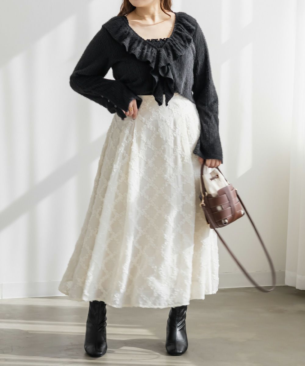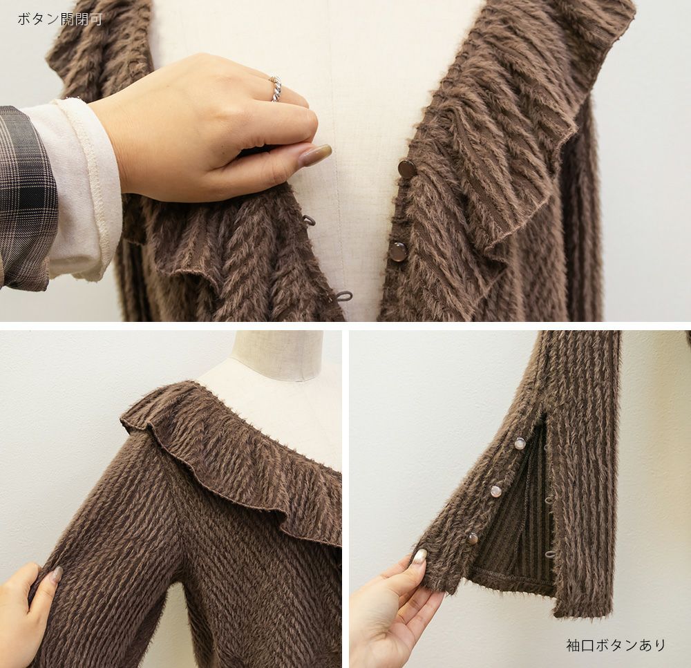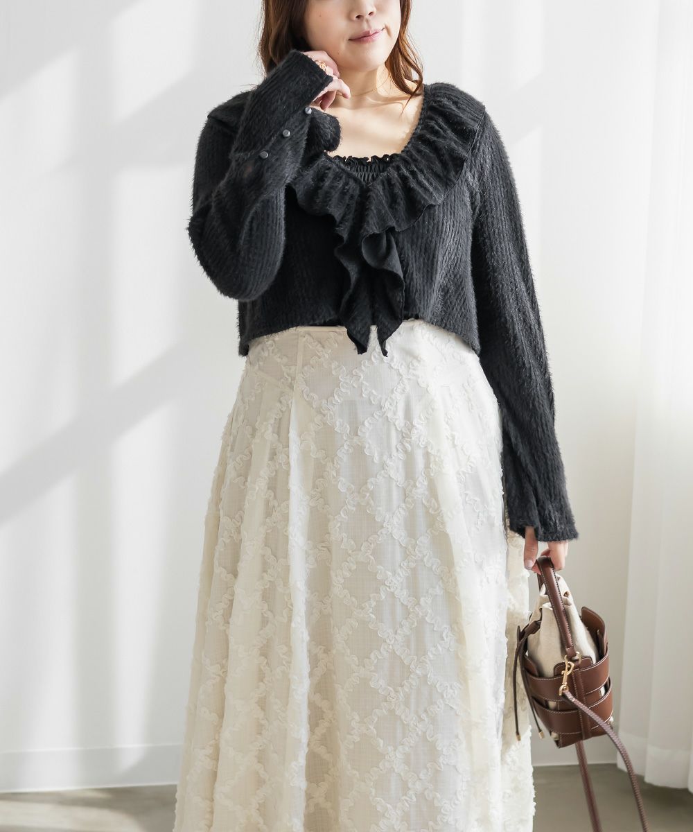 3Lサイズを着てちょうどよく窮屈感のない着心地でした。腕周りもピタッとせず着られました。ふわふわの軽いシャギー素材でトップスとしても、羽織のカーデっぽくもスタイリングできます◎短丈なのでスタイルアップ効果も抜群です!ワンピースやハイウエストのボトムと合わせるのがお勧めです。ネックラインはすっきり開いていて、首元が詰まった印象が無く、すっきりと着られます!顔回りを華やかにするさりげないフリルがフェミニンな雰囲気で可愛いです!寒い時期は中にタートルネックなどをレイヤードすると長くお使いいただけます♪