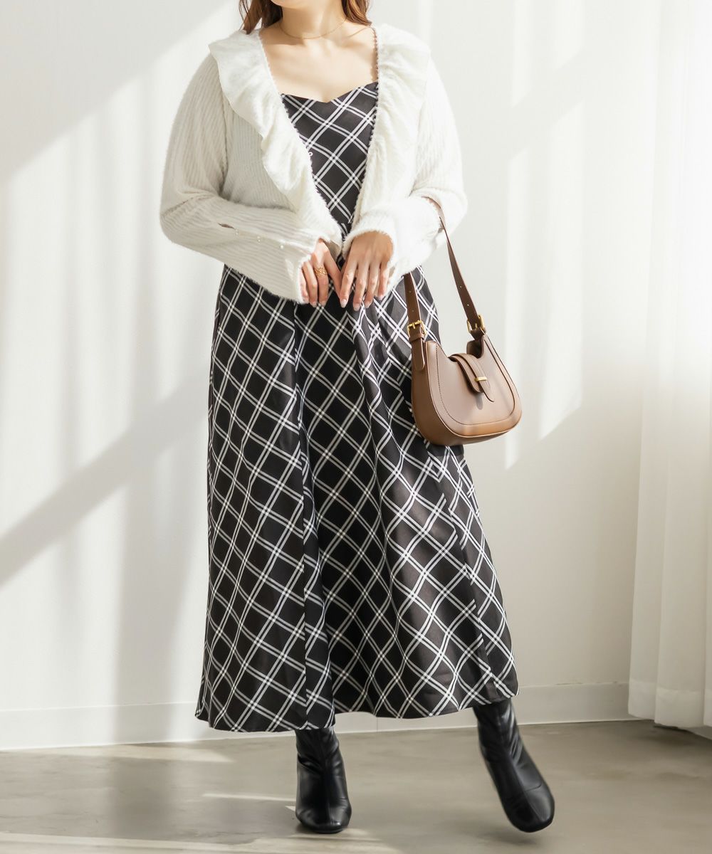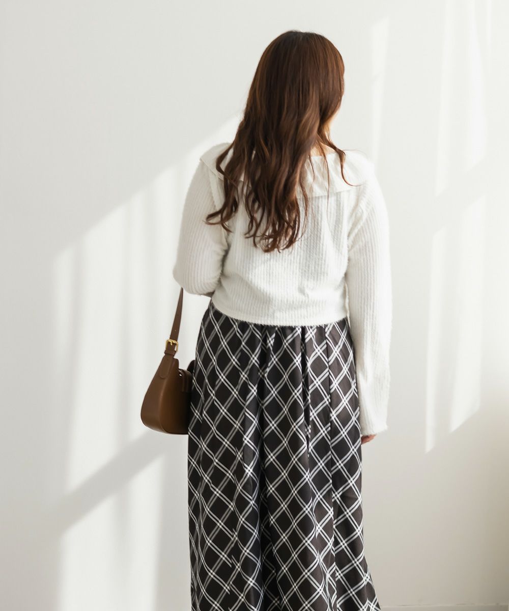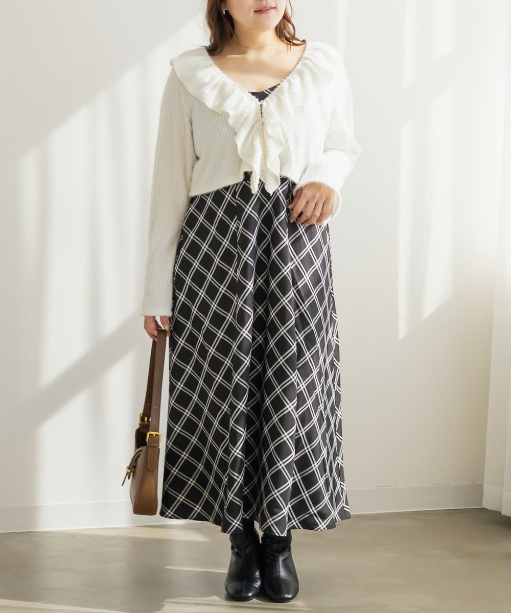 3Lサイズを着てちょうどよく窮屈感のない着心地でした。腕周りもピタッとせず着られました。ふわふわの軽いシャギー素材でトップスとしても、羽織のカーデっぽくもスタイリングできます◎短丈なのでスタイルアップ効果も抜群です!ワンピースやハイウエストのボトムと合わせるのがお勧めです。ネックラインはすっきり開いていて、首元が詰まった印象が無く、すっきりと着られます!顔回りを華やかにするさりげないフリルがフェミニンな雰囲気で可愛いです!寒い時期は中にタートルネックなどをレイヤードすると長くお使いいただけます♪